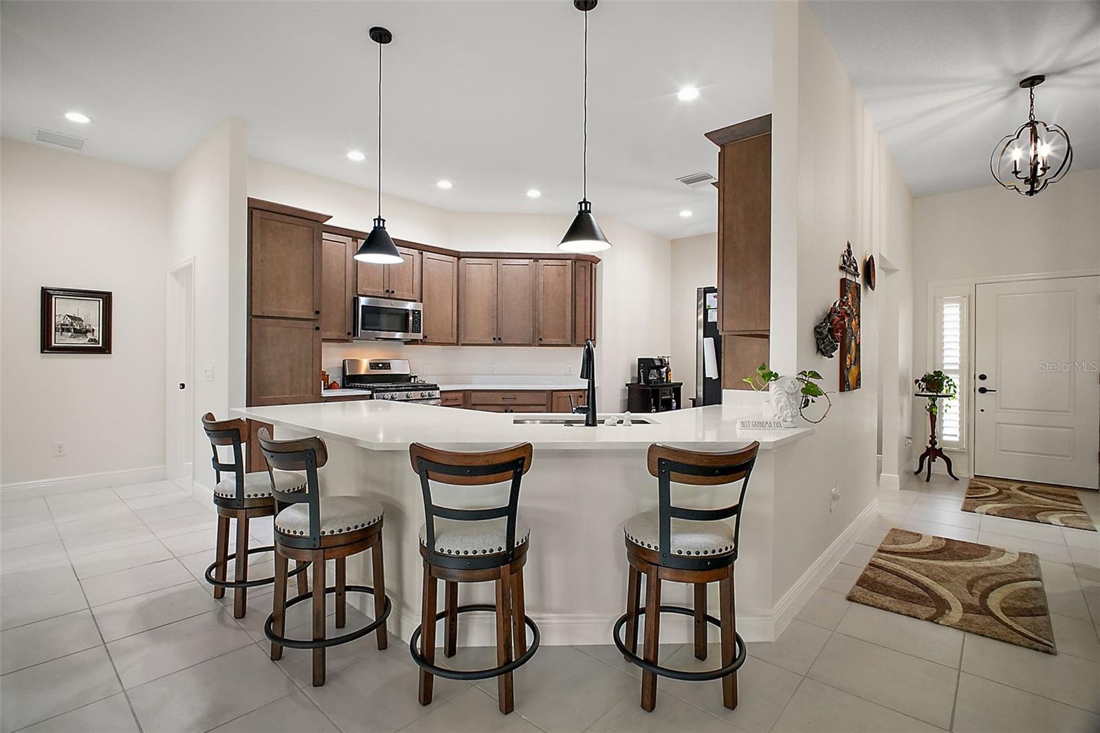 Uma ou mais fotos foram virtualmente encenadas. Uma ou mais fotos) foi virtualmente encenada. Bem-vindo a este modelo Mockingbird Designer lindamente atualizado, localizado a apenas 35 minutos de Orlando, no vilarejo de Lake Denham. Construída em 2023 em um terreno de esquina paisagístico, esta casa de 3 quartos e 2 banheiros oferece 1.954 pés quadrados de área de estar cuidadosamente projetada com piso de cerâmica, tetos altos rebatíveis e uma planta aberta dividida que equilibra o conforto do dia a dia com entretenimento sem esforço. A cozinha possui bancadas de quartzo, armários generosos, balcão para café da manhã e área para refeições bem iluminada. A espaçosa sala de estar inclui venezianas, ventilador de teto, rodapés de 5 polegadas e detalhes arquitetônicos que continuam por toda a casa. A suíte principal é um retiro privado com teto falso, closets duplos e um elegante banheiro privativo que oferece pias duplas de quartzo, box amplo de azulejos em estilo romano e uma sala de cômoda privativa. Dois quartos de hóspedes estão localizados no lado oposto da casa, cada um com armários embutidos e fácil acesso a um banheiro completo com acabamentos de qualidade. Uma das características de destaque é a varanda totalmente fechada de 12 pés por 29 pés, com acabamento em piso de epóxi e uma unidade HVAC mini-split dedicada, oferecendo versatilidade durante todo o ano para relaxamento, entretenimento ou hobbies. As atualizações adicionais incluem uma garagem para dois carros, além de uma garagem separada para carrinhos de golfe, calhas para toda a casa, um sistema de água Pegasus próprio, um protetor contra surtos Eaton e piso de concreto em todas as vagas de garagem. Localizada a apenas uma curta viagem de carrinho de golfe da piscina familiar do Franklin Rec, esta casa oferece acesso conveniente a alguns dos destinos mais populares em The Villages. As comodidades próximas incluem Sawgrass Grove, Ezell Regional Recreation Center, Clifton Cove Putting Course, o próximo centro da cidade de Eastport e o Southern Oaks Championship Golf Course. Esta casa de designer combina acabamentos atualizados, recursos inteligentes e uma localização privilegiada perto de recreação, restaurantes e entretenimento, tornando-a imperdível no Lago Denham.