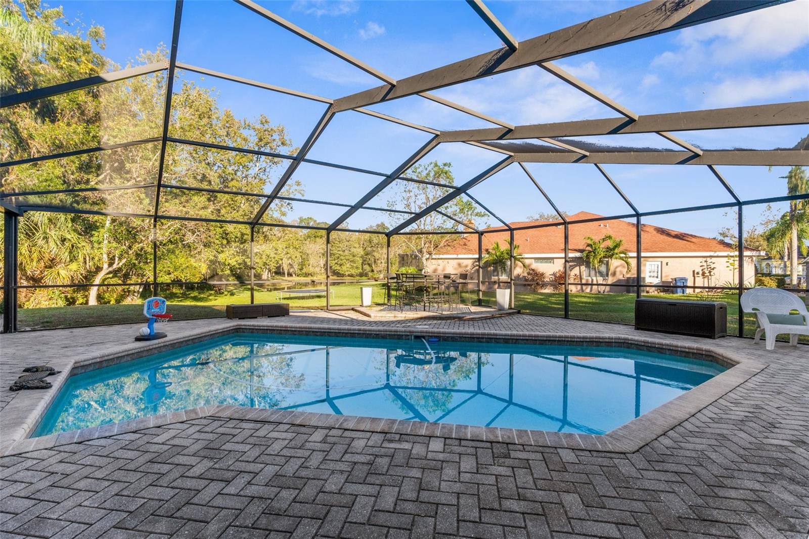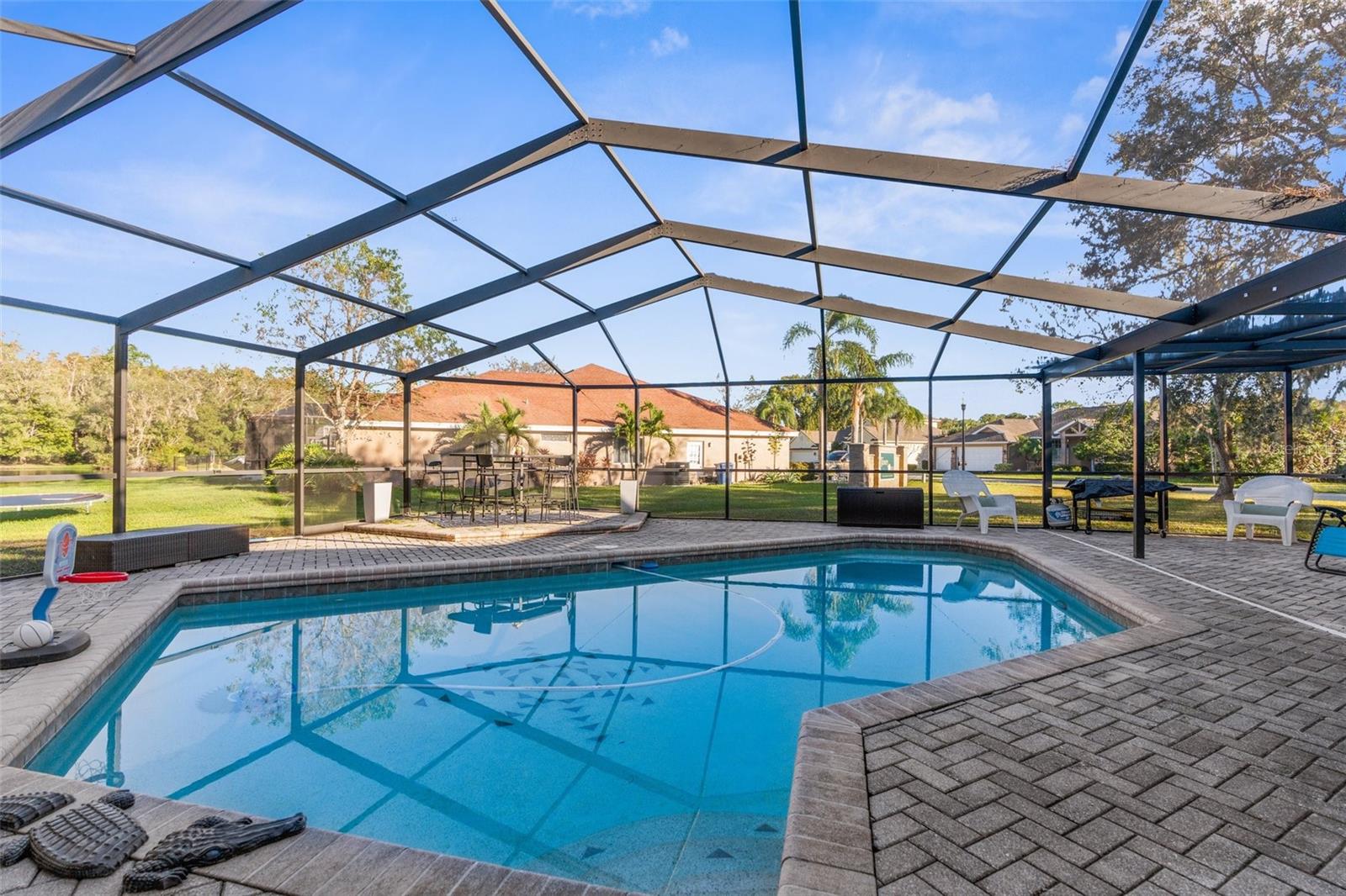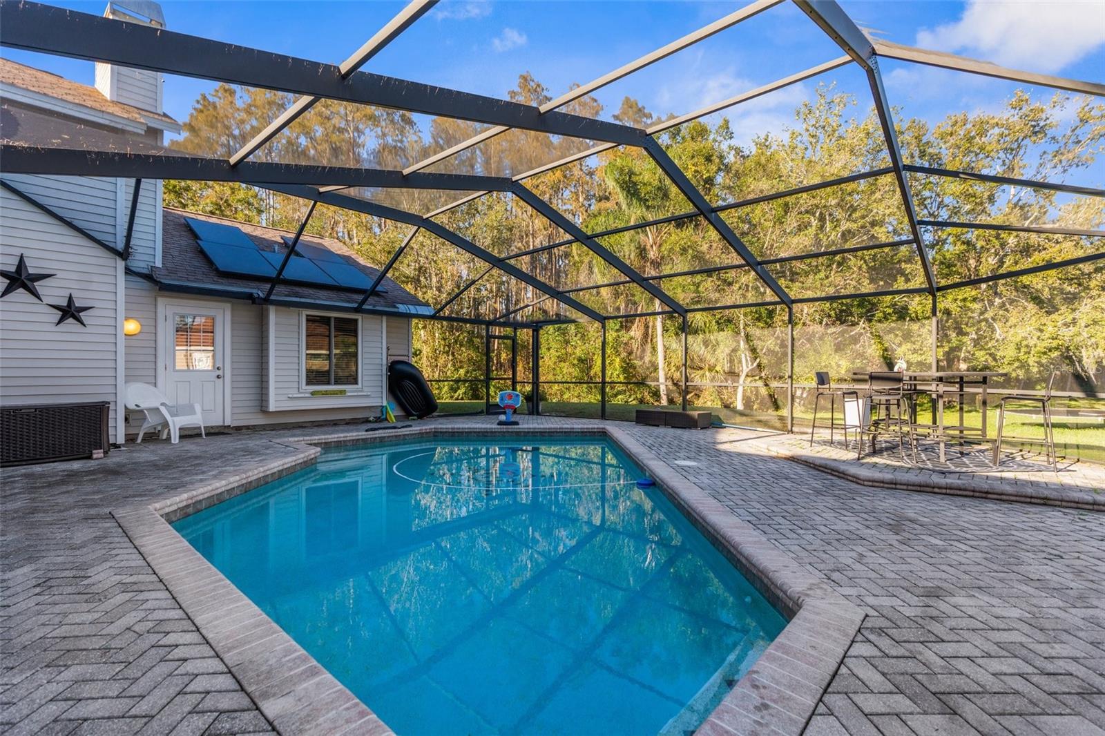Bem-vindo ao lar! Descubra o charme desta bela casa de 4 quartos, 3 banheiros e garagem para 2 carros, situada no coração da adorável comunidade Wyndtree de Trinity. Situada em mais de 1/3 acre, esta propriedade possui um quintal sereno que se abre para um terreno de conservação, oferecendo vistas tranquilas de um lago e a oportunidade de avistar veados, lontras, garças e outros animais selvagens. Esta casa apresenta uma planta aberta convidativa, ideal para entretenimento e vida cotidiana. Ao entrar, você encontrará uma cozinha espaçosa que é o sonho de um chef, completa com bancadas de granito, eletrodomésticos de aço inoxidável, forno de convecção, uma ilha com balcão para café da manhã, uma aconchegante copa e uma grande despensa. Esta área flui perfeitamente para uma sala familiar iluminada, adornada com três claraboias, uma parede de janelas e uma porta deslizante que leva a uma generosa varanda coberta e uma piscina enorme. Esta casa é movida a energia solar, oferecendo energia solar ecológica e sustentável, sem conta de luz mensal - em média ~ US$ 35 por mês!! A luxuosa suíte do proprietário inclui um amplo closet e um banheiro privativo com box amplo, pias duplas com azulejos atualizados e banheira de imersão. Em toda a casa, você encontrará atualizações modernas, incluindo piso antiderrapante, pias, torneiras, espelhos emoldurados e acessórios e ventiladores elegantes. O quintal é um oásis privado, cercado por uma paisagem tropical, tornando-o o refúgio perfeito para relaxar e brincar - ideal para todas as idades, famílias e animais de estimação. Convenientemente localizada perto de lojas, restaurantes, instalações médicas, YMCA, campos de golfe e escolas de primeira linha, esta casa também fica a apenas 30 minutos das melhores praias e parques da região. Não perca a chance de ver esta joia - agende sua exibição hoje mesmo!