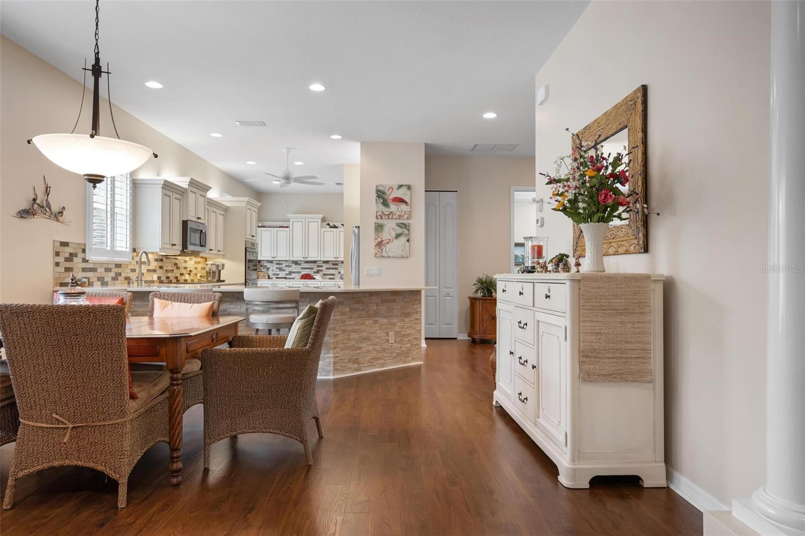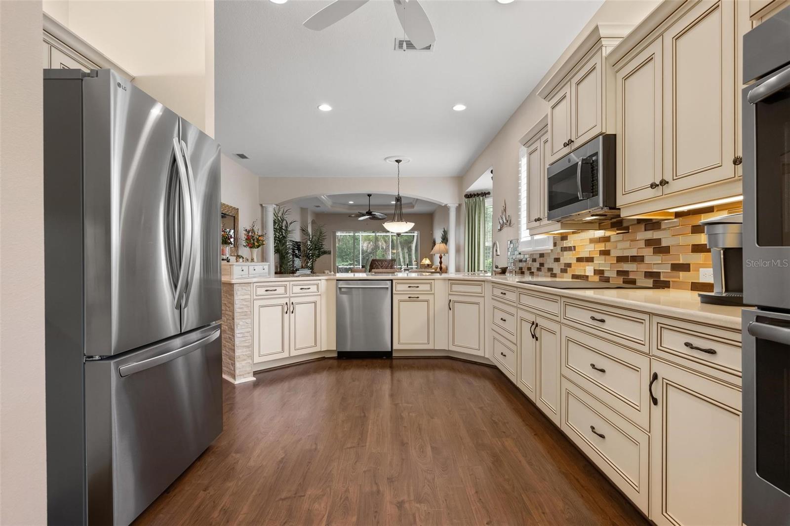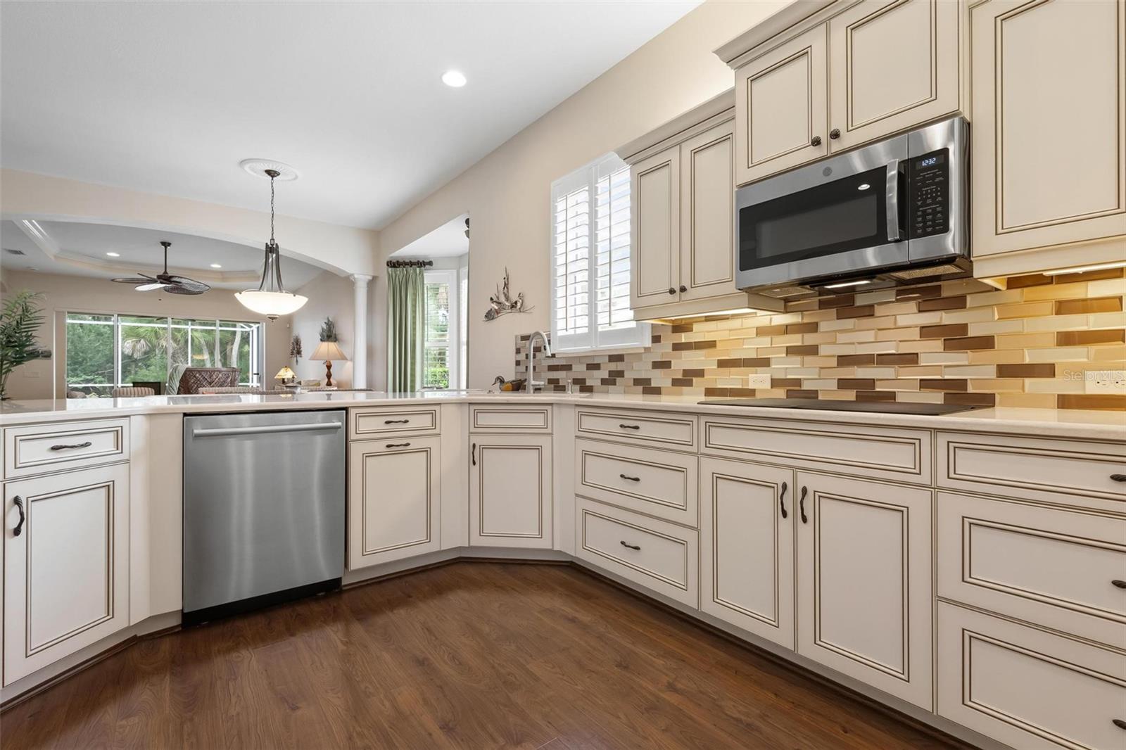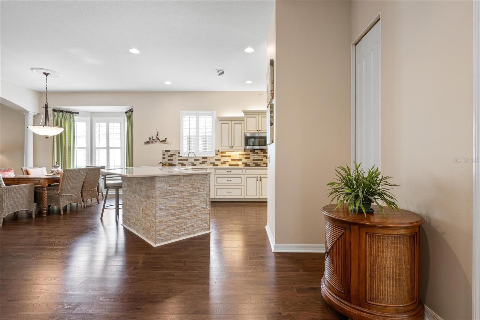 A privacidade atende à conveniência neste retiro oculto. Lindamente cuidados e sem manutenção, esta casa está idealmente posicionada perto do final de um beco sem saída tranquilo no enclave de St. Andrews East no Plantation Golf & Country Club. Projetado com um layout aberto iluminado pelo sol e a cobiçada exposição ao sul, a residência oferece uma mistura perfeita de elegância e conforto. A cozinha é uma peça de exibição com armários em tons de lona acentuados por destaques de cacau, bancadas de quartzo, múltiplos bancos de gavetas profundas, backsplash de ladrilhos de vidro, iluminação subterrânea, pia de granito e aparelhos de aço inoxidável, incluindo um forno de parede dupla e cozinheira de indução. A expansiva sala grande impressiona com um teto bandeja, moldagem por coroa, portas internas de 8 pés e persianas de plantações, todas levando a uma parede de controles deslizantes que se abrem para a generosa Lanai e piscina. Uma área de estar ao ar livre coberta tem vista para a piscina de água salgada extremamente privada e a paisagem exuberante da Flórida além. A luxuosa suíte primária apresenta closetes duplos e um banho de banheiro privativo inspirado em spa com pias duplas e um chuveiro de freio. Esta residência está equipada com excelente proteção contra tempestades, incluindo janelas resistentes a impactos, persianas de acordeão e um sistema de segurança. Destaques adicionais incluem uma garagem acabada, armários de lavanderia extras e um sistema de filtragem de água para casa. Para aqueles que procuram um estilo de vida ativo, o Plantation Golf & Country Club oferece dois campos de golfe, pickleball, tênis, uma piscina de resort com um bar de cabana, um centro de fitness e uma variedade de opções de refeições, todas apoiadas por um vibrante calendário social. Associações opcionais estão disponíveis. Convenientemente localizado a apenas 15 minutos das praias do Gulf, no centro histórico de Veneza, no centro de Wellen Park e compras e refeições abundantes, esta casa combina perfeitamente privacidade, estilo e conveniência.
