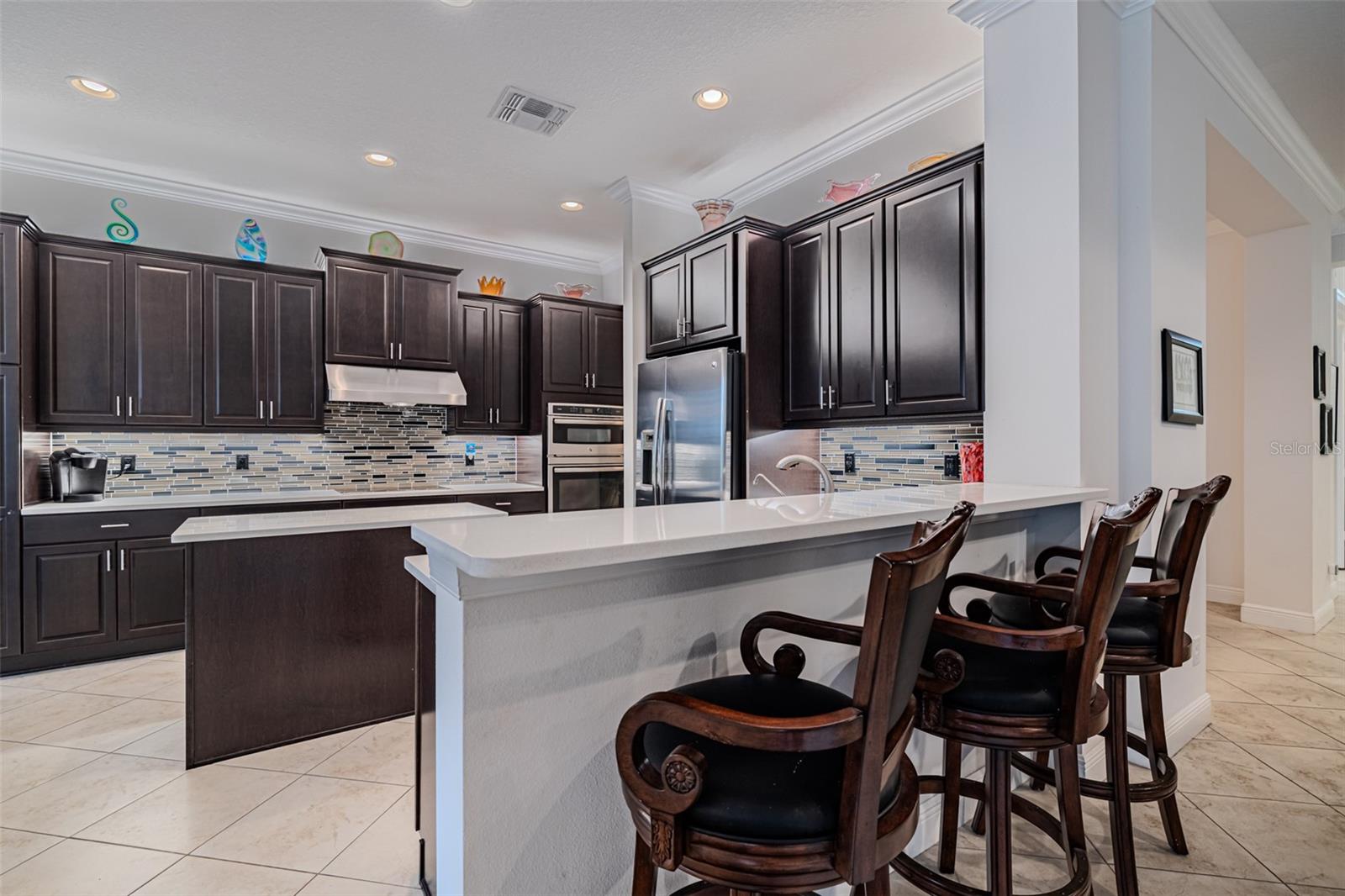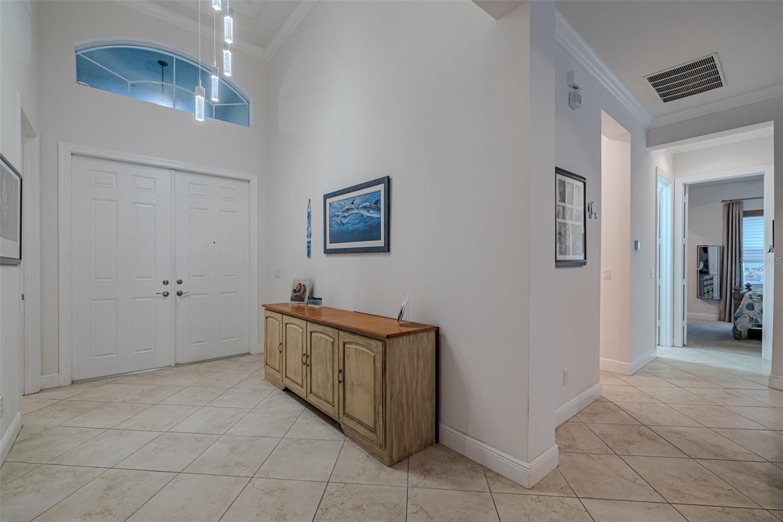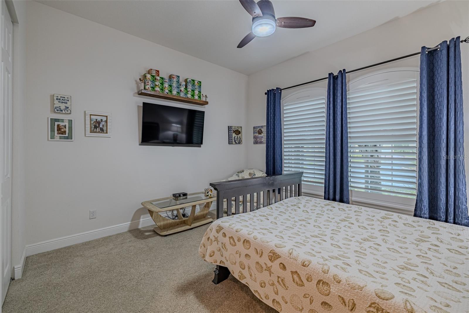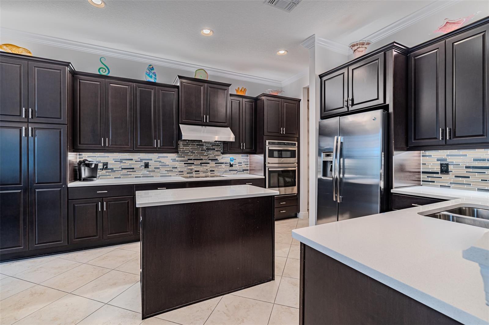 Esta casa de 2.720SF GL construiu Vizcaya tem três quartos com banheiros privativos, um escritório e uma planta baixa com uma grande sala, cozinha, jantar, sala de jantar e um salão de pó. Enter through the screened-in portico with its 48” door that affords wide access and leads to the bold French double front doors. Inside the expansive foyer, take note of the towering 14’-15’ tray ceiling with its dazzling 7 pendant chandelier that will fashionably welcome family and friends. 18”x18” porcelain tile on the diagonal finished with large 5 1/4” baseboards grace the floors, and the walls meet the Tetos com moldagem personalizada da coroa. A direita da porta da frente está o terceiro quarto que possui um closet, grandes janelas com persianas de plantações sob medida, um ventilador de teto e um banheiro seguro destacado por um chuveiro com paredes de mármore. O quarto 2 tem um lindo banheiro privativo e um closet. O espaçoso quarto primário é de 19'x16 'com um teto de bandeja de 10'-11' e possui uma janela de sacada de três paredes voltada para uma reserva natural da árvore de cipreste. Dois armários de tamanho generoso com portas espelhadas de dobra flanqueiam o corredor que leva ao privilégio. Esse privilégio apresenta duas vaidades separadas com balcões de quartzo, uma banheira de jardim, um chuveiro de água, um armário de água para o vaso sanitário e um armário de linho. Uma grande sala grande ancora a planta baixa aberta da Vizcaya. A grand 10’-11’ tray ceiling with an extraordinary 14 blade 72” Monte Carlo ceiling fan and six recessed lights crowns the expansive 26’x20’ great room that also has a three-panel 12’ wide sliding glass door leading to the backyard oasis. The gourmet Chef’s kitchen features a breakfast bar, a center island, a double-basin sink with a reverse-osmosis faucet, espresso colored solid wood Cabines com gavetas suaves, armários inferiores com prateleiras deslizantes e gavetas de panela cobertas com balcões de quartzo que, por sua vez, são acentuados por um deslumbrante backsplash de vidro em mosaico, aparelhos de aço inoxidável, um alojamento de bloqueio de alcance com alcance de alcance de alcance e alojamento em torno de cozinha, a cozinha é a cozinha. Oásis que será o espaço perfeito para desfrutar de refeições diárias ou íntimas. Os visitantes. Armários montados, um ventilador montado na parede e uma saída adicional em um circuito dedicado de 20 amp.