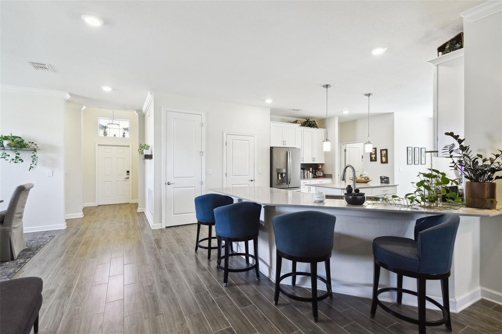 Bem-vindo à vida livre de manutenção em tradições no Lago Ruby, uma das principais comunidades do centro da Flórida. Desfrute de Access Private Lake, um clube de 19.000 pés quadrados, piscina e spa aquecidos, tênis e pickleball, fitness center, parque de cães, deslizamentos de barco e um calendário completo de eventos, todos a poucos minutos das compras, restaurantes e cuidados médicos. Situado em um lote de canto principal, esta casa de quatro quartos e três banheiros oferece mais de 2.300 pés quadrados de espaço aberto e aberto e é impecavelmente mantido. Tetos altos, pisos de ladrilhos, moldagem por coroa e janelas com classificação de furacões criam um interior confortável e seguro. A cozinha gourmet possui bancadas de quartzo, armários de madeira maciça de 42 polegadas, utensílios de aço inoxidável e um canto de café da manhã alegre, todos fluindo para a espaçosa grande sala e a área de jantar formal. A planta baixa inclui uma generosa suíte primária com banho no estilo de spa e closet, uma suíte de convidado frontal com banheiro privativo e dois quartos adicionais com um banho completo compartilhado. O Lanai exibido oferece um local tranquilo para relaxar ao ar livre, e a garagem de três carros de grandes dimensões oferece muito espaço para veículos, armazenamento ou hobbies. Recursos domésticos inteligentes e móveis opcionais fazem desta uma opção fácil e pronta para a vida durante todo o ano ou sazonal. As taxas de HOA incluem atendimento ao gramado, substituição anual da cobertura morta, pintura externa a cada 5 anos, cabo, internet e acesso total a comodidades comunitárias.