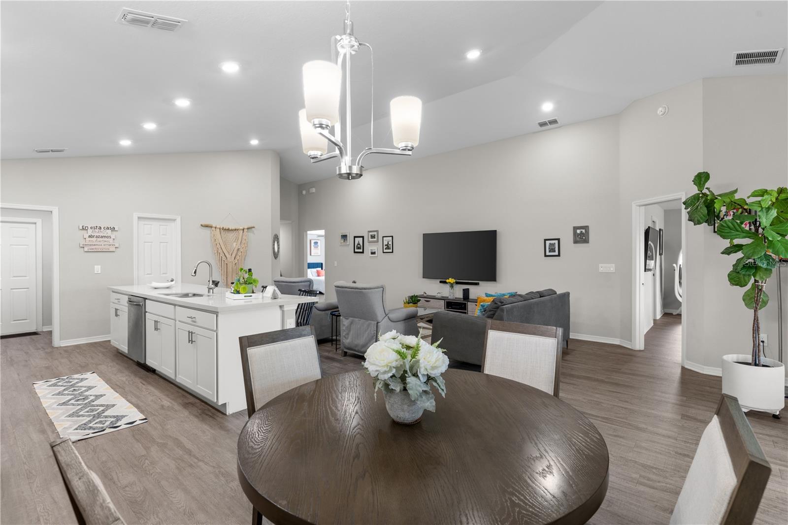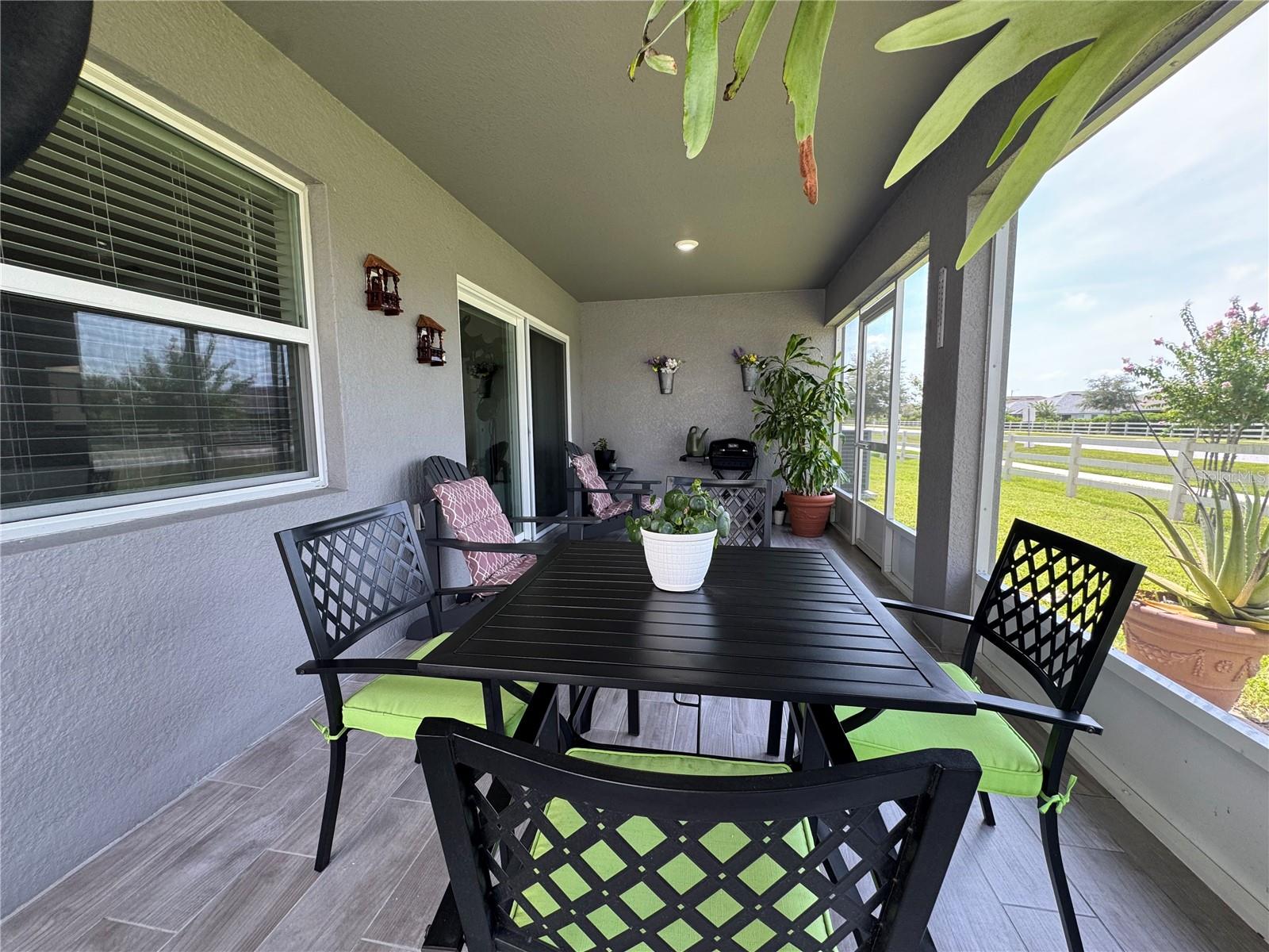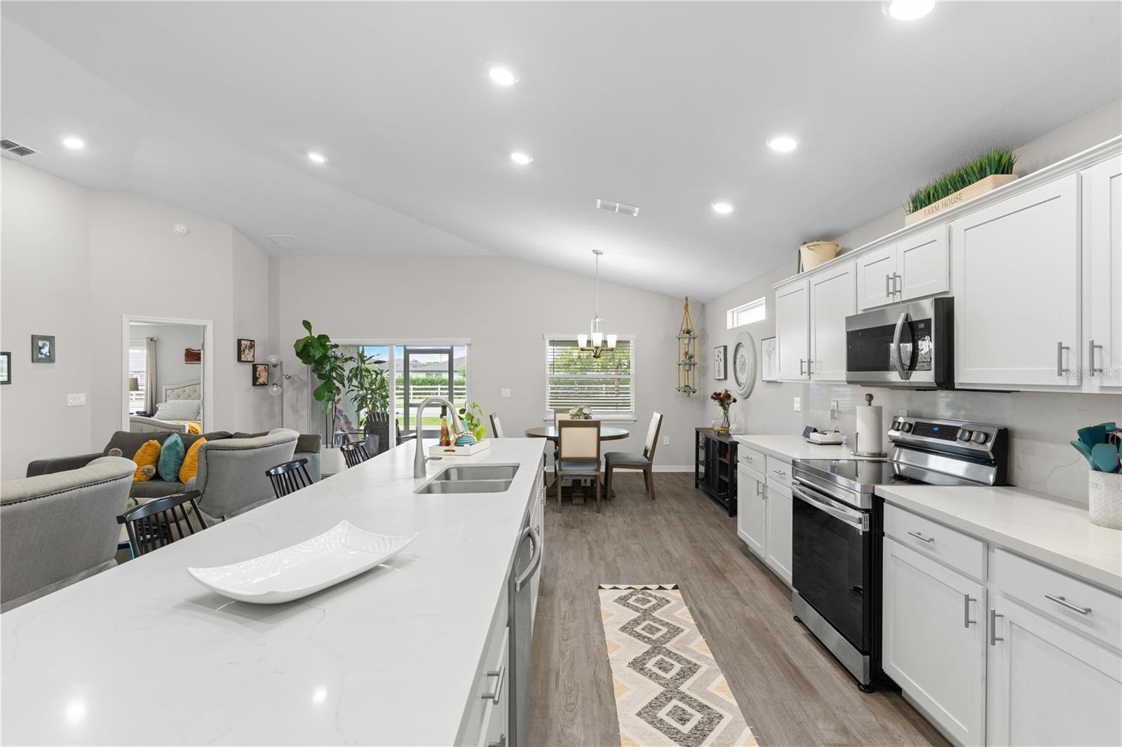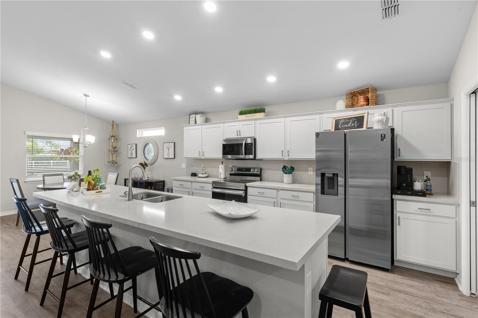 Motivo elegante e impressionante em Serendipity de 3 quartos e casa de 2 banheiros, oferecendo a mistura perfeita de luxo e funcionalidade para o seu conforto. Construído em 2021, esta residência meticulosamente mantida é repleta de atualizações premium. Entre para encontrar pisos de tábuas de vinil de luxo fluindo pelas principais áreas de estar e quartos, complementados por bancadas de quartzo na cozinha, banheiros e até a lavanderia. A cozinha aberta com uma grande ilha oferece toneladas de espaço de balcão, utensílios de aço inoxidável com eficiência energética, armários elegantes e um layout espaçoso perfeito para entretenimento. Enjoy the comfort of ceiling fans in all bedrooms, window blinds throughout, and a thoughtfully designed split floor plan offering privacy and space.The primary suite features a dual-sink vanity, walk-in closet, and a spa-like spacious ensuite.Additional features include, dedicated indoor laundry room with washer & dryer, screened-in lanai with tile flooring, 2-car garage with Storage shelves irrigation system for easy lawn maintenance, professional Câmeras de paisagem e segurança ao ar livre para tranquilidade. Não perca esta jóia.