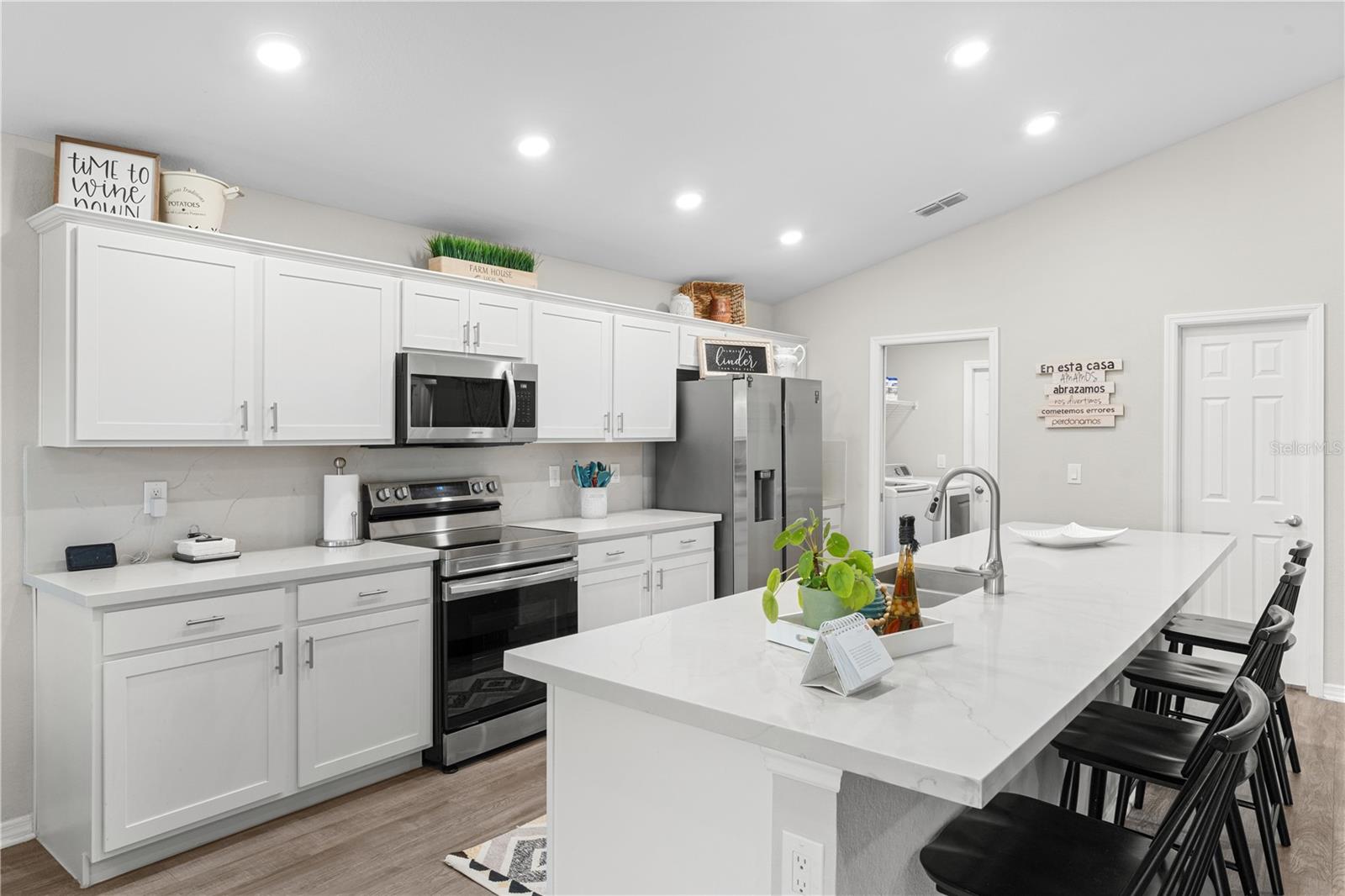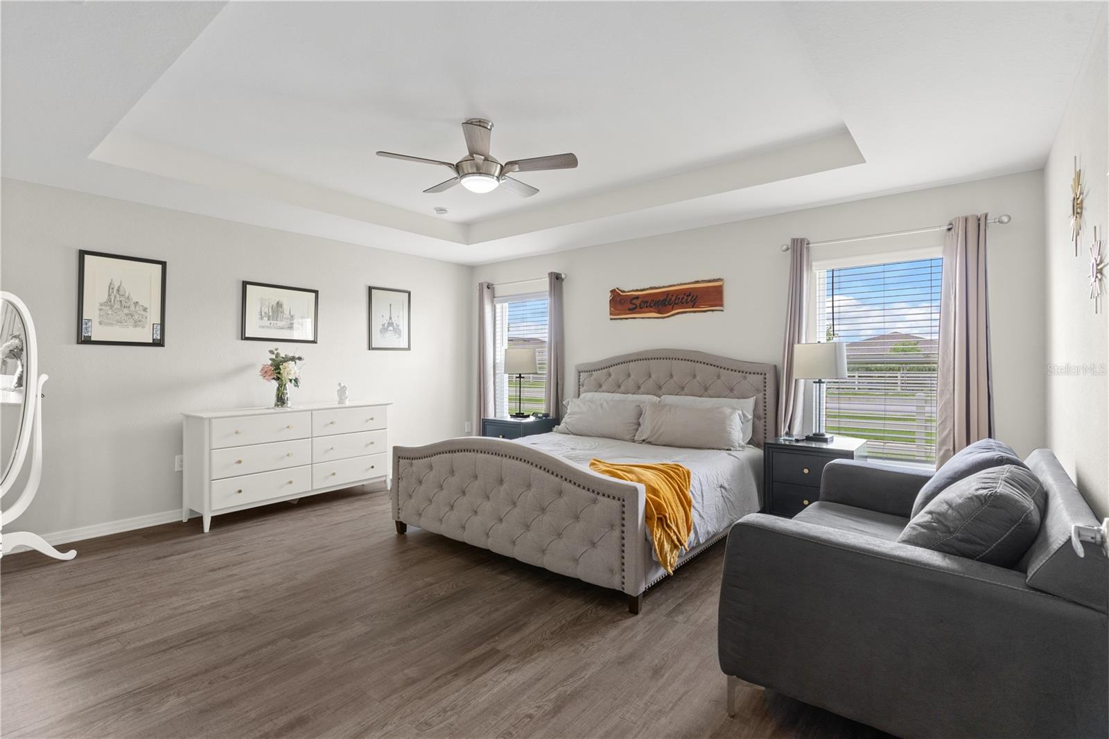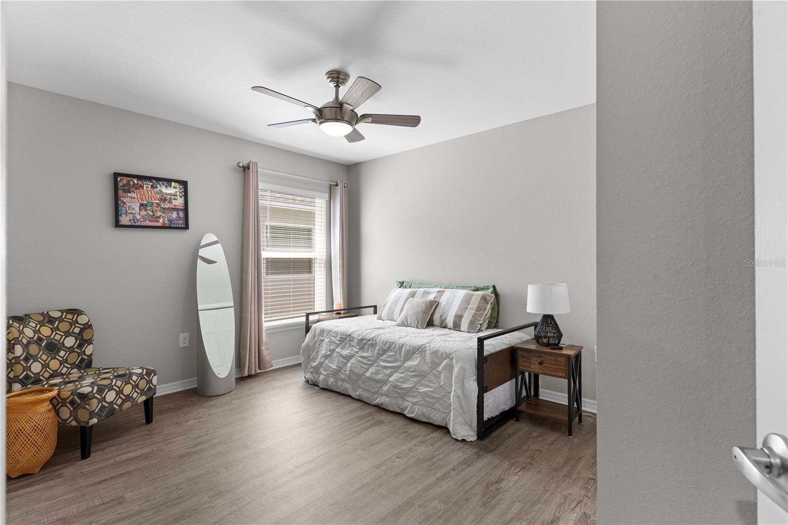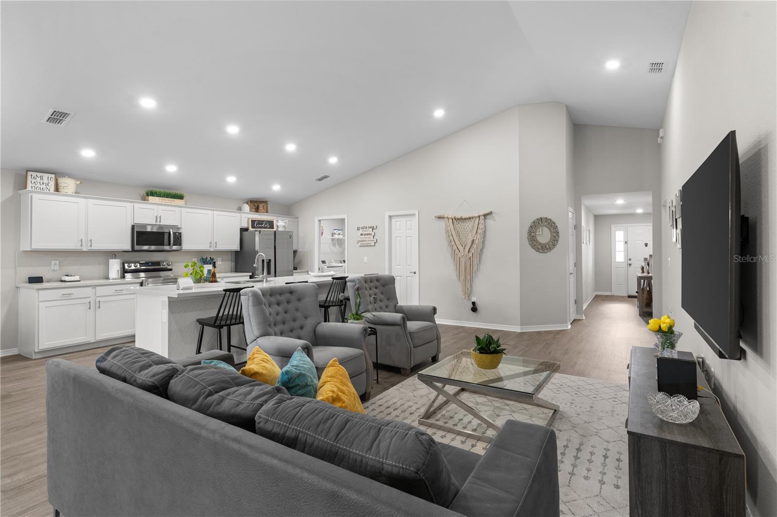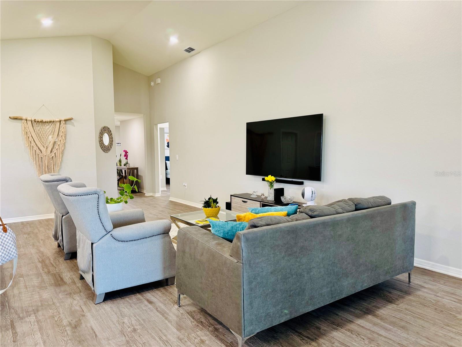 Motivo elegante e impressionante em Serendipity de 3 quartos e casa de 2 banheiros, oferecendo a mistura perfeita de luxo e funcionalidade para o seu conforto. Construído em 2021, esta residência meticulosamente mantida é repleta de atualizações premium. Entre para encontrar pisos de tábuas de vinil de luxo fluindo pelas principais áreas de estar e quartos, complementados por bancadas de quartzo na cozinha, banheiros e até a lavanderia. A cozinha aberta com uma grande ilha oferece toneladas de espaço de balcão, utensílios de aço inoxidável com eficiência energética, armários elegantes e um layout espaçoso perfeito para entretenimento. Enjoy the comfort of ceiling fans in all bedrooms, window blinds throughout, and a thoughtfully designed split floor plan offering privacy and space.The primary suite features a dual-sink vanity, walk-in closet, and a spa-like spacious ensuite.Additional features include, dedicated indoor laundry room with washer & dryer, screened-in lanai with tile flooring, 2-car garage with Storage shelves irrigation system for easy lawn maintenance, professional Câmeras de paisagem e segurança ao ar livre para tranquilidade. Não perca esta jóia.