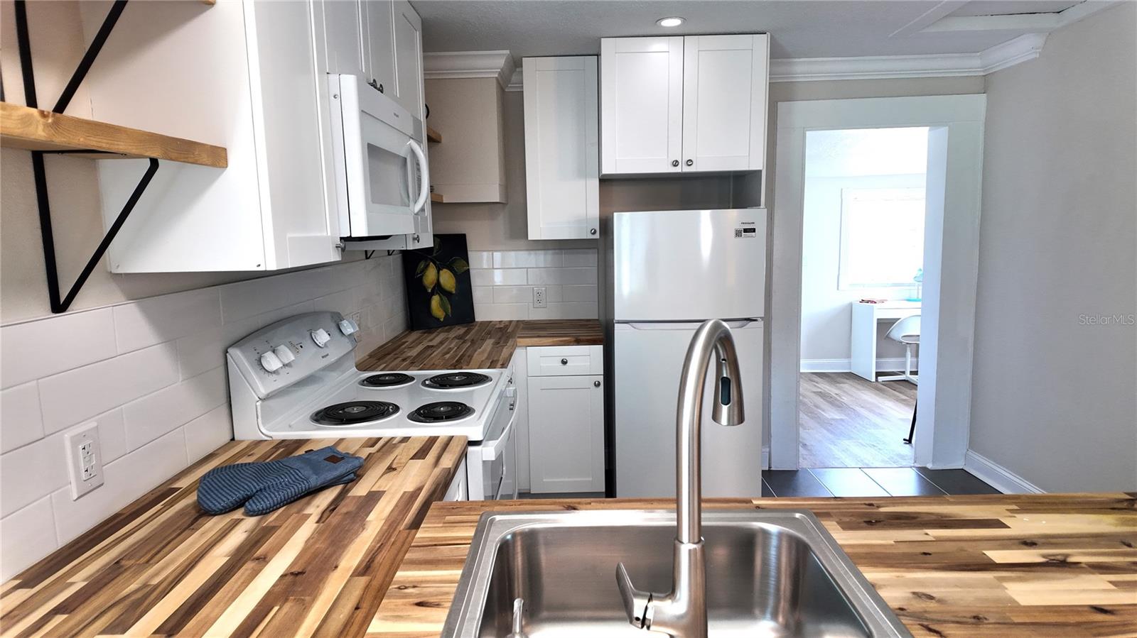 Bonito como um bangalô remodelado de botão não decepcionará. Brilhante e arejado, com muito charme. Trabalho de acabamento personalizado restaurado ao redor das portas e janelas. 2 paredes de sotaque personalizadas, 5 1/4 de rodapé e moldagem da coroa ajudam a completar o charme desta casa. Janelas atualizadas e isolamento para manter sua conta de energia elétrica no cheque. Cozinha personalizada com balcões de bloco de açougueiro e armários de madeira vendidos. Novos aparelhos também! O quarto de bônus pode ser um escritório ou quarto primário com banheiro anexado. Esta é uma casa imperdível com o zoneamento de uso misto. No coração de Zephyrhills e a apenas 10 minutos da capela de Wesley. Tem um negócio? Você pode usar a casa como veículo comercial do seu escritório e estacionamento em casa. Entre em contato com a cidade de Zephyrhills para uso de zoneamento. Grande quintal e quintal da frente com portão de ferro forjado e sebes para privacidade. Esta é uma propriedade única obrigatória para ver lindamente atualizada.