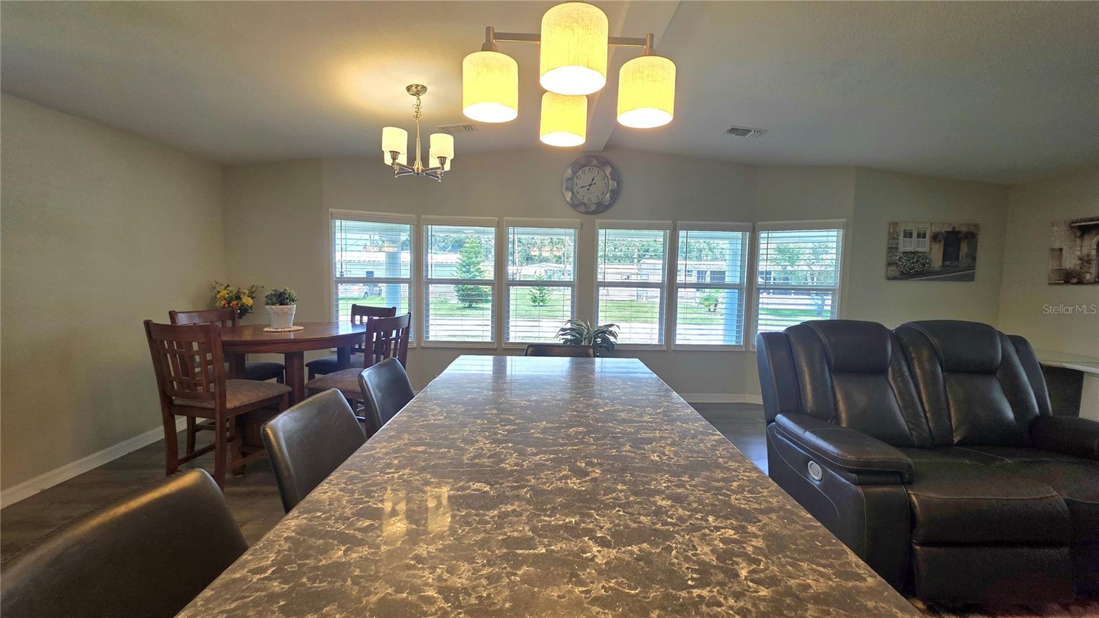 Lindamente atualizado em todo o mundo, com 2 quartos e 2 banheiros, interior texturizado de drywall, piso de vinil de luxo, janelas de dupla panela com persianas, portas interiores de seis painéis, espaçosa sala de ar-condicionado da Flórida, sala de utilidade de bônus com uma lavadora de lavadores/secador, banheira de lavanderia, fechamento de armazenamento e alcáve para um posto de utilidade. O piso plano aberto espaçoso mostra os tetos da catedral, uma janela de arco e ventilador de teto atualizado. The combined living, dining, and eat-in kitchen area is perfect for entertaining & includes upgraded cabinetry with soft-close doors and drawers, two built-in lazy Susans for convenient storage, breakfast bar island with seating for four, granite countertops, farmhouse-style stainless steel sink with disposal, under-cabinet lighting, stainless-steel LG kitchen appliance suite includes French door refrigerator with bottom freezer, ice and water dispenser, Lavagem de louça, forno de convecção e microondas montadas. A lavanderia interna oferece lavadora/secadora LG, armário de despensa/armazenamento, armários e porta de entrada lateral atualizada. O banheiro principal completamente atualizado possui um chuveiro com sotaque decorativo de telha e portas de vidro deslizante, vaidade e bancada atualizadas com pias duplas e espelho decorativo. O quarto de hóspedes é um refúgio aconchegante com um ventilador de teto atualizado, closet e conjunto de quartos combinando. The primary bedroom offers stunning views of the golf course and pond, plenty of natural light, upgraded sliding glass door with built-in blinds, a walk-in closet, an upgraded ceiling fan, and a remodeled ensuite bathroom boasts a walk-in shower with sliding glass doors, separate jacuzzi-style tub with decorative tile backsplash, upgraded vanity & countertop, double sinks & decorative mirror. As características externas incluem revestimento de lap de alumínio, teto de metal, calçada pintada, garagem, colunas dianteiras, passagem frontal e lateral cobertas para a segunda porta de entrada. O quintal possui um pátio de pavimentação com uma excelente vista para o campo de golfe e a lagoa, atualizada HVAC (2021), seu galpão de carrinho de golfe com rampa. mobiliado como mostrado. Localizado em uma área para animais de estimação de Betmar acres, uma vibrante comunidade de mais de 55 anos, onde você possui sua terra. Agende sua visita hoje.