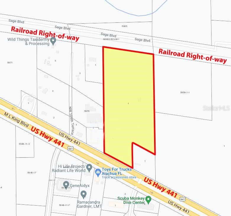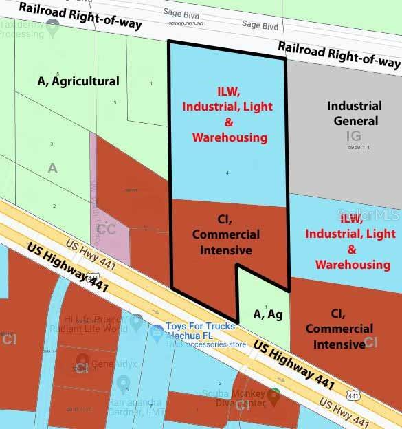 This is a 16.1 Acre parcel with 371.33 feet of frontage along the Northeast Right-of-way of US Highway 441 in the City of Alachua. The property has 6 acres zoned for Commercial Intensive along the highway and has 10 acres zoned ILW, Industrial, Light and Warehousing at the rear of the property. This parcel has been approved by the Florida Dept. of Transportation for an access and cut along US-441, and has been approved by the Suwannee Water Management District and the City of Alachua for development of a 6,000 sf commercial building along the highway and 22,400 sf industrial building behind the commercial building. There is additional land for development besides these approved structures. According to the FDOT, traffic count in front of this parcel is 17,700 vehicles daily. Located in a growing area of the city of Alachua, there are many opportunities and benefits by developing this parcel. South of this parcel is Tech City and to the North is Progress Park. Progress District is a 600 acre development by the Roberts Company. The first phase is The Convergence anchored by Momentum Labs. Lennar Homes has already put in the infrastructure on a 86 lot residential subdivision and approximately half the homes have been constructed. In Progress Park, two new bio-tech buildings have been constructed. The City of Alachua is growing and this parcel can help your company to be a part of this transformation of this area of North Central Florida.