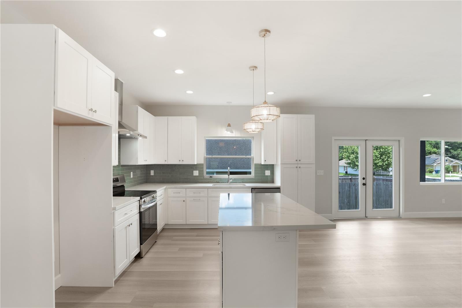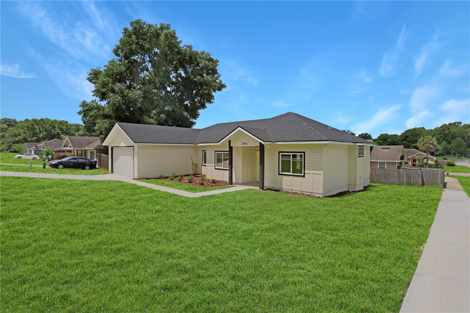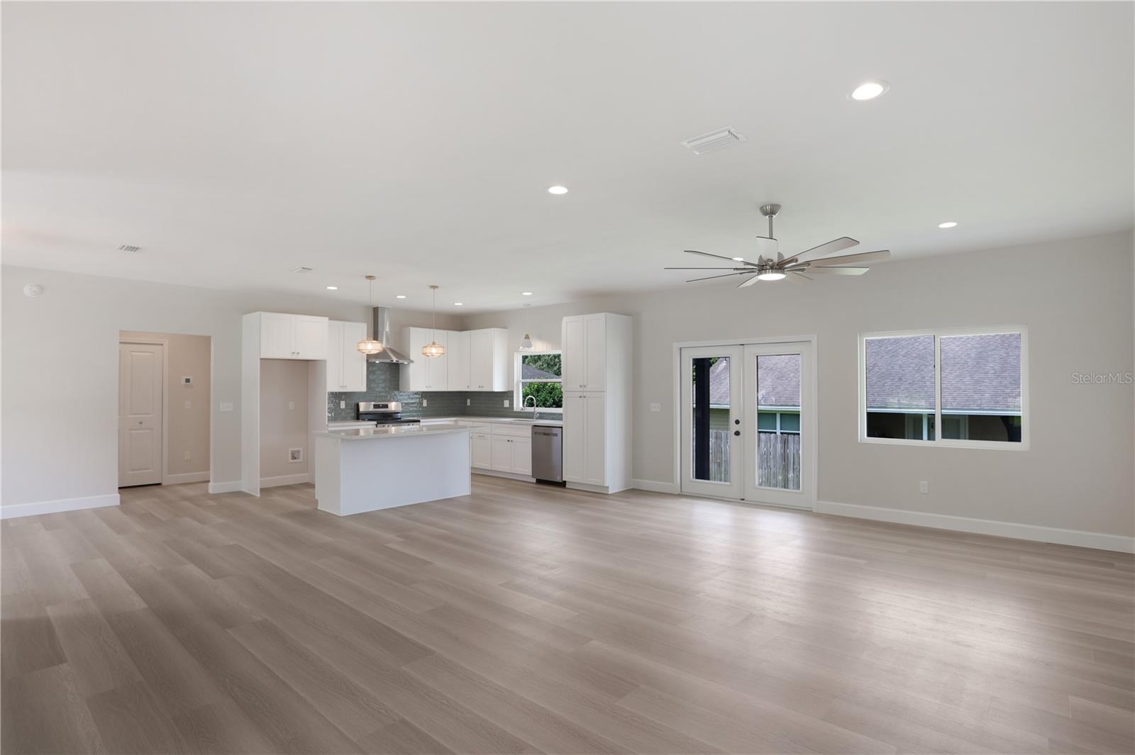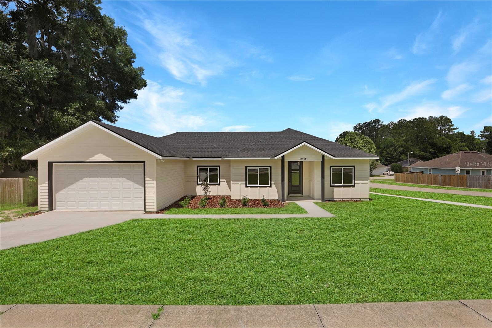 NEW CONSTRUCTION, MOVE-IN READY 4 BR, 2 BA home with split-bedrooms, that sits on a spacious 0.19-acre corner lot, conveniently nestled just blocks away from downtown Alachua and between High Springs & Gainesville. Enjoy the outdoor space this home provides with its beautiful landscaping and back porch. The open-concept main floor features luxury vinyl flooring, beautiful light fixtures above the island, dining, entryway, & above kitchen sink, fans and recessed lighting throughout the house and porch, and French doors leading to the backyard. The beautifully designed kitchen features tall 42” upper cabinets, quartz countertops, tile backsplash, stainless steel appliances, a large island, soft-close cabinets and drawers, and a roomy pantry. Throughout the home are many double-pane windows allowing natural light to brighten the space and provide an even greater open feeling. All doors feature attractive custom wood trim a big laundry room with a cabinet & counter and it leads out to a spacious 2-car garage with concrete flooring. Both bathrooms feature quartz countertops and tile flooring with built-in shelves. The master bathroom is beautifully designed with dual vanities, a stunning concrete shower with glass doors, and a separate enclosed toilet room with a spacious linen closet and his & hers walk-in closet. The second bathroom is also beautifully designed with attractive tile surrounding the shower/tub. Come check out this beautiful home in The Good Life Community of Alachua.