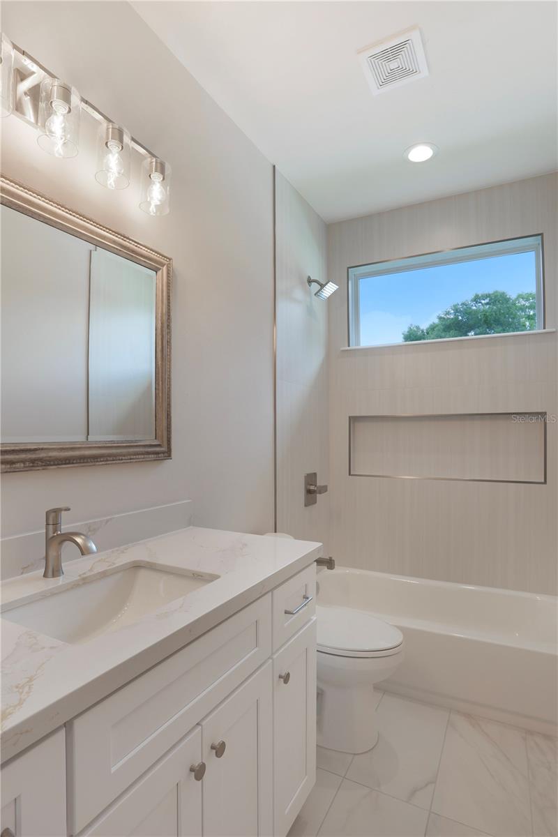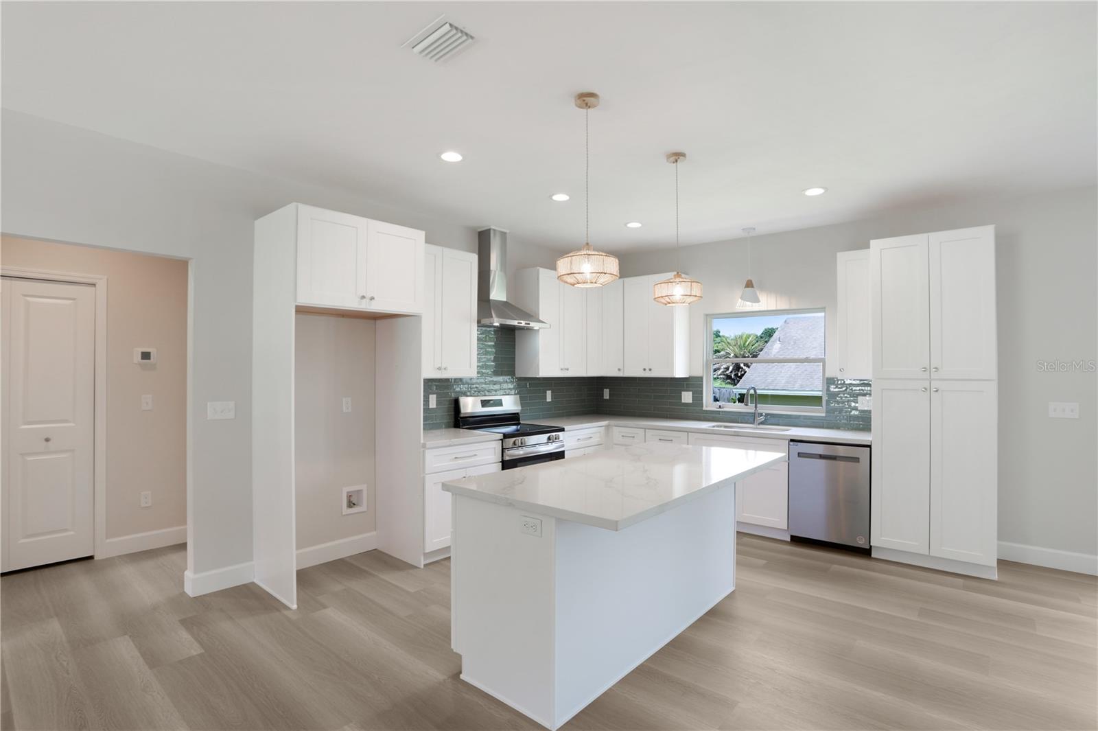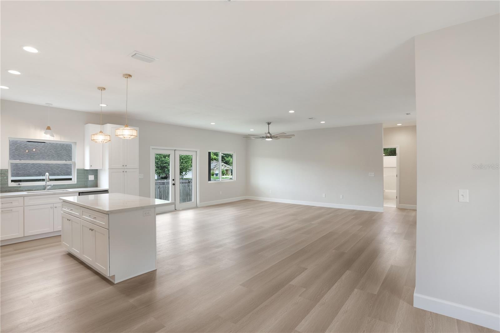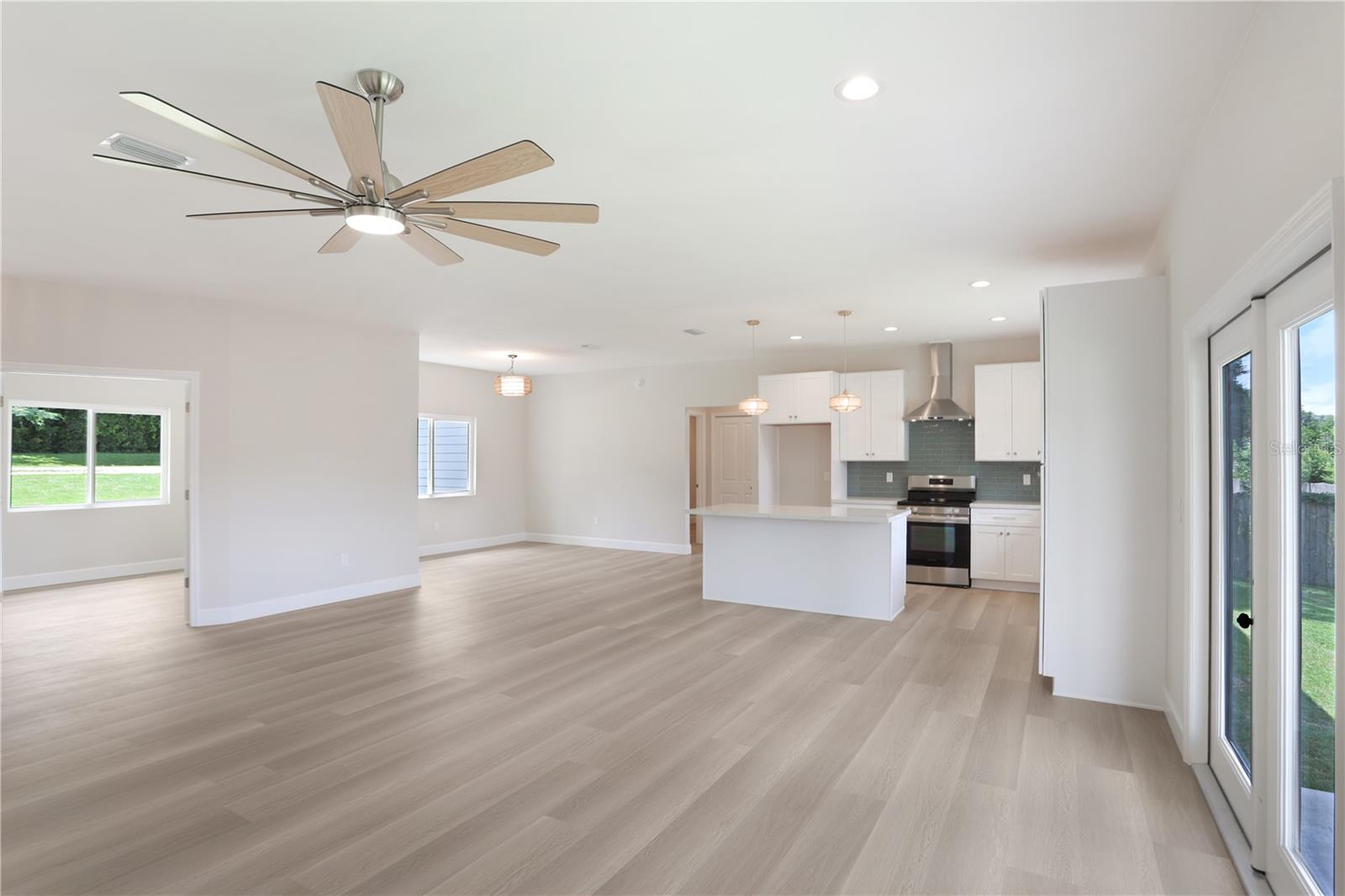 NEW CONSTRUCTION, MOVE-IN READY 4 BR, 2 BA home with split-bedrooms, that sits on a spacious 0.19-acre corner lot, conveniently nestled just blocks away from downtown Alachua and between High Springs & Gainesville. Enjoy the outdoor space this home provides with its beautiful landscaping and back porch. The open-concept main floor features luxury vinyl flooring, beautiful light fixtures above the island, dining, entryway, & above kitchen sink, fans and recessed lighting throughout the house and porch, and French doors leading to the backyard. The beautifully designed kitchen features tall 42” upper cabinets, quartz countertops, tile backsplash, stainless steel appliances, a large island, soft-close cabinets and drawers, and a roomy pantry. Throughout the home are many double-pane windows allowing natural light to brighten the space and provide an even greater open feeling. All doors feature attractive custom wood trim a big laundry room with a cabinet & counter and it leads out to a spacious 2-car garage with concrete flooring. Both bathrooms feature quartz countertops and tile flooring with built-in shelves. The master bathroom is beautifully designed with dual vanities, a stunning concrete shower with glass doors, and a separate enclosed toilet room with a spacious linen closet and his & hers walk-in closet. The second bathroom is also beautifully designed with attractive tile surrounding the shower/tub. Come check out this beautiful home in The Good Life Community of Alachua.