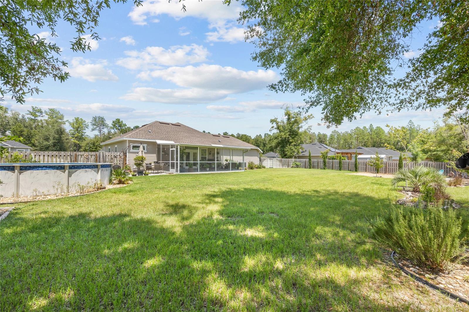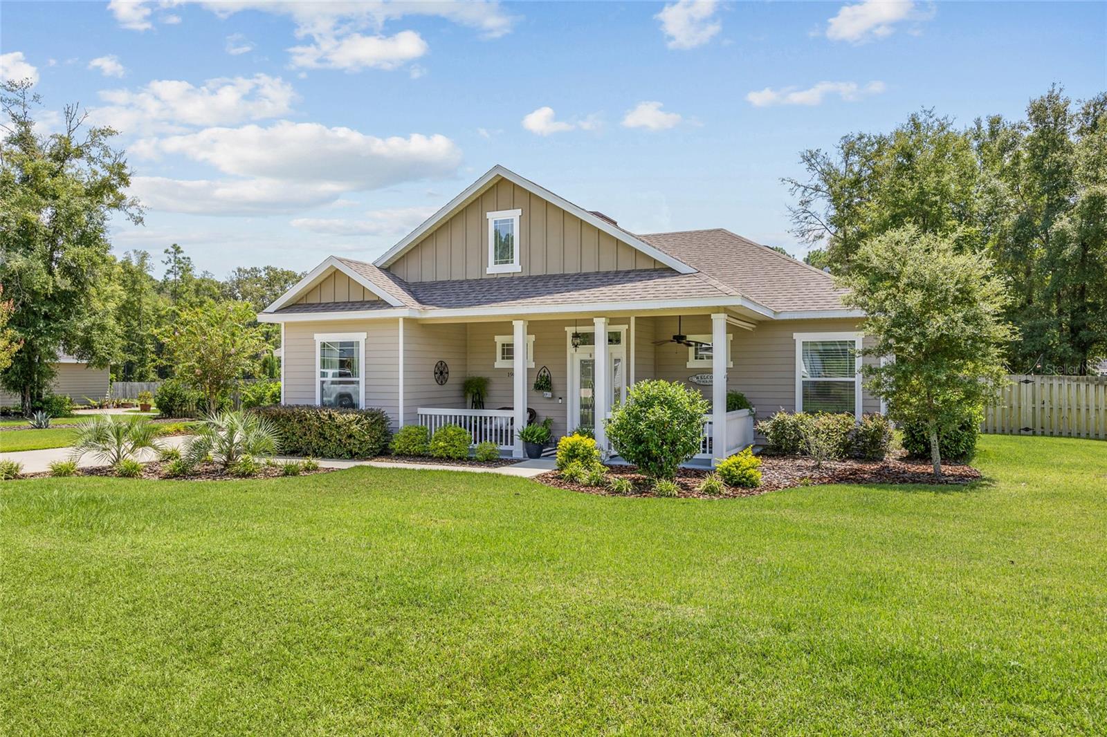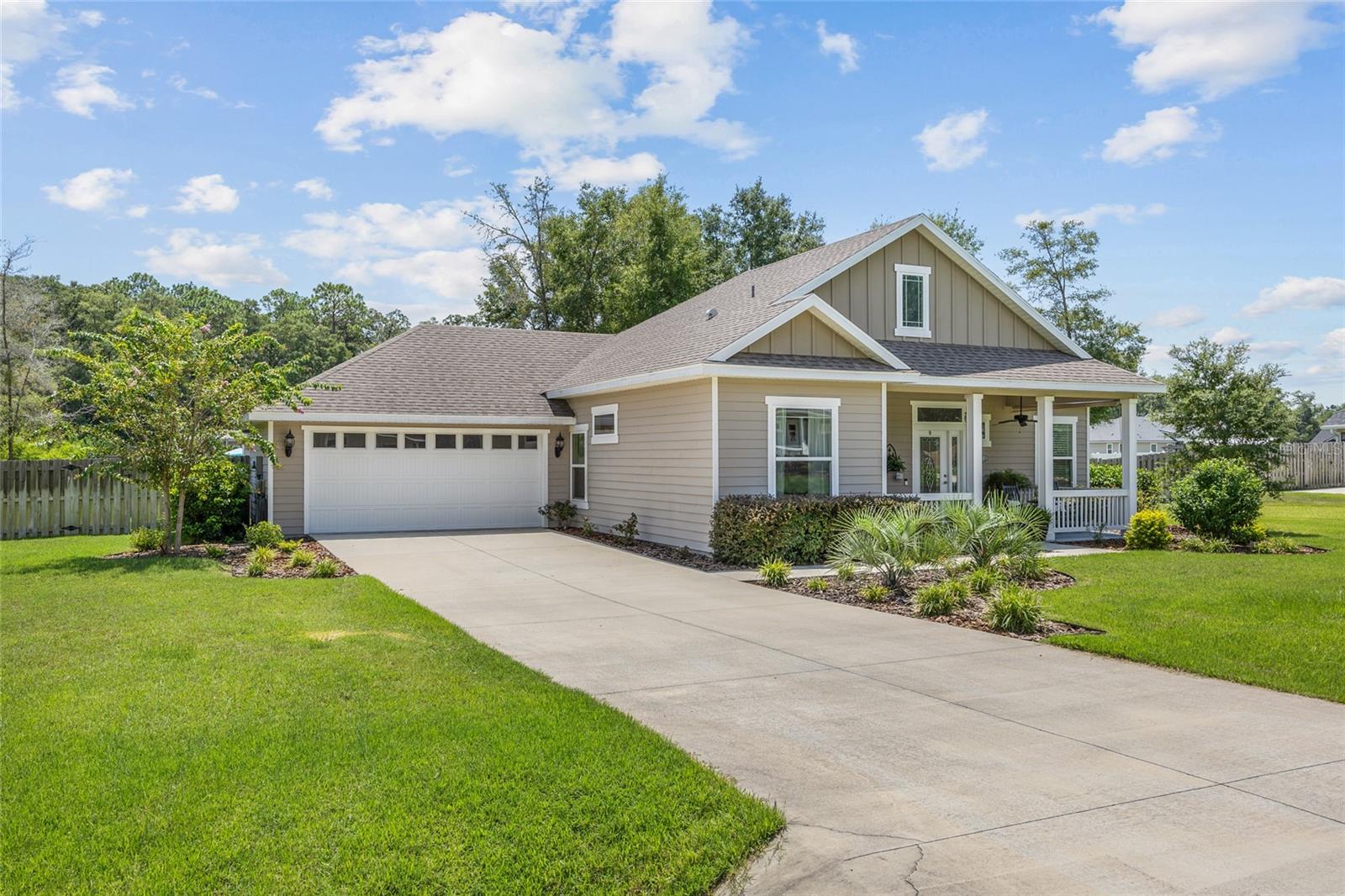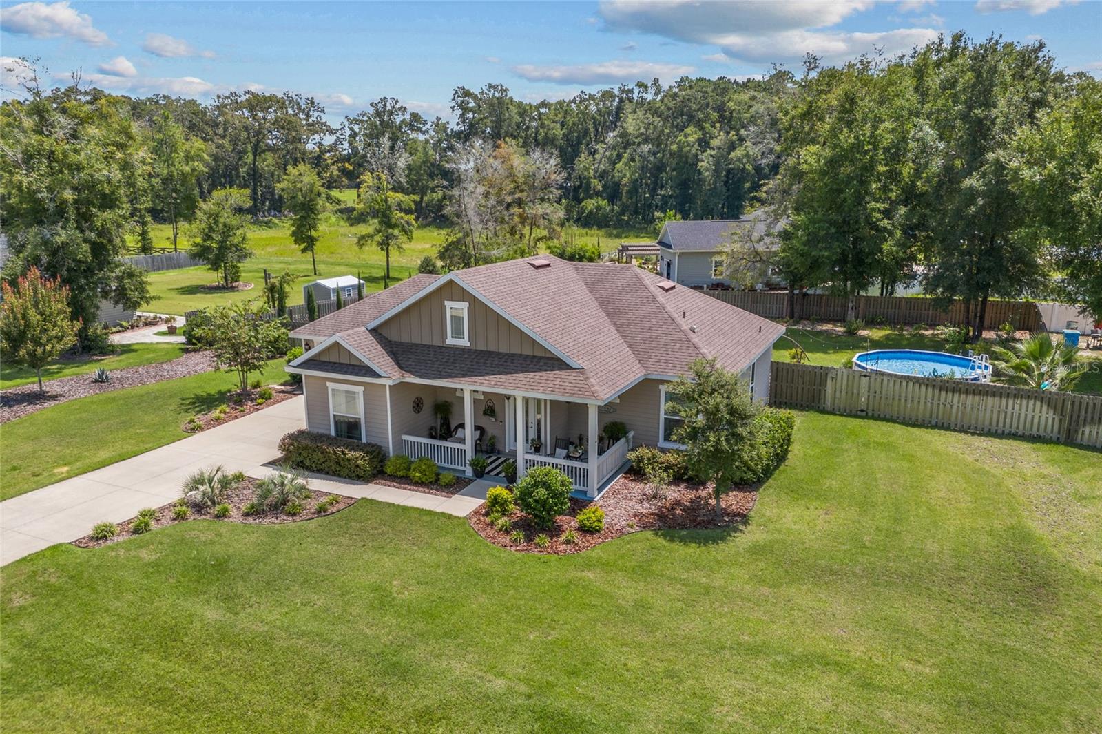 Luxurious 2020 HGTV ready home in the craftsman style front porch community of Peyton’s Preserve! This gorgeous like-new 3-bed/2-bath home on an oversized lot features an above-ground pool, and 1,862 sq. ft. of energy efficient features and elegant finishes of the highest quality. Opening the ornate glass front door and stepping into the foyer, you will find the living room/dining room with luxury vinyl plank flooring and tray ceiling with crown molding. To the left of the dining area is the kitchen which is sure to accommodate the most discerning chef with its granite countertops, tile backsplash, stainless steel appliances, pantry, and breakfast bar. A split floor plan offers privacy for family members and guests. There are two comfortable guest bedrooms with plush carpeting, and a guest bath with granite, 18” tile, and shower/tub combo. The spacious owner’s suite has a tray ceiling with crown molding, cozy sitting area, plush carpeting, walk-in closet, and ensuite bath that features double vanities with granite, 18” tile, and a walk-in shower with glass door. You will also discover an indoor laundry closet, and convenient office nook that includes a long built-in desk with granite. Recent additions include the pool, screened porch, firepit, and privacy fence, which create a backyard oasis. Peyton’s Preserve is a gated community surrounded by woodlands, and located between Alachua and High Springs, charming cities with small-town atmospheres. The property is an 8-minute drive to I-75, 8-minute drive to the Publix in Alachua, and a 25-minute drive to University of Florida in Gainesville. Restaurants, stores, and spectacular natural springs for outdoor adventure are all close by. If you have been searching for a home that blends luxury, comfort, affordability, and a fabulous location, you will want to schedule your private showing right away since homes in this neighborhood are rarely seen on the market!