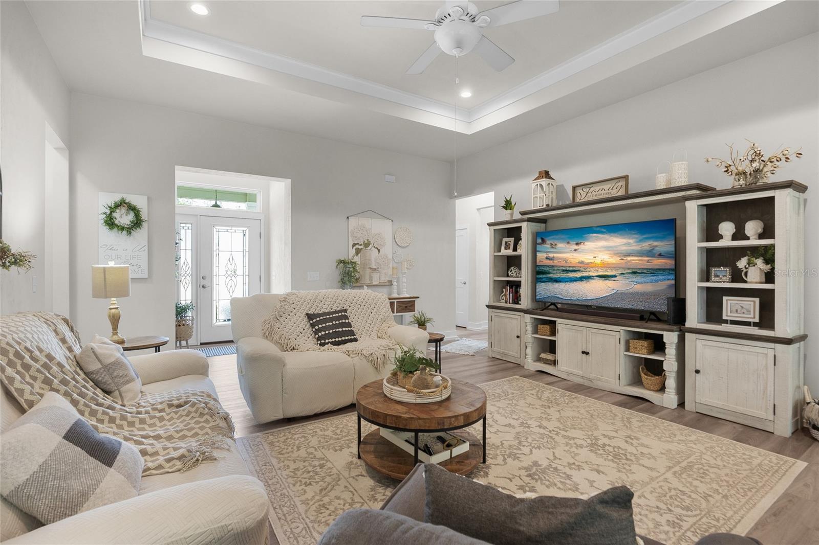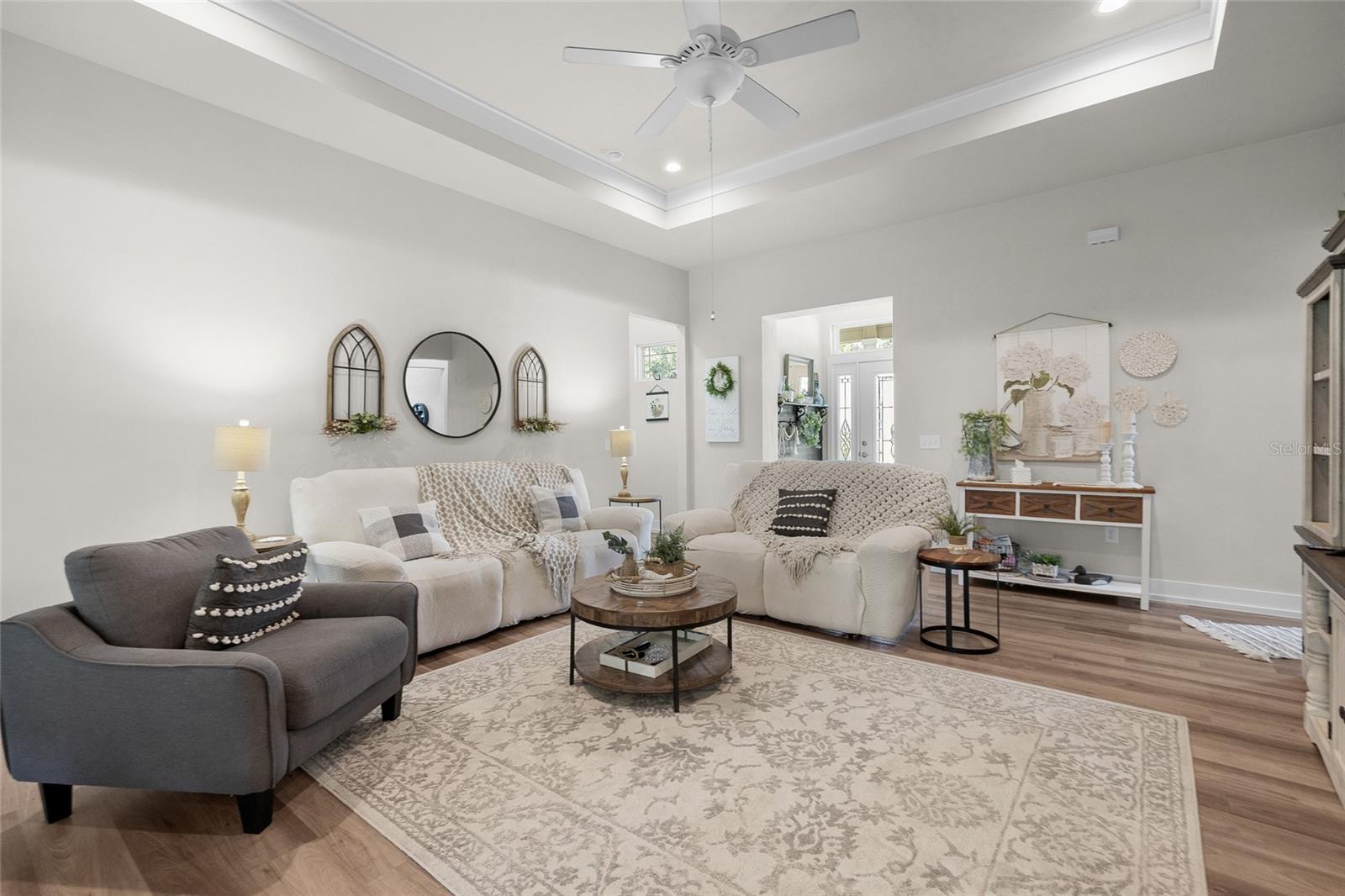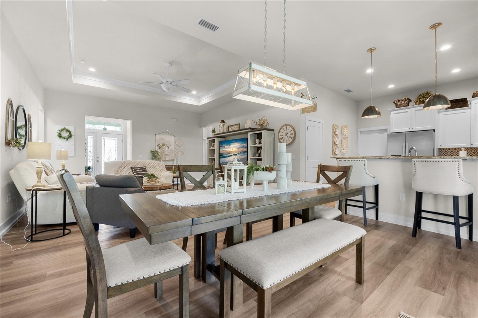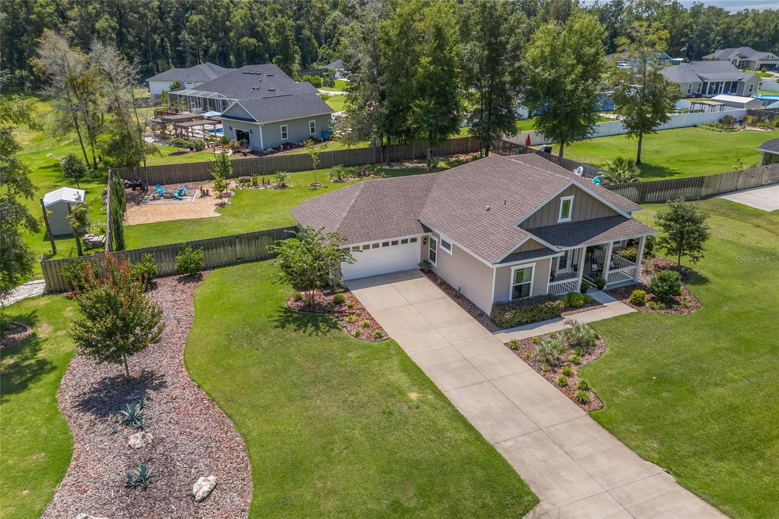 Luxurious 2020 HGTV ready home in the craftsman style front porch community of Peyton’s Preserve! This gorgeous like-new 3-bed/2-bath home on an oversized lot features an above-ground pool, and 1,862 sq. ft. of energy efficient features and elegant finishes of the highest quality. Opening the ornate glass front door and stepping into the foyer, you will find the living room/dining room with luxury vinyl plank flooring and tray ceiling with crown molding. To the left of the dining area is the kitchen which is sure to accommodate the most discerning chef with its granite countertops, tile backsplash, stainless steel appliances, pantry, and breakfast bar. A split floor plan offers privacy for family members and guests. There are two comfortable guest bedrooms with plush carpeting, and a guest bath with granite, 18” tile, and shower/tub combo. The spacious owner’s suite has a tray ceiling with crown molding, cozy sitting area, plush carpeting, walk-in closet, and ensuite bath that features double vanities with granite, 18” tile, and a walk-in shower with glass door. You will also discover an indoor laundry closet, and convenient office nook that includes a long built-in desk with granite. Recent additions include the pool, screened porch, firepit, and privacy fence, which create a backyard oasis. Peyton’s Preserve is a gated community surrounded by woodlands, and located between Alachua and High Springs, charming cities with small-town atmospheres. The property is an 8-minute drive to I-75, 8-minute drive to the Publix in Alachua, and a 25-minute drive to University of Florida in Gainesville. Restaurants, stores, and spectacular natural springs for outdoor adventure are all close by. If you have been searching for a home that blends luxury, comfort, affordability, and a fabulous location, you will want to schedule your private showing right away since homes in this neighborhood are rarely seen on the market!