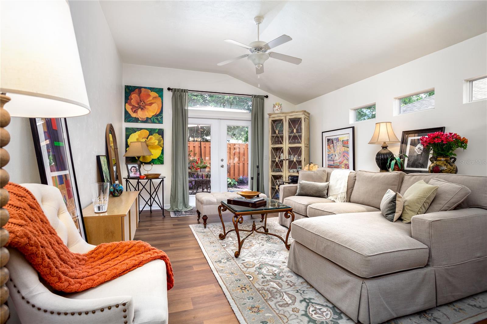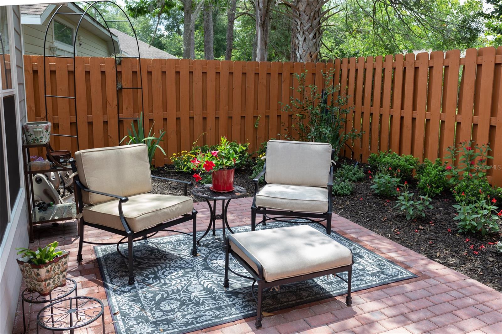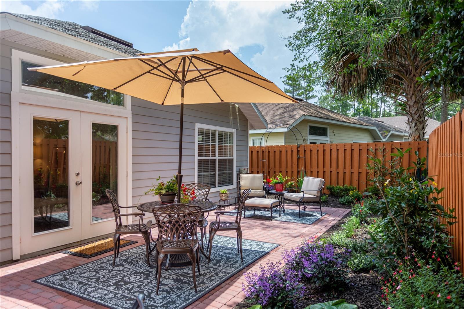 Welcome to your enchanting cottage-style oasis, a beautiful three-bedroom, two-bath garden home that offers a tranquil retreat within a vibrant community. As you step through the stunning glass insert front door, you're greeted by a bright foyer that leads to elegant French doors, inviting you to the serene brick patio—perfect for mornings and lively gatherings. This thoughtfully designed split-plan layout features two cozy bedrooms at the front of the home, separated by a stylish bathroom, while the spacious primary bedroom, overlooking the lush garden, provides a tranquil escape. The newly renovated primary bathroom shower adds an elegant touch to your private sanctuary. The outdoor space is spectacular, highlighted by a thoughtfully landscaped yard adorned with native flowering plants that attract butterflies and songbirds, creating a peaceful environment. Enjoy your morning coffee or host friends on the charming brick garden patio in your secluded backyard. This home is loaded with remarkable upgrades: a new roof (2023), modern stainless steel kitchen appliances (2024), upgraded cabinetry in the laundry room and primary closet, and a newly installed water softener. Gorgeous ceramic tile flows through the kitchen, bathrooms, and laundry room, while inviting vinyl wood flooring warms the living areas and bedrooms. The kitchen features a convenient breakfast bar overlooking the dining area and a bright living room filled with natural light. As part of an active neighborhood, indulge in amenities like pickleball, golf, swimming, and an abundance of scenic hiking trails nearby. Enjoy easy access to San Felasco State Park and Devils Millhopper, along with close proximity to shopping and healthcare facilities. Don’t miss the opportunity to make this charming, enchanting garden home your own—a perfect blend of comfort, style, and an incredible lifestyle awaits! Seller is a licensed realtor