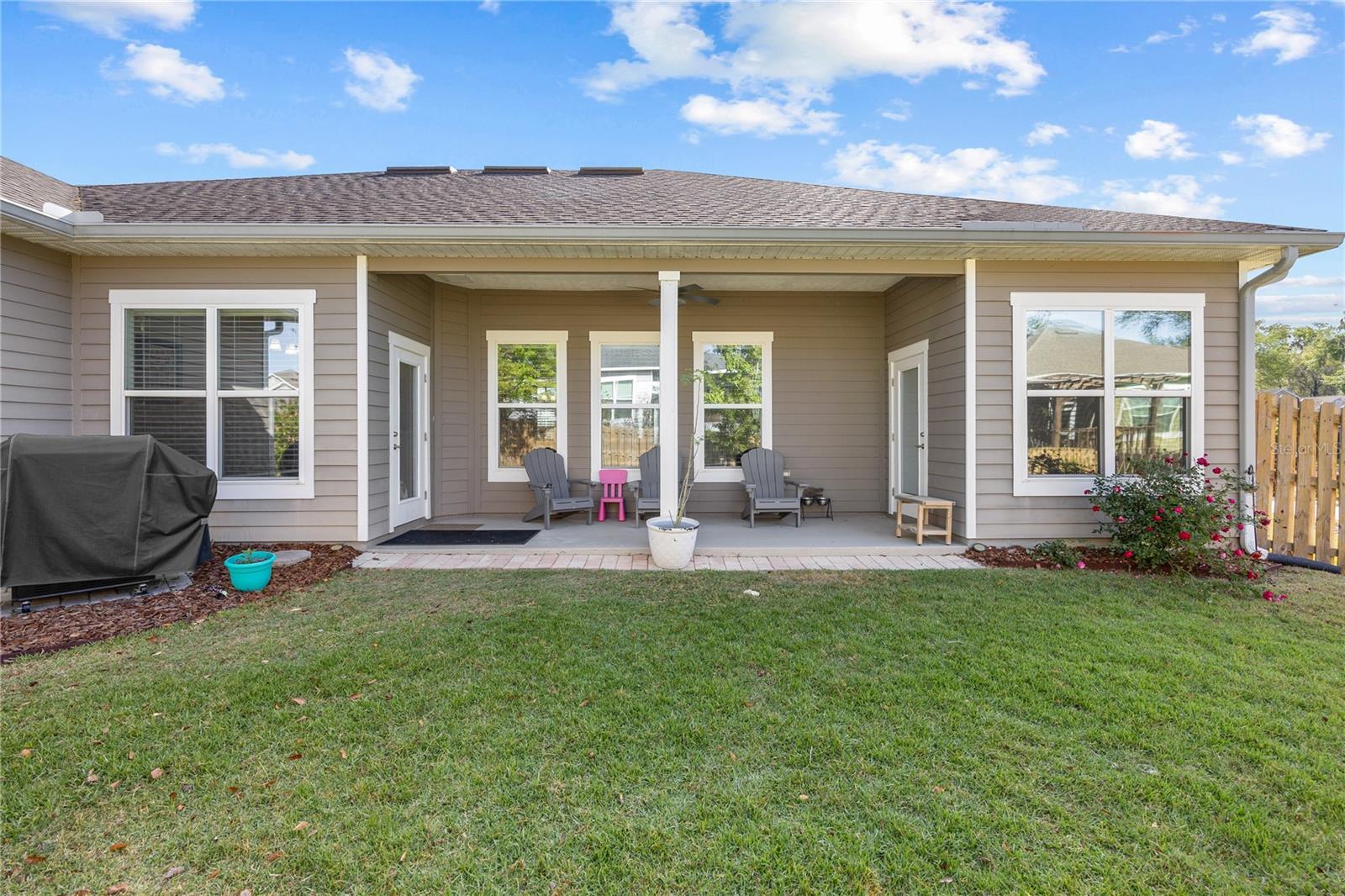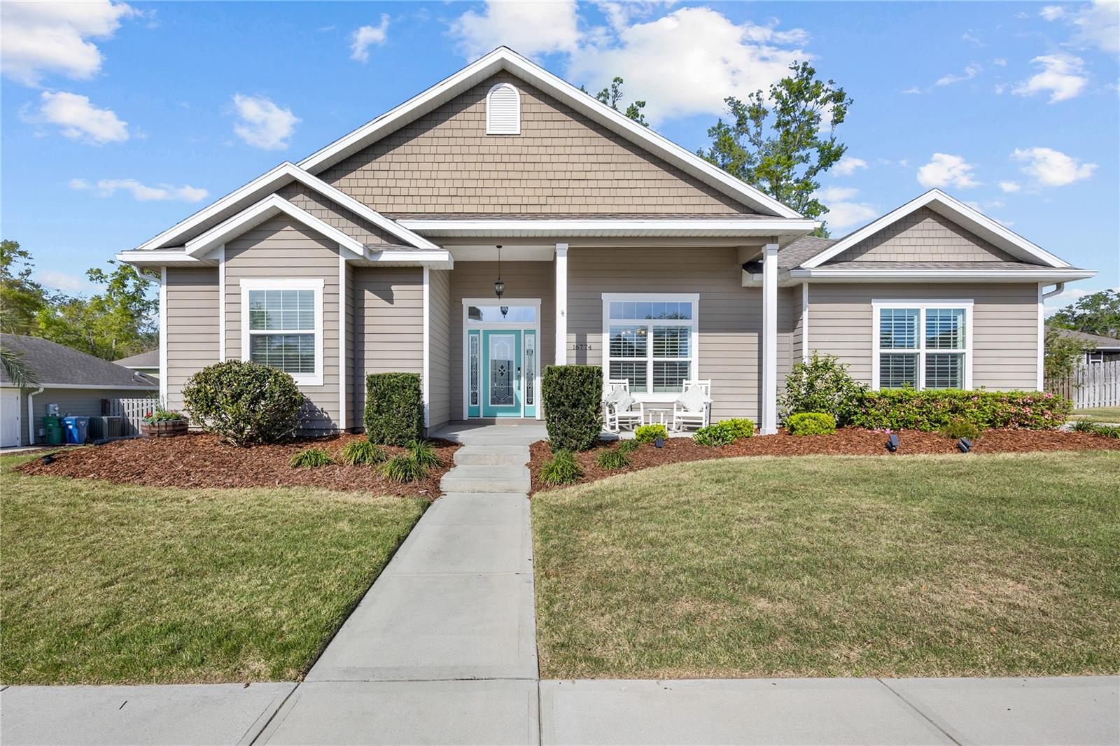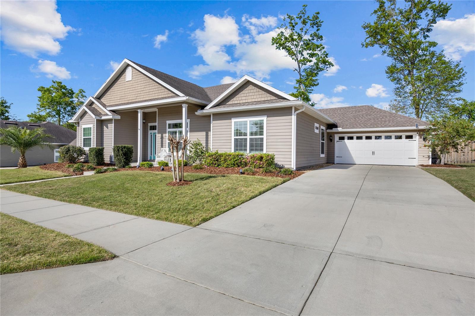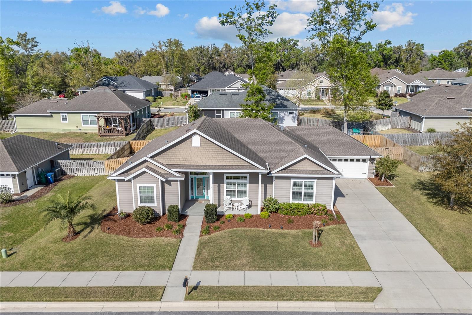 Welcome to your future home in the sought after neighborhood of Heritage Oaks in Alachua! This 4 bedroom, 3 bathroom home shows true craftsmanship and quality, vaulted ceilings, split floorplan, open living space, stainless steel appliances (that all stay), and no carpet in the home. Backyard is fully fenced, with mature citrus trees and a patio overlooking the yard. Kitchen has custom oversized cabinets and stone countertops and built in pantry, perfect for the chefs in your life! Primary suite has his and her closets and vanities, large garden tub and a walk in shower. Guest rooms are on the other side of the home, with bathroom between the rooms. The guest suite is located at the back of the home, with walk in closet. Access to the laundry room from inside the home and garage, large folding counter and cabinets for ample storage. Fully finished 2 car garage and spacious driveway for all your guests! The neighborhood is very walkable with sidewalks and large playground at the center of the community. Easy access to 441 and I-75 for very short commute into Gainesville. Walking distance to Publix and very close to multiple restaurants. Call your very favorite buyers agent for a showing today!