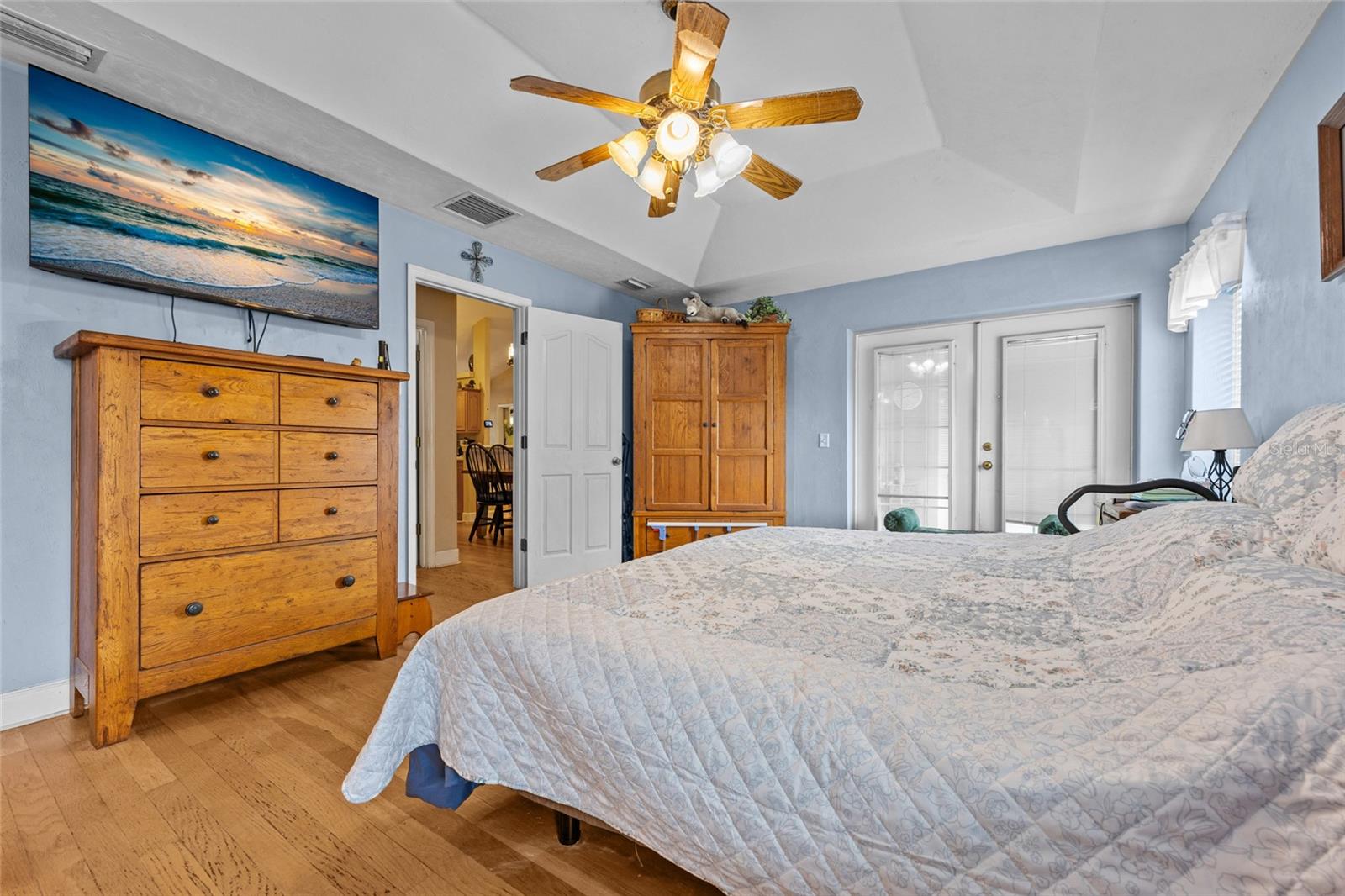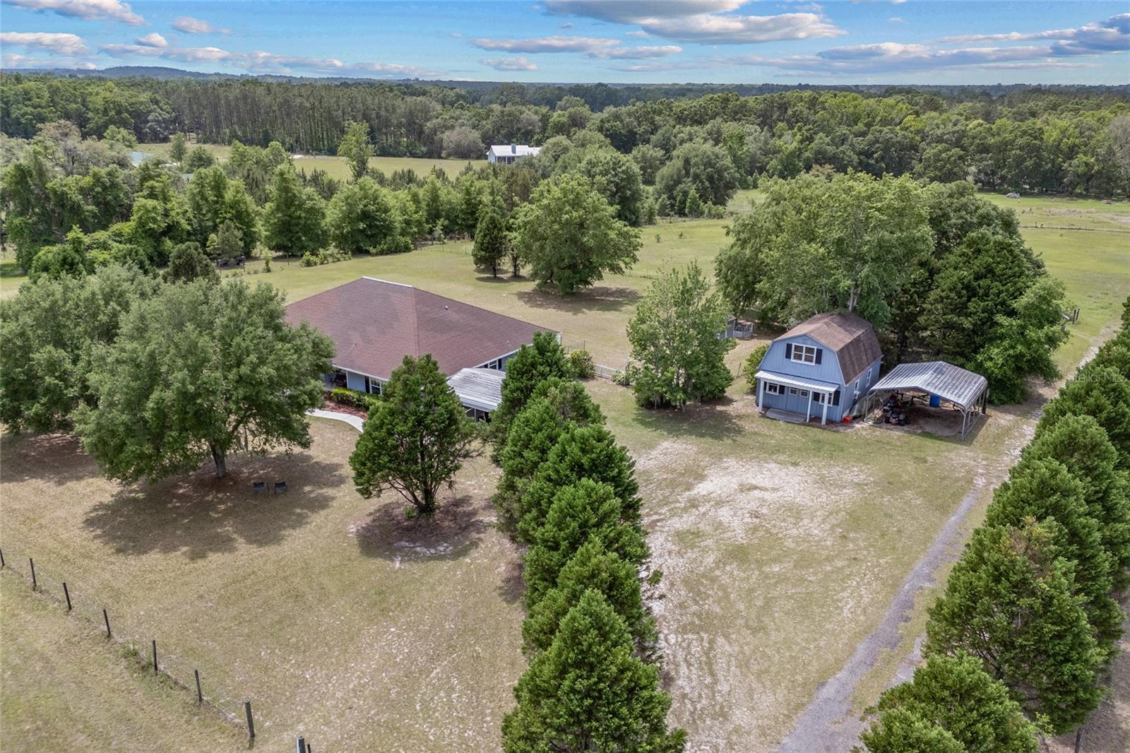 Welcome to your private retreat! This 3-bedroom, 2-bath home + office sits on over 6 beautiful, fully fenced acres with Santa Fe river access, offering the best of peaceful country living just minutes from downtown Alachua and High Springs. Set back off a paved road with a private drive, the home boasts excellent curb appeal, fruit trees, and an adorable front porch that invites you in. Step inside to a bright office filled with natural light, perfect for working from home. The spacious living room features vaulted ceilings, a cozy brick fireplace, and opens to a large screened-in back porch with stunning backyard views—ideal for relaxing or entertaining. The kitchen is a chef’s dream, complete with a large island with seating, ample counter space, and a big window over the sink that overlooks the front yard. The kitchen flows seamlessly into the generous dining area. A split floor plan ensures privacy, with a roomy master suite offering tray ceilings, direct access to the screened porch, and a luxurious en suite bath with dual sinks, abundant storage, and a jacuzzi tub. Additional features include a 2-car garage, a detached matching shed with power—perfect for hobbies or a workshop—plus two separate carports to store all your vehicles, boats, or toys. All of this is conveniently located near I-75, top colleges, hospitals, and North Florida’s famous rivers and springs. This property combines comfort, space, and natural beauty—schedule your showing today!
