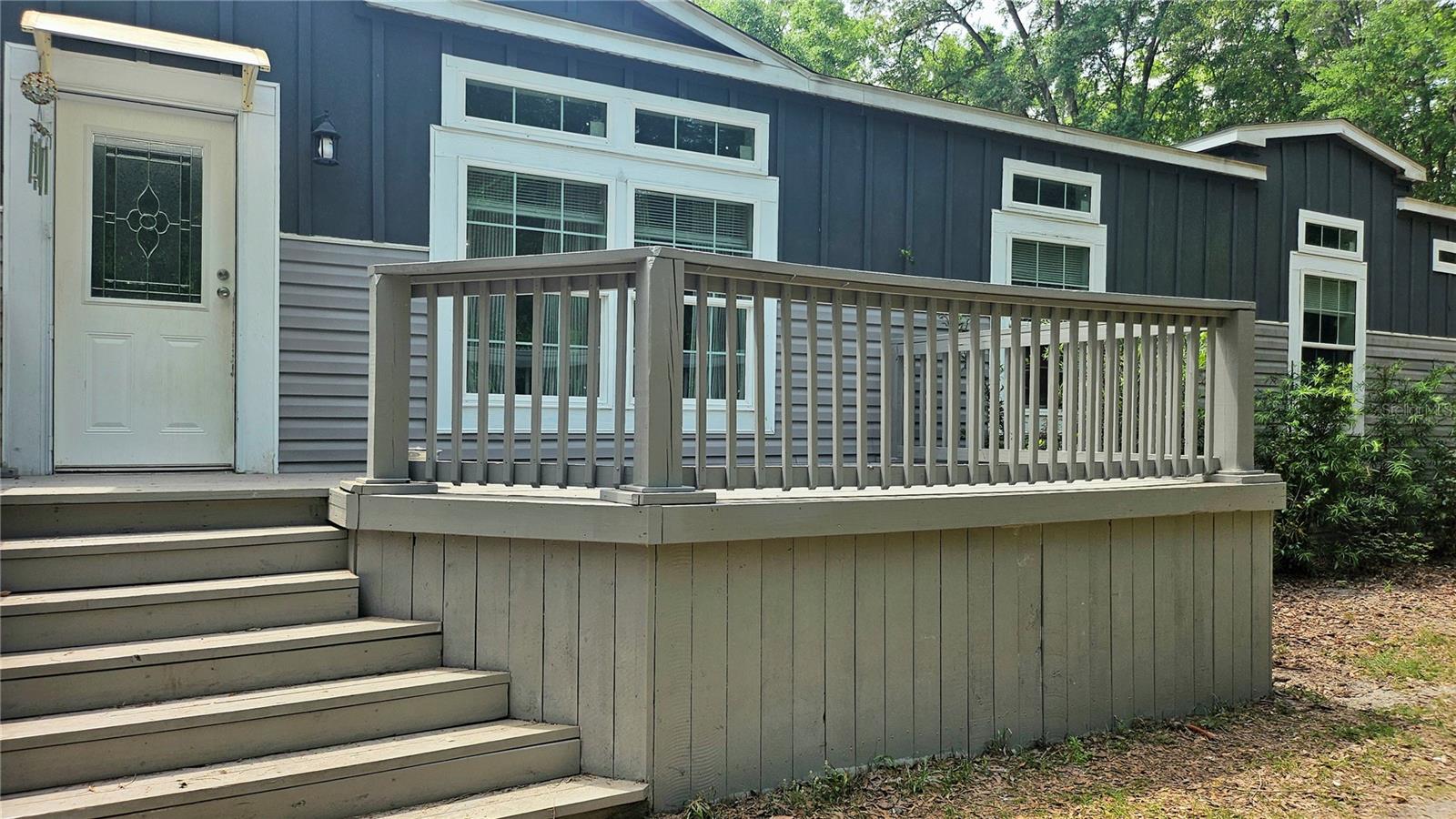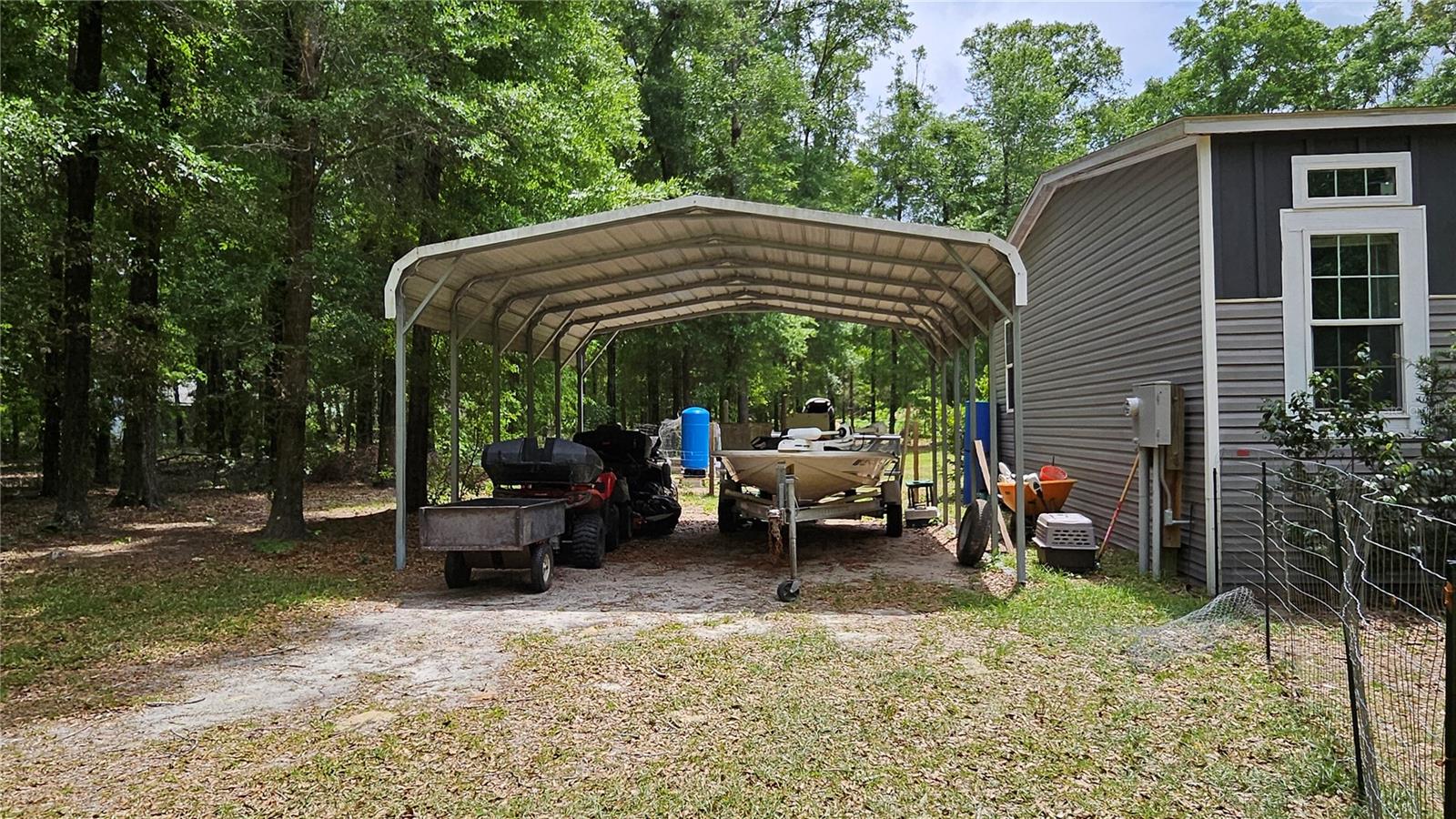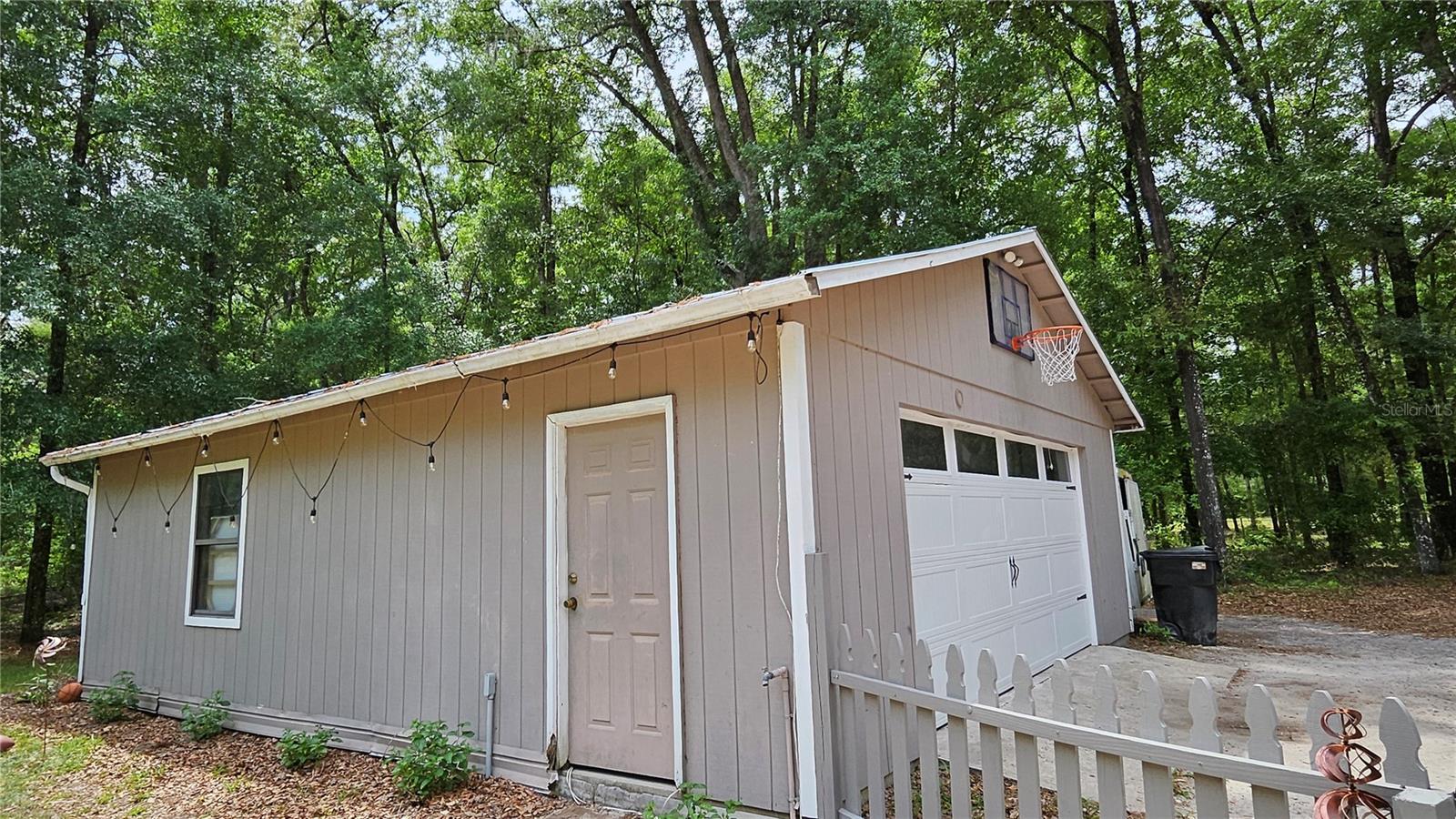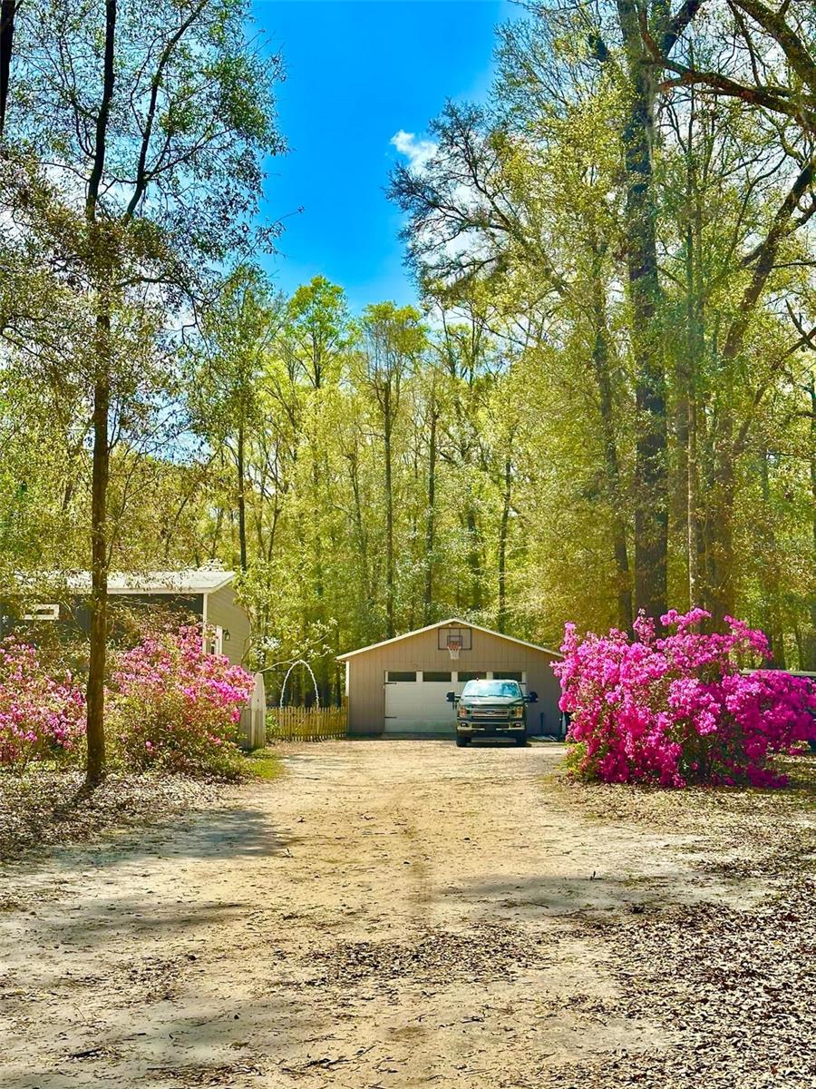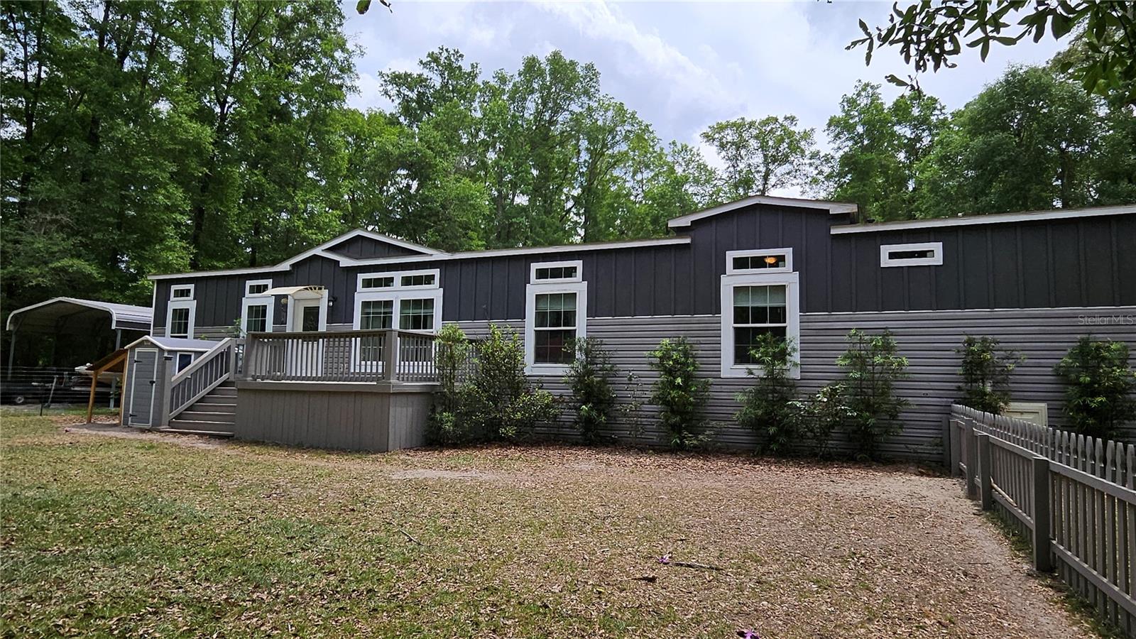 Experience the tranquility of modern country living in this spacious 4-bedroom, 2-bathroom, 2020 home, boasting 2,280 square feet, all situated on over 6 private wooded acres. Centrally located between Gainesville, Alachua, and Newberry, this home is only 15 minutes from everything and completely move-in ready. A convenient circular driveway leads to an oversized detached 2-car garage on one side, and a covered metal carport on the other that is perfect for your boat or utility vehicle. The large wooden deck at the front entrance welcomes you into the front living room, while a convenient side entrance provides access to a useful mudroom with a utility sink. Inside, you'll find plenty of relaxation spaces to unwind. The home feels expansive and open, thanks to 9-foot ceilings and transom windows that flood the area with natural light. The well-lit front living room seamlessly flows into the kitchen, making entertaining a breeze. The spacious central family room features a cozy wood-burning fireplace, perfect for gatherings. The open kitchen is designed for convenience and entertaining, featuring an oversized custom island with a bar, upgraded appliances, a stainless steel farmhouse sink, double-stacked cabinets, abundant counter space, a full-height pantry, and a utility closet. The generously sized master bedroom is filled with sunlight from large windows and offers a luxurious retreat with its spacious spa-like ensuite bathroom, complete with a garden tub and a luxury walk-in shower. This well-designed split floor plan features three inviting guest bedrooms on the opposite side of the home, ensuring privacy. Accessible from the family room, the space includes a beautifully upgraded full guest bathroom with a luxurious garden tub and shower combination, along with a stylish dual vanity with two sinks. Step outside to the comfortable, covered back patio, equipped with an oversized ceiling fan, offering an ideal outdoor relaxation space. You can fully immerse yourself in nature by walking the footpaths or riding ATVs on the trails that wind through the wooded property.