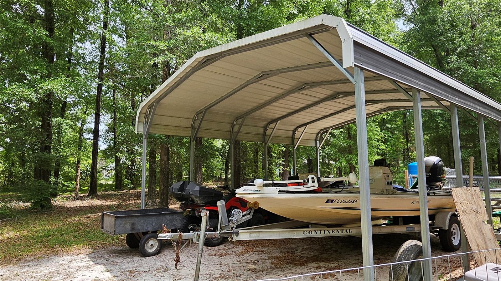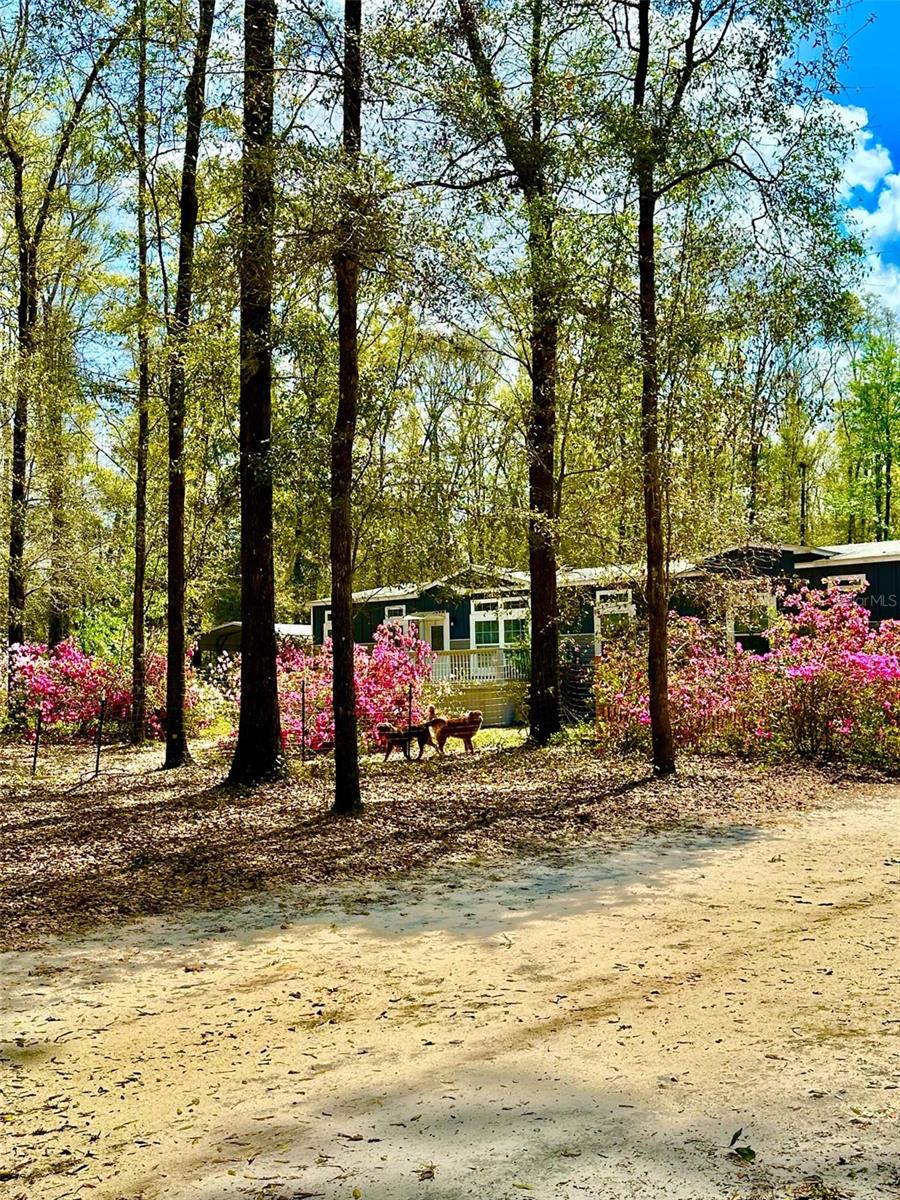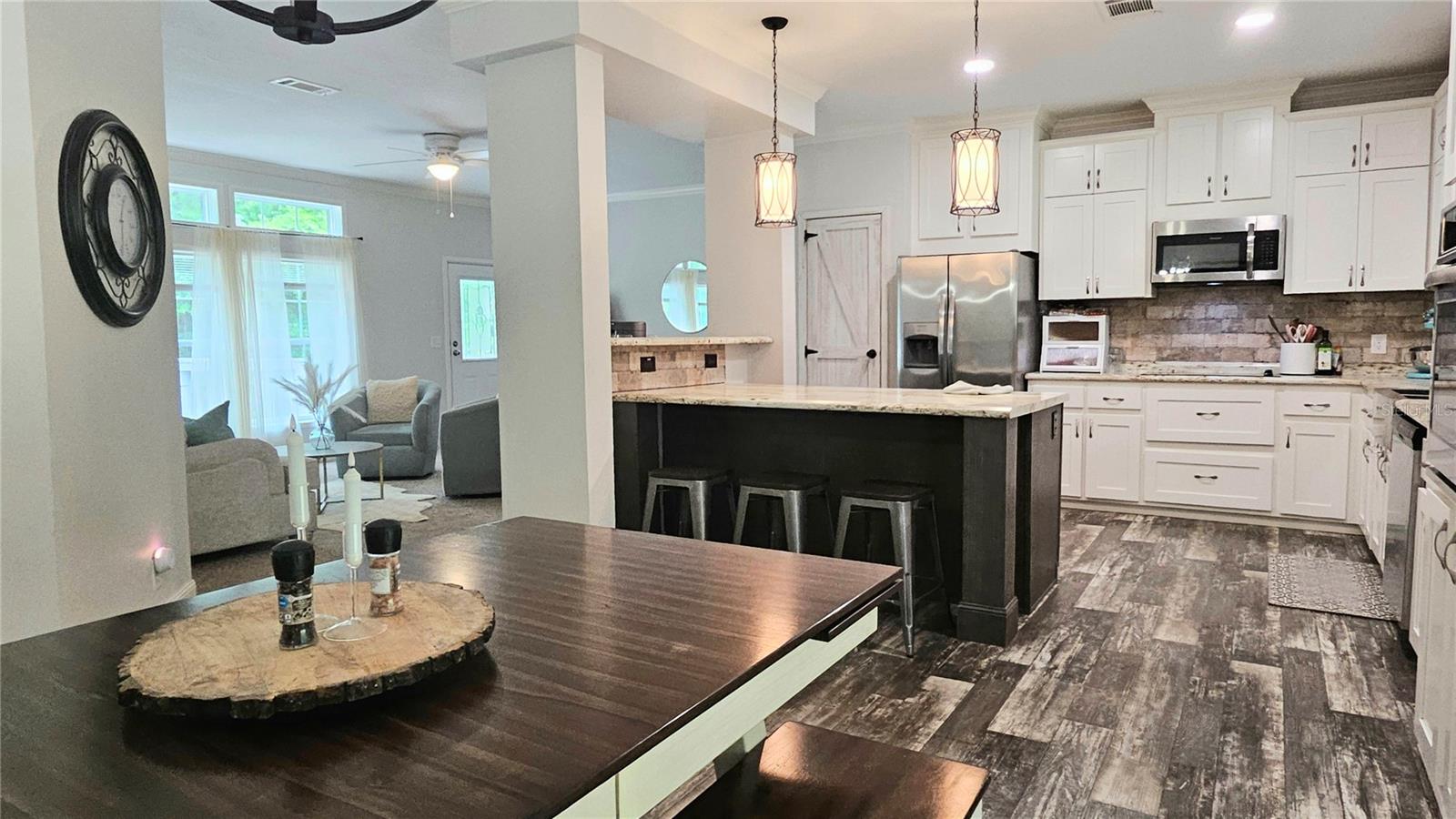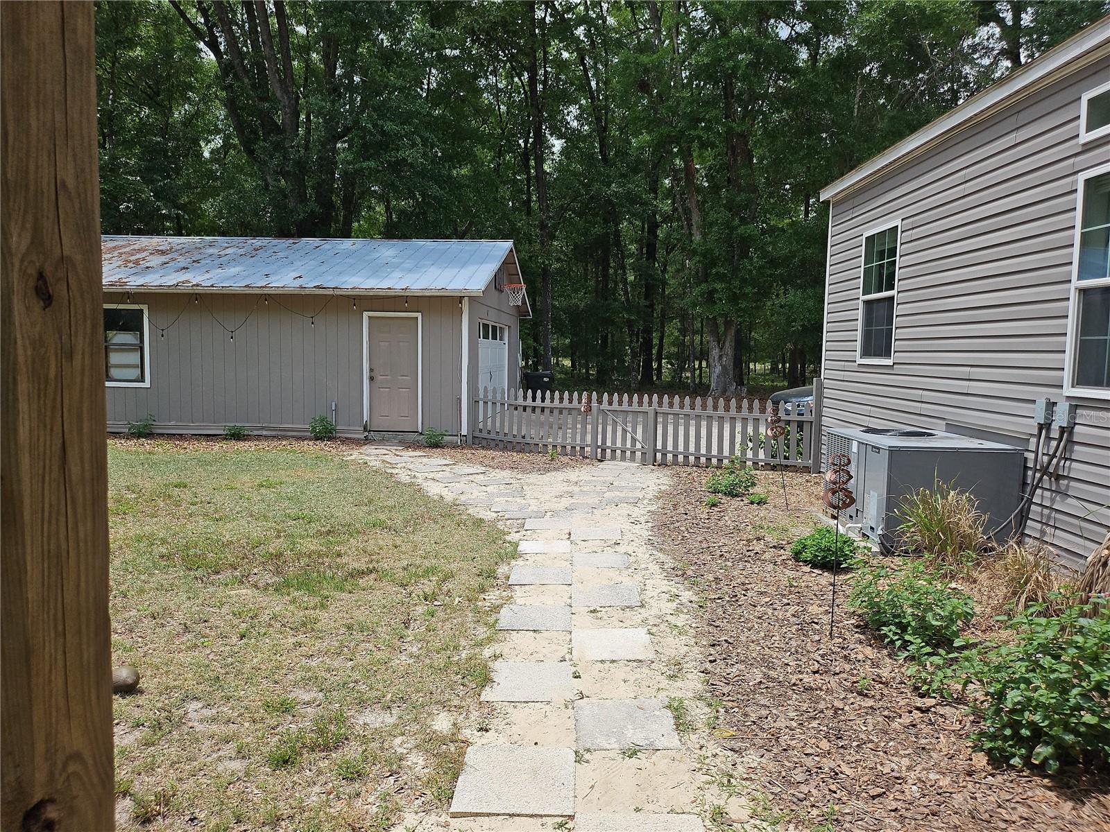 Experience the tranquility of modern country living in this spacious 4-bedroom, 2-bathroom, 2020 home, boasting 2,280 square feet, all situated on over 6 private wooded acres. Centrally located between Gainesville, Alachua, and Newberry, this home is only 15 minutes from everything and completely move-in ready. A convenient circular driveway leads to an oversized detached 2-car garage on one side, and a covered metal carport on the other that is perfect for your boat or utility vehicle. The large wooden deck at the front entrance welcomes you into the front living room, while a convenient side entrance provides access to a useful mudroom with a utility sink. Inside, you'll find plenty of relaxation spaces to unwind. The home feels expansive and open, thanks to 9-foot ceilings and transom windows that flood the area with natural light. The well-lit front living room seamlessly flows into the kitchen, making entertaining a breeze. The spacious central family room features a cozy wood-burning fireplace, perfect for gatherings. The open kitchen is designed for convenience and entertaining, featuring an oversized custom island with a bar, upgraded appliances, a stainless steel farmhouse sink, double-stacked cabinets, abundant counter space, a full-height pantry, and a utility closet. The generously sized master bedroom is filled with sunlight from large windows and offers a luxurious retreat with its spacious spa-like ensuite bathroom, complete with a garden tub and a luxury walk-in shower. This well-designed split floor plan features three inviting guest bedrooms on the opposite side of the home, ensuring privacy. Accessible from the family room, the space includes a beautifully upgraded full guest bathroom with a luxurious garden tub and shower combination, along with a stylish dual vanity with two sinks. Step outside to the comfortable, covered back patio, equipped with an oversized ceiling fan, offering an ideal outdoor relaxation space. You can fully immerse yourself in nature by walking the footpaths or riding ATVs on the trails that wind through the wooded property.