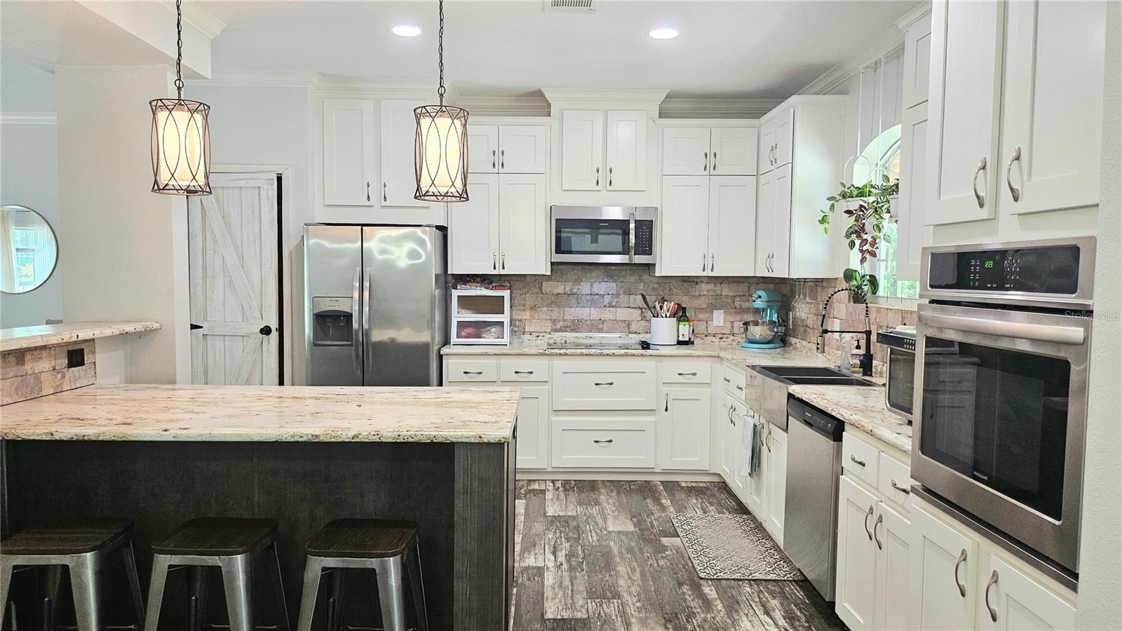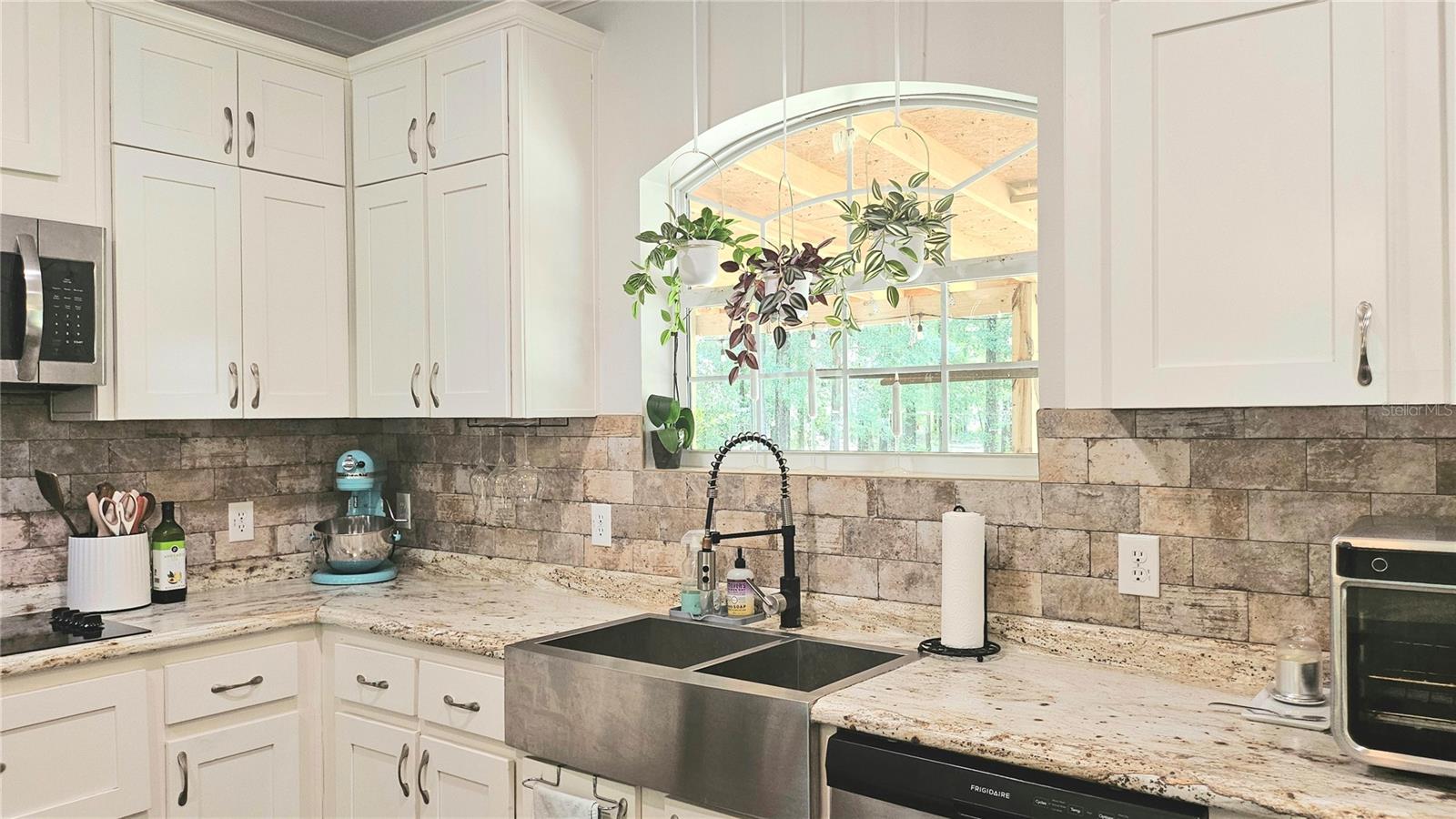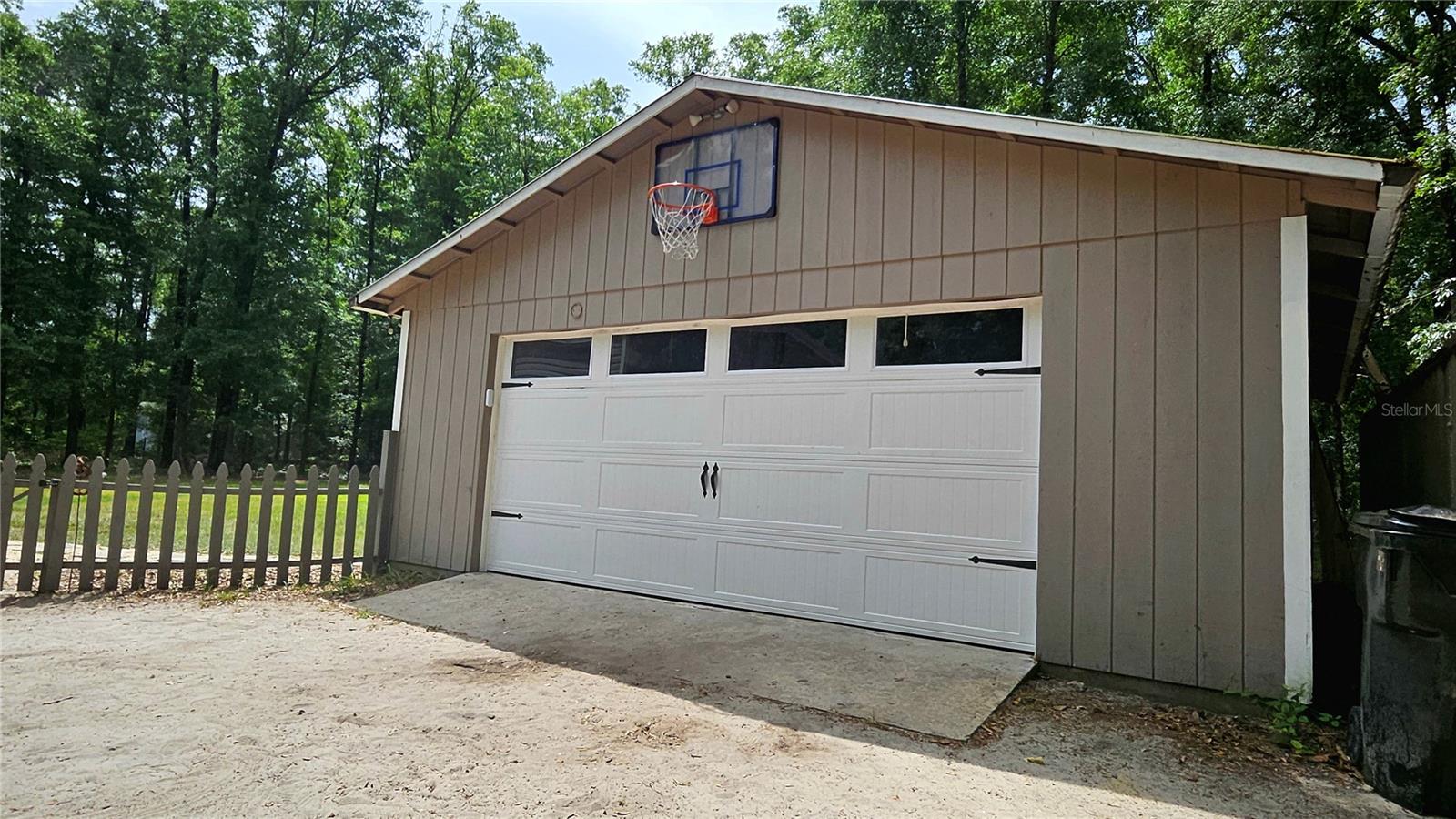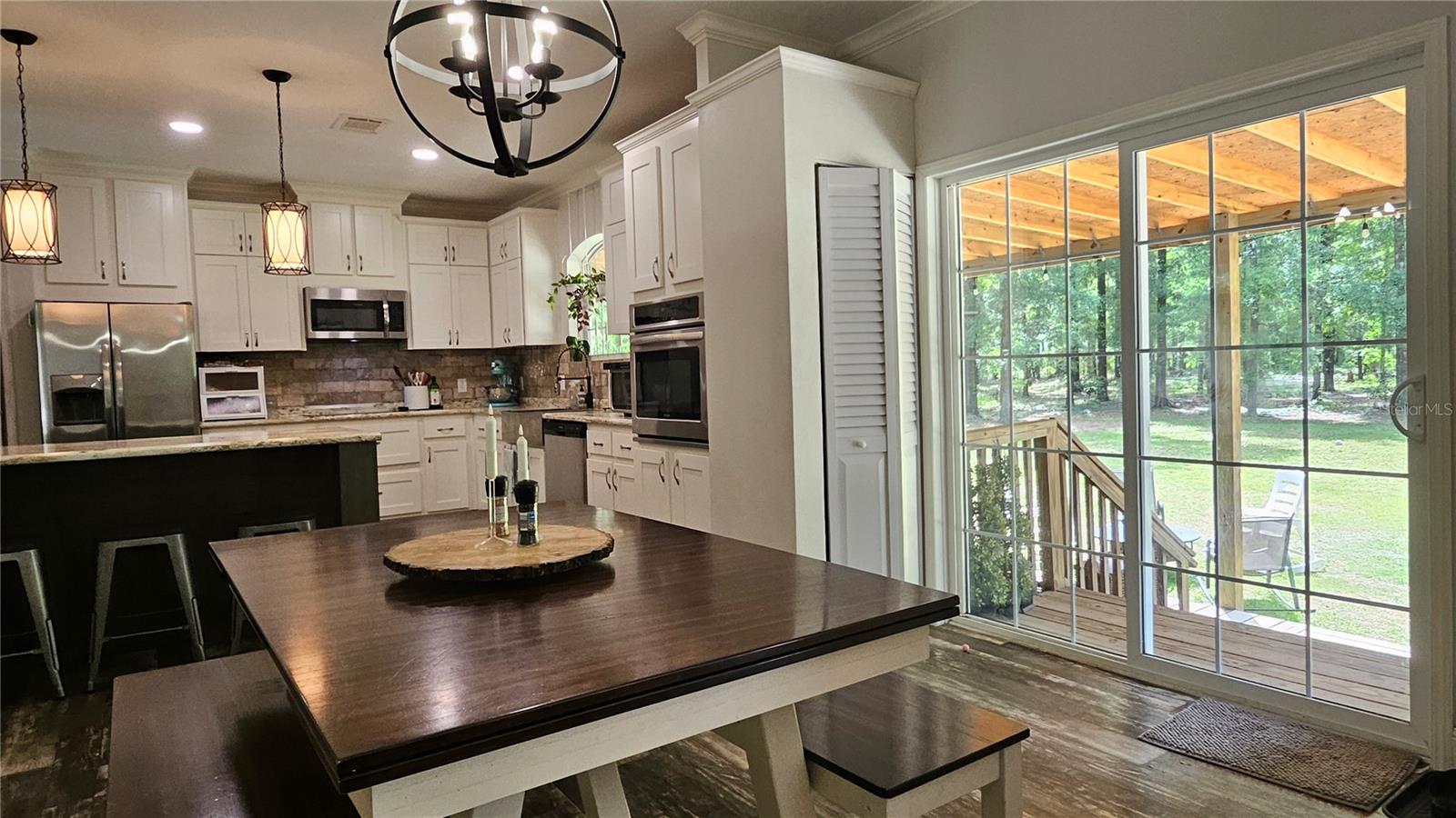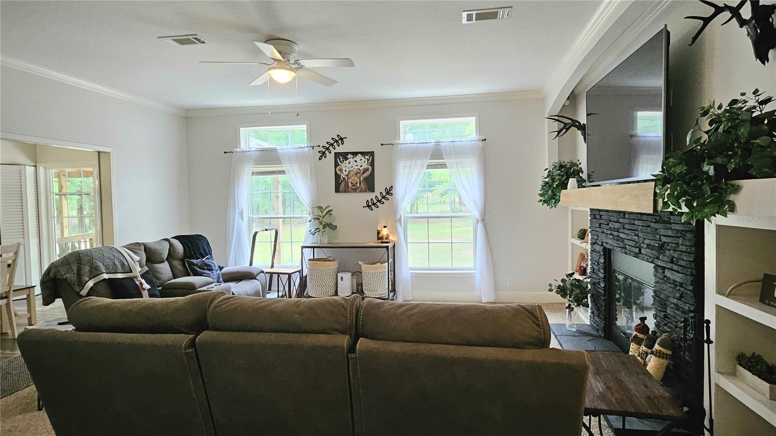 Experience the tranquility of modern country living in this spacious 4-bedroom, 2-bathroom, 2020 home, boasting 2,280 square feet, all situated on over 6 private wooded acres. Centrally located between Gainesville, Alachua, and Newberry, this home is only 15 minutes from everything and completely move-in ready. A convenient circular driveway leads to an oversized detached 2-car garage on one side, and a covered metal carport on the other that is perfect for your boat or utility vehicle. The large wooden deck at the front entrance welcomes you into the front living room, while a convenient side entrance provides access to a useful mudroom with a utility sink. Inside, you'll find plenty of relaxation spaces to unwind. The home feels expansive and open, thanks to 9-foot ceilings and transom windows that flood the area with natural light. The well-lit front living room seamlessly flows into the kitchen, making entertaining a breeze. The spacious central family room features a cozy wood-burning fireplace, perfect for gatherings. The open kitchen is designed for convenience and entertaining, featuring an oversized custom island with a bar, upgraded appliances, a stainless steel farmhouse sink, double-stacked cabinets, abundant counter space, a full-height pantry, and a utility closet. The generously sized master bedroom is filled with sunlight from large windows and offers a luxurious retreat with its spacious spa-like ensuite bathroom, complete with a garden tub and a luxury walk-in shower. This well-designed split floor plan features three inviting guest bedrooms on the opposite side of the home, ensuring privacy. Accessible from the family room, the space includes a beautifully upgraded full guest bathroom with a luxurious garden tub and shower combination, along with a stylish dual vanity with two sinks. Step outside to the comfortable, covered back patio, equipped with an oversized ceiling fan, offering an ideal outdoor relaxation space. You can fully immerse yourself in nature by walking the footpaths or riding ATVs on the trails that wind through the wooded property.