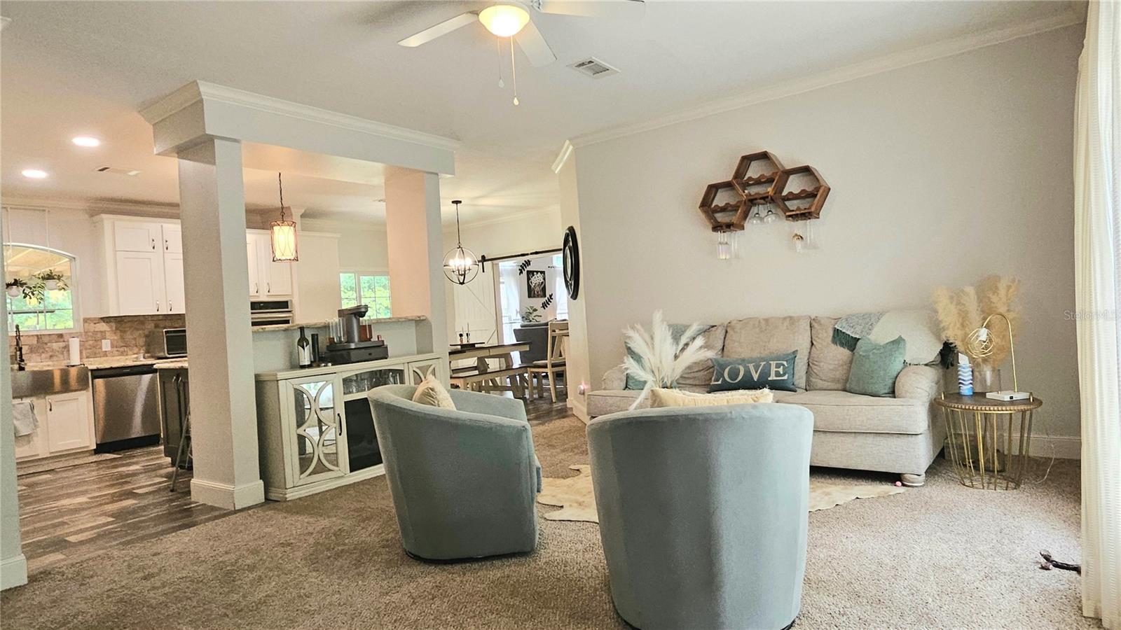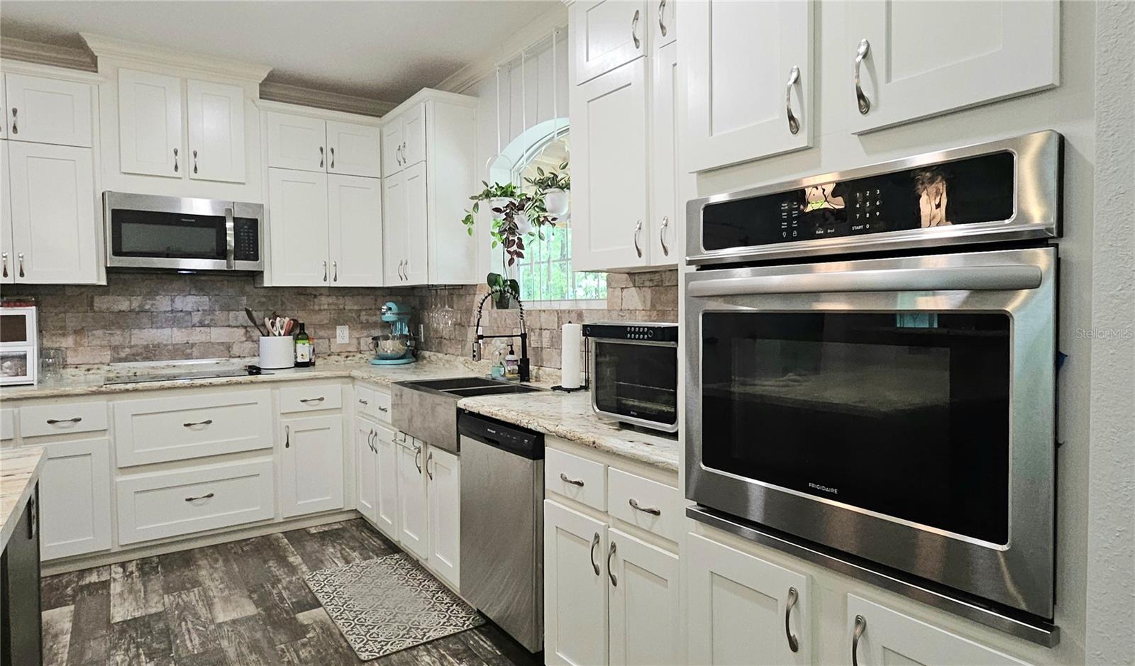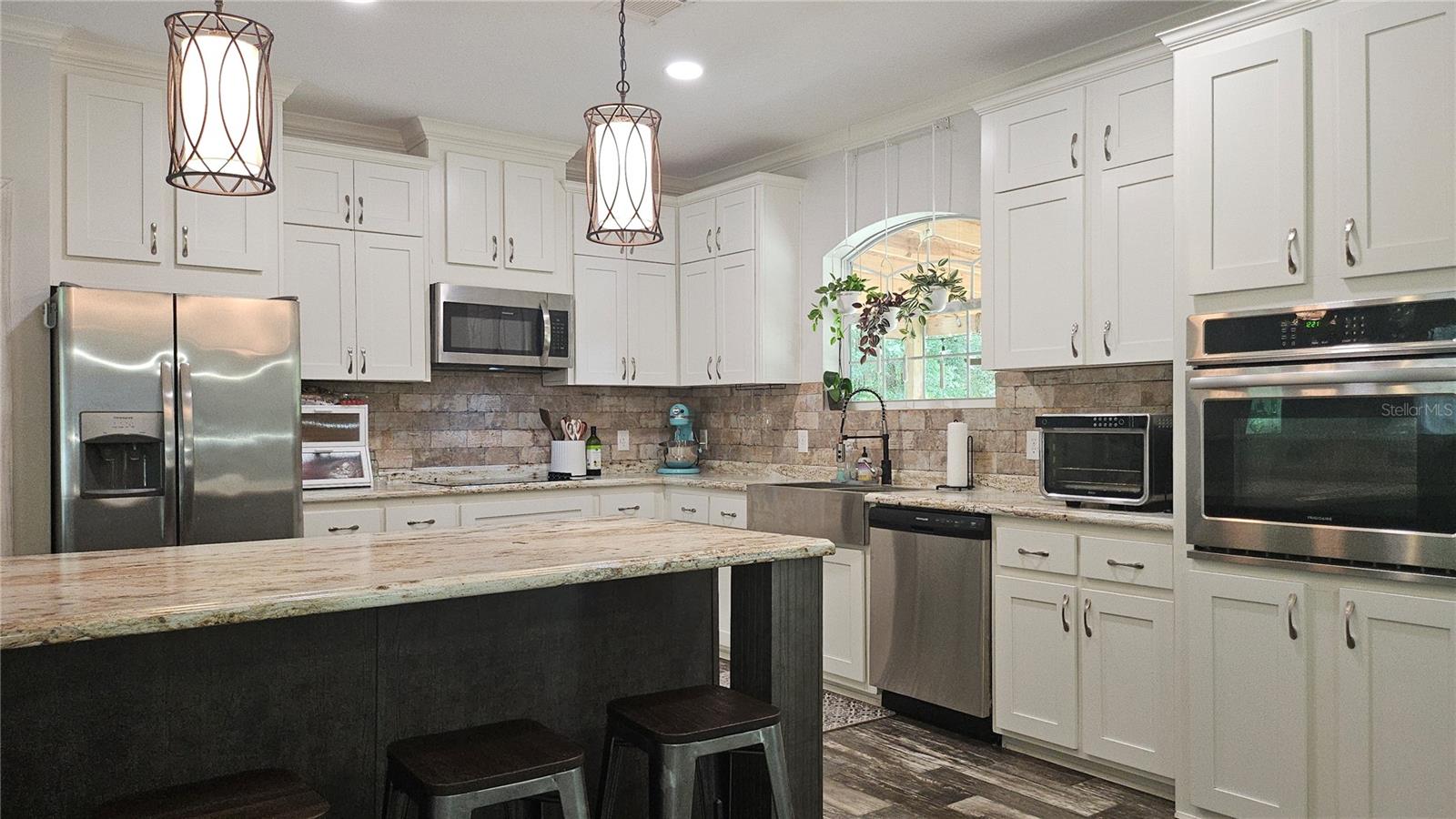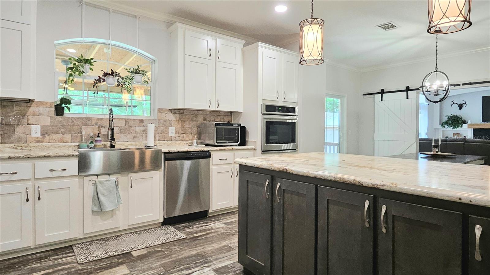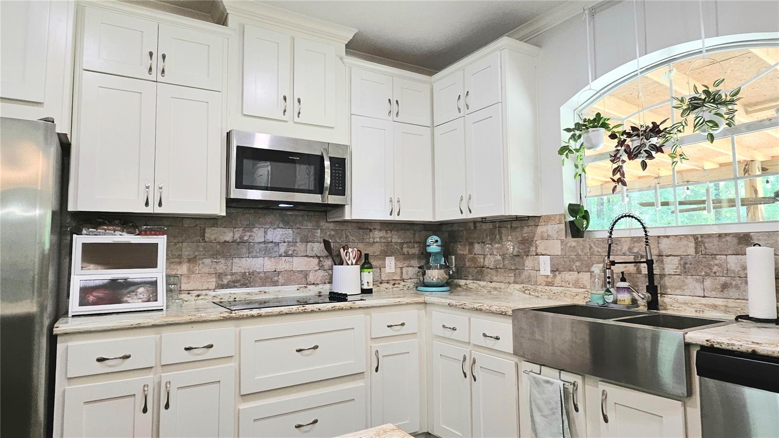 Experience the tranquility of modern country living in this spacious 4-bedroom, 2-bathroom, 2020 home, boasting 2,280 square feet, all situated on over 6 private wooded acres. Centrally located between Gainesville, Alachua, and Newberry, this home is only 15 minutes from everything and completely move-in ready. A convenient circular driveway leads to an oversized detached 2-car garage on one side, and a covered metal carport on the other that is perfect for your boat or utility vehicle. The large wooden deck at the front entrance welcomes you into the front living room, while a convenient side entrance provides access to a useful mudroom with a utility sink. Inside, you'll find plenty of relaxation spaces to unwind. The home feels expansive and open, thanks to 9-foot ceilings and transom windows that flood the area with natural light. The well-lit front living room seamlessly flows into the kitchen, making entertaining a breeze. The spacious central family room features a cozy wood-burning fireplace, perfect for gatherings. The open kitchen is designed for convenience and entertaining, featuring an oversized custom island with a bar, upgraded appliances, a stainless steel farmhouse sink, double-stacked cabinets, abundant counter space, a full-height pantry, and a utility closet. The generously sized master bedroom is filled with sunlight from large windows and offers a luxurious retreat with its spacious spa-like ensuite bathroom, complete with a garden tub and a luxury walk-in shower. This well-designed split floor plan features three inviting guest bedrooms on the opposite side of the home, ensuring privacy. Accessible from the family room, the space includes a beautifully upgraded full guest bathroom with a luxurious garden tub and shower combination, along with a stylish dual vanity with two sinks. Step outside to the comfortable, covered back patio, equipped with an oversized ceiling fan, offering an ideal outdoor relaxation space. You can fully immerse yourself in nature by walking the footpaths or riding ATVs on the trails that wind through the wooded property.
