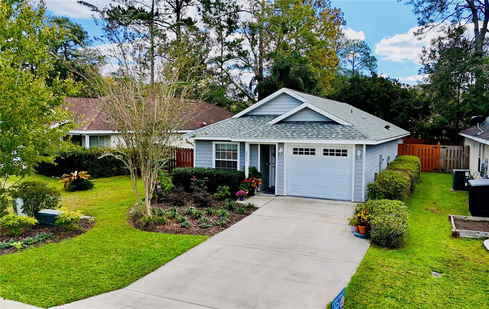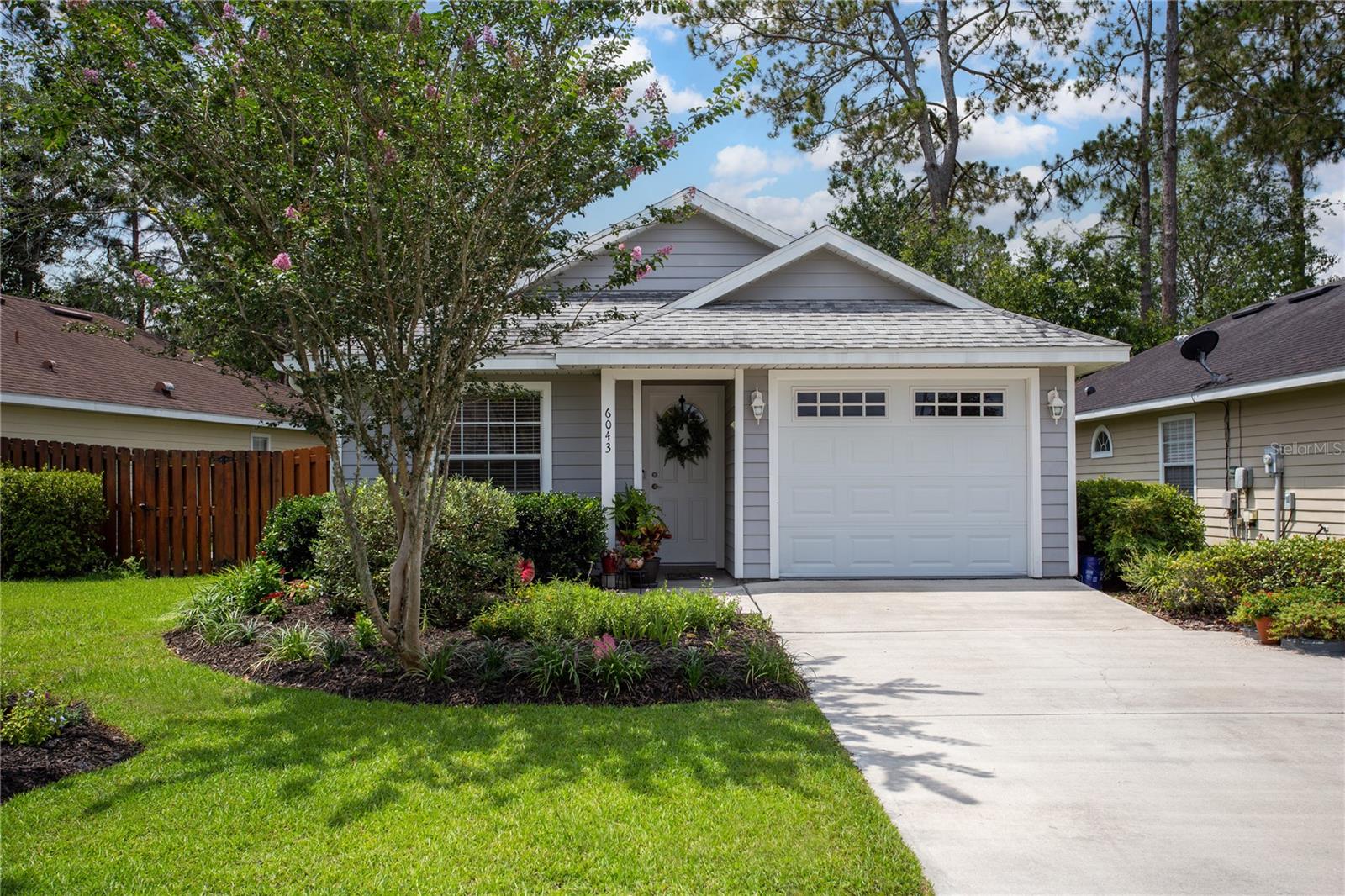 Welcome to your enchanting cottage-style oasis, a beautiful three-bedroom, two-bath garden home that offers a tranquil retreat within a vibrant community. As you step through the stunning glass insert front door, you're greeted by a bright foyer that leads to elegant French doors, inviting you to the serene brick patio—perfect for mornings and lively gatherings. This thoughtfully designed split-plan layout features two cozy bedrooms at the front of the home, separated by a stylish bathroom, while the spacious primary bedroom, overlooking the lush garden, provides a tranquil escape. The newly renovated primary bathroom shower adds an elegant touch to your private sanctuary. The outdoor space is spectacular, highlighted by a thoughtfully landscaped yard adorned with native flowering plants that attract butterflies and songbirds, creating a peaceful environment. Enjoy your morning coffee or host friends on the charming brick garden patio in your secluded backyard. This home is loaded with remarkable upgrades: a new roof (2023), modern stainless steel kitchen appliances (2024), upgraded cabinetry in the laundry room and primary closet, and a newly installed water softener. Gorgeous ceramic tile flows through the kitchen, bathrooms, and laundry room, while inviting vinyl wood flooring warms the living areas and bedrooms. The kitchen features a convenient breakfast bar overlooking the dining area and a bright living room filled with natural light. As part of an active neighborhood, indulge in amenities like pickleball, golf, swimming, and an abundance of scenic hiking trails nearby. Enjoy easy access to San Felasco State Park and Devils Millhopper, along with close proximity to shopping and healthcare facilities. Don’t miss the opportunity to make this charming, enchanting garden home your own—a perfect blend of comfort, style, and an incredible lifestyle awaits! Seller is a licensed realtor