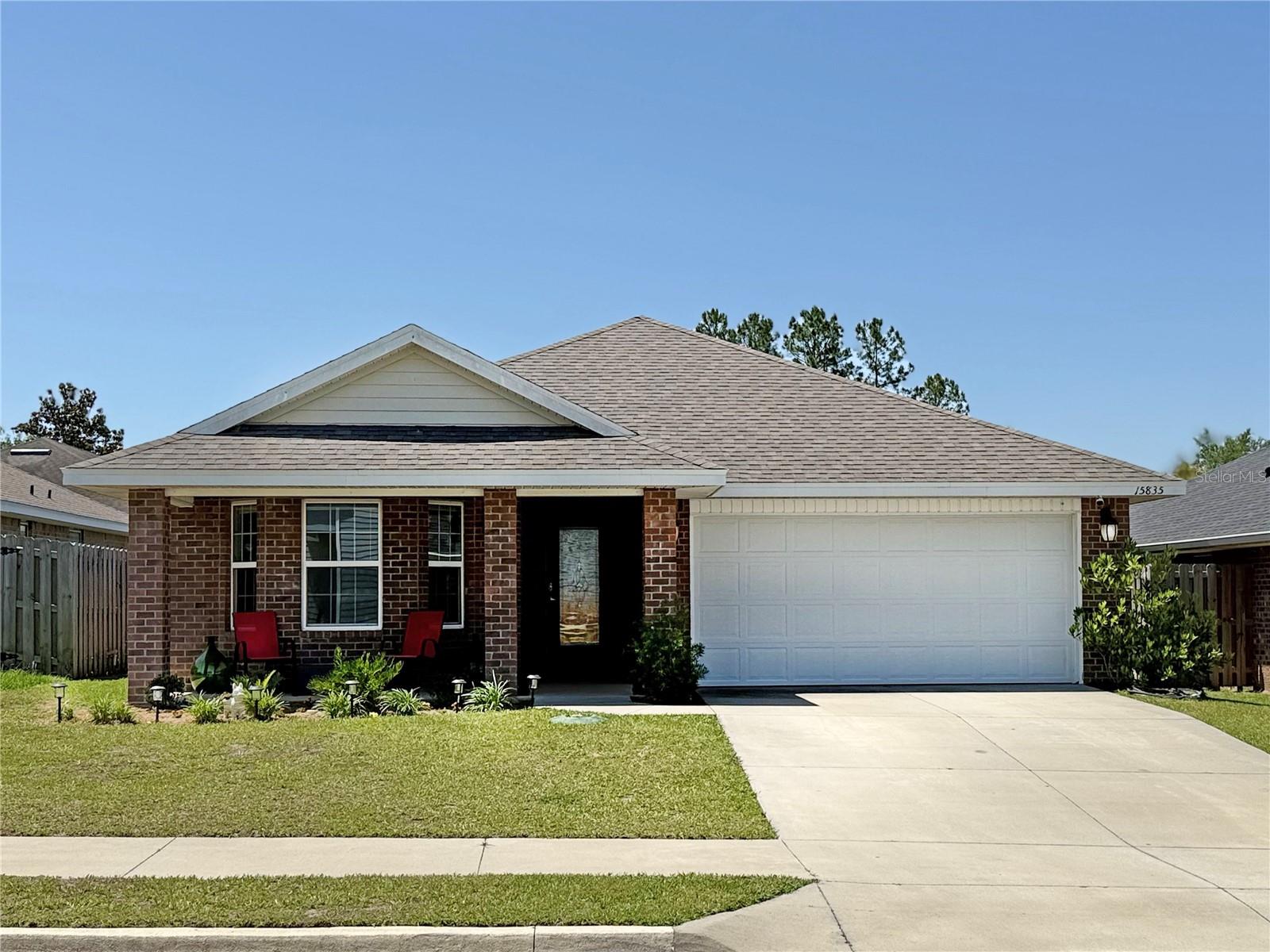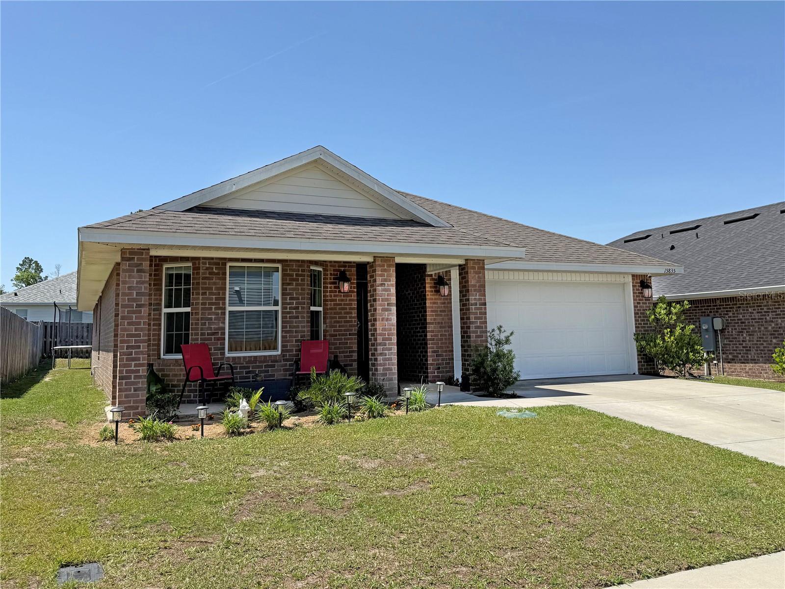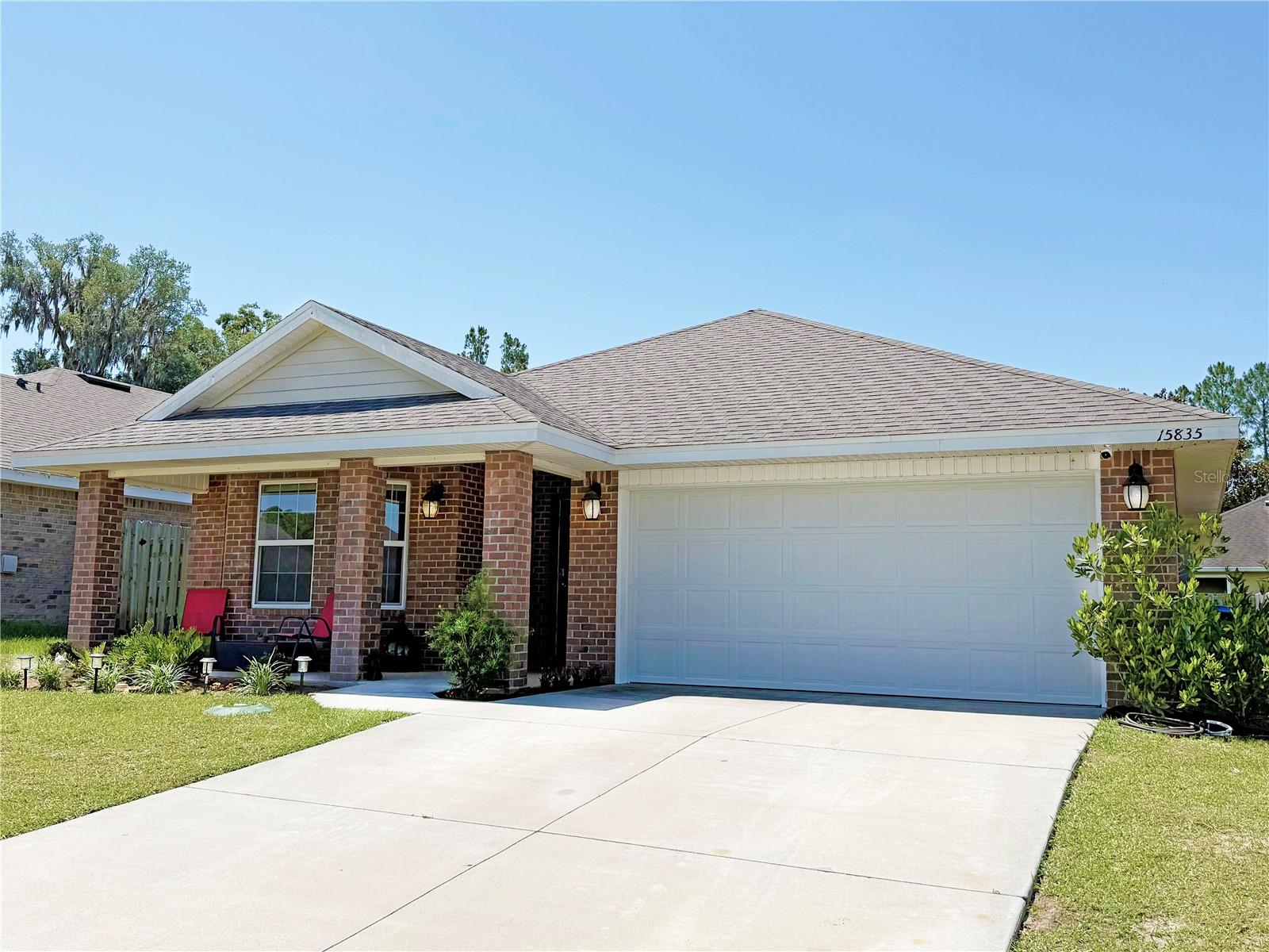 PRICE DROPPED. MILITARY MOVE requires fast sale of 2021 Adams Model Home. 3BR/2BA brick *no painting maintenance* 1,512 sq ft HC (2,093 sq ft UR) vaulted/sloped ceilings in the home add to sense of space. It's a split floorpan with ensuite master bath. Two covered porches (front & back), each with room for chairs and table. The open concept floor plan provides plenty of natural light. The plan combines the family room to the kitchen to dining, to the covered porch back yard. The kitchen has sloped ceiling, granite look formica counters, closet pantry, S/S appliances, with stainless sink, garbage disposal and center isle for eating and food prep. Lots of cabinets for storage of kitchen tools and utensils. Sharing the openness with kitchen is the family/great room with extra big window, also a sloped ceiling. This framing detail is not often seen, as it ads materials cost and framer know-how, but it really adds to the spacious feeling over all. The roomy master suite is a private retreat with large en-suite bath, two vanities, glass and tiled shower, like new garden tub, and the private potty room. Bath also has a sloped ceiling making for a robust, big & tall feel. Bedroom #2 has the bay window for extra space and creative decorating. Hall bath has tub/shower combo, tiled floors and good sized sink. Brushed Nicklel faucets and fixtures throughout the house, with abundant recessed LED lighting. Bedroom #3 has another sloped ceiling, instrumental in creating a cozy, roomy bedroom space. Hall laundry/utility room with a tech panel for the prewired security system that can be initiated by new owners. The return closet has the Carrier AC unit in is this room, affording a quieter living space, set up high for easy filter change and monthly bleach drop. Outside, the 3/4 wrapped wooden privacy fenced-in backyard was perfect for sellers big dogs. This yard is a clean pallet; good for the minimalist who does not want vegetation maintenance, or it's ready for your own landscape & garden design, which can become your biggest investment to a property. The sky is the limit here to enjoy the Florida outdoors in your own private, natural space the way you want it. Savannah Station offers a nice playground area and; new clubhouse and pool currently under construction. Well maintained sidewalks for walks or jogs throughout the neighborhood. This is a well established friendly, close-knit community. Minutes to Downtown Alachua, High Springs and Gainesville: shops, restaurants, schools, businesses. Florida natural springs & rivers just minutes drive. Alachua is “The Good Life Community” and one of the largest bio life sciences work sectors in FL. VIRTUAL TOUR: https://www.youtube.com/watch?v=vM8f78cV4R8