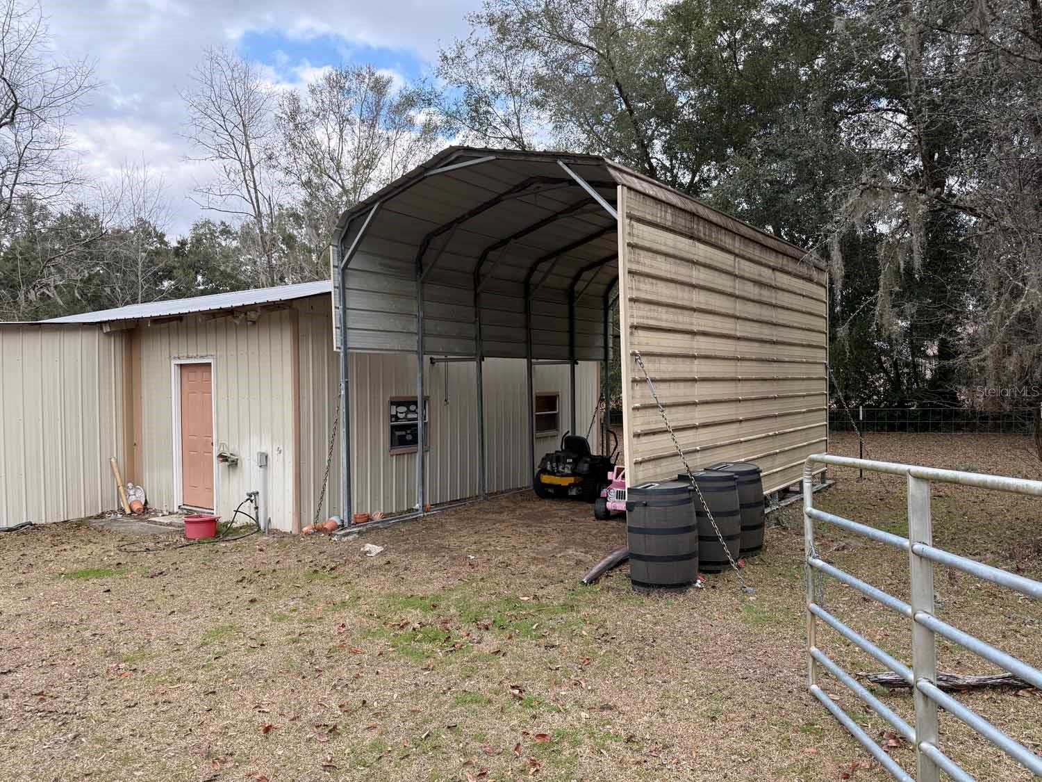 Beautiful Five Acre lot in Alachua Highlands Subdivision located close to the City of Alachua and accessed along CR-241 (NW 140th Street). The parcel has perimeter fencing with a rear paddock and fenced in back yard behind the house. House features a new metal roof with a brick exterior and additionally has a screened-in porch at the rear with an open porch on the front f the house. Inside is a tiled foryer with a living room that features a high ceiling, a fireplace, and wooden floor. The main bedroom has a a walk-in closet, french doors to the rear porch and a walk-in closet. The master bathroom has tiled floor with double sink vanity, a walk-in closet, and a toilet closet. On the other side of the house are two bedrooms with one bathroom and a large laundry room. The house also features a dining room adjacent to the kitchen. In the kitchen there is a large area on each side with sufficient countertop for preperation along with cabinets, a refrigerator, a stove, a dishwasher, and a microwave. The large garage feaures a two car garage and above there is a 14 foot by 18 foot storage area in the attic. At the rear of the lot there is a large pole building with corregated metal roof and exterior as well as a large, tall RV Carport. The entrance has brick pillars with a metal gate. The road to the house is paved in asphalt.