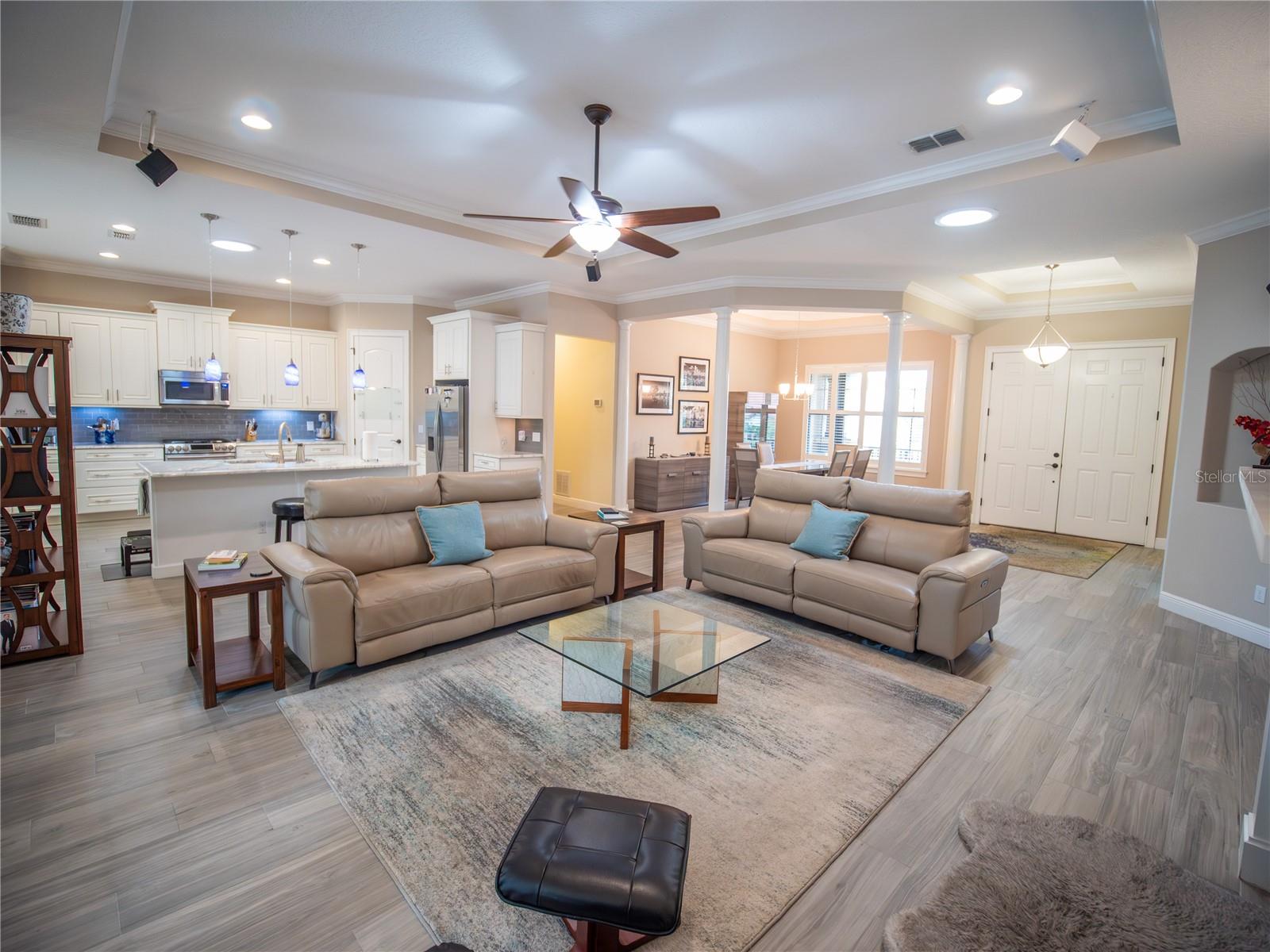 Step inside this home from anywhere! To experience a fully immersive walk-through of this home click on the Video or Virtual Tour button on this page. Nestled at the end of a quiet cul-de-sac within an exclusive six-home enclave, this impeccably designed five-bedroom, three-bath residence offers privacy, sophistication, and exceptional craftsmanship throughout. Striking curb appeal and lush surroundings set the tone as you arrive, while the charming covered front porch invites you to unwind and enjoy tranquil Florida evenings. Step inside to a light-filled, open-concept floor plan showcasing the builder’s premium upgrades at every turn. Porcelain tile flooring, soaring ceilings, and an elegant tray-ceiling foyer create an immediate sense of grandeur. Double doors lead to a private office with ceiling fan and closet—ideal for a home office or flex space—while the formal dining room opposite features tray ceilings and crown molding, perfect for hosting memorable dinners. The heart of the home is the expansive great room, highlighted by a tray ceiling, gas fireplace, custom built-in shelving, and in-ceiling surround sound wiring—an inviting space for everyday living or movie nights. Seamlessly connected, the chef’s kitchen is designed to impress with 42-inch cabinetry, soft-close drawers, under-cabinet lighting, premium granite countertops, a large center island, classic subway tile backsplash, and stainless steel appliances including a gas range—ideal for entertaining and holiday gatherings. The oversized primary suite is a true retreat, offering porcelain tile floors, tray ceilings, and spacious his-and-her closets. The spa-inspired en-suite bath features dual granite vanities with a cabinet tower, a luxurious soaking tub, and a large glass-enclosed walk-in shower. Three additional generously sized bedrooms are complemented by two beautifully appointed bathrooms with granite countertops—one with a walk-in glass-enclosed tile shower and another with a tiled tub and shower combination. French doors open to your private outdoor oasis: a screened-in patio with a covered paver lanai and expansive deck overlooking a stunning saltwater pool with a cascading waterfall. The fully fenced backyard offers gated access on both sides, a 12x10 Tuffbuilt shed, an 11x11 open-air paver pad, and a full irrigation system with WiFi-enabled programmable controls. Additional luxury features include eight-foot doors and crown molding throughout, energy-efficient programmable thermostat with humidity control, double-pane Low-E windows, and foam-injected block insulation for enhanced comfort and efficiency. A spacious laundry room with sink, cabinetry, and counter space adds everyday convenience. The garage is equally impressive with epoxy flooring, a dedicated workbench alcove, two 4x8 ceiling-mounted SafetyRack storage systems, plus an additional paved and covered one-car parking space—perfect for recreational vehicles or toys. Completing this exceptional offering is a 24kW Generac whole-house generator with a dedicated propane tank for peace of mind. Ideally located near top-rated schools including Altamonte Elementary, Milwee Middle, and Lyman High School, and just minutes from I-4, Altamonte Mall, premier dining, and within walking distance to the scenic Cranes Roost Park—this home effortlessly blends luxury, functionality, and an unbeatable location.