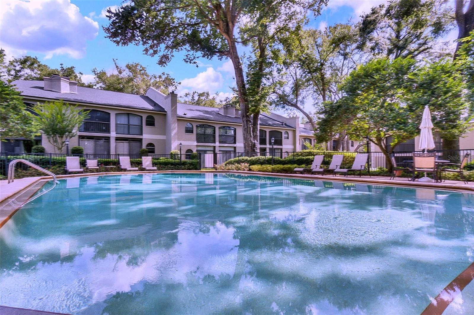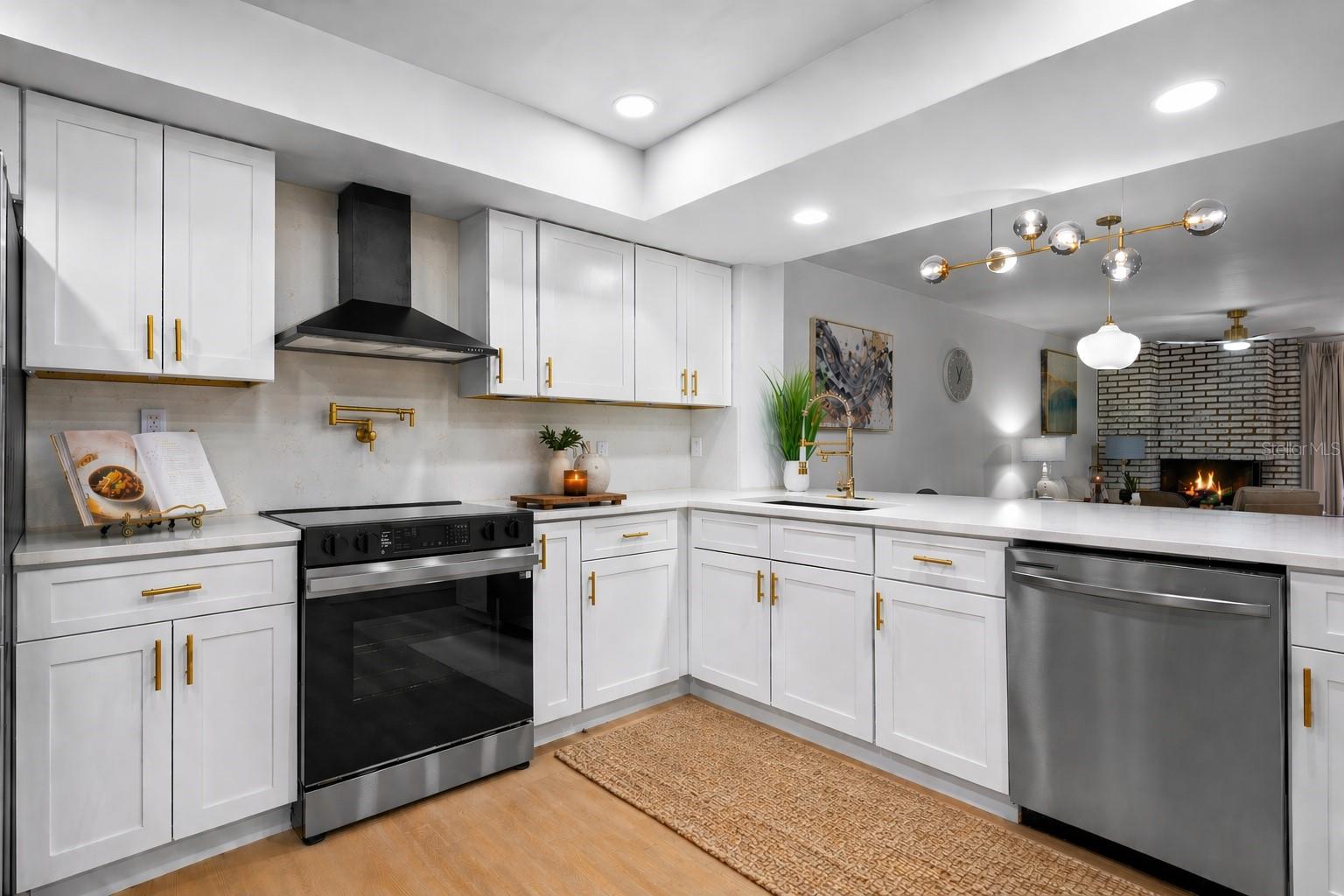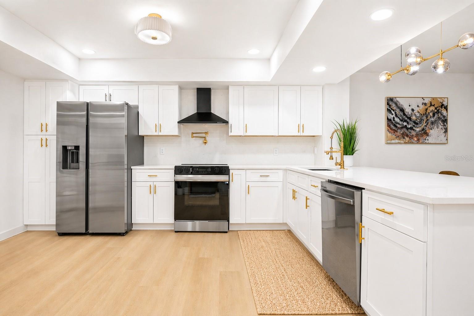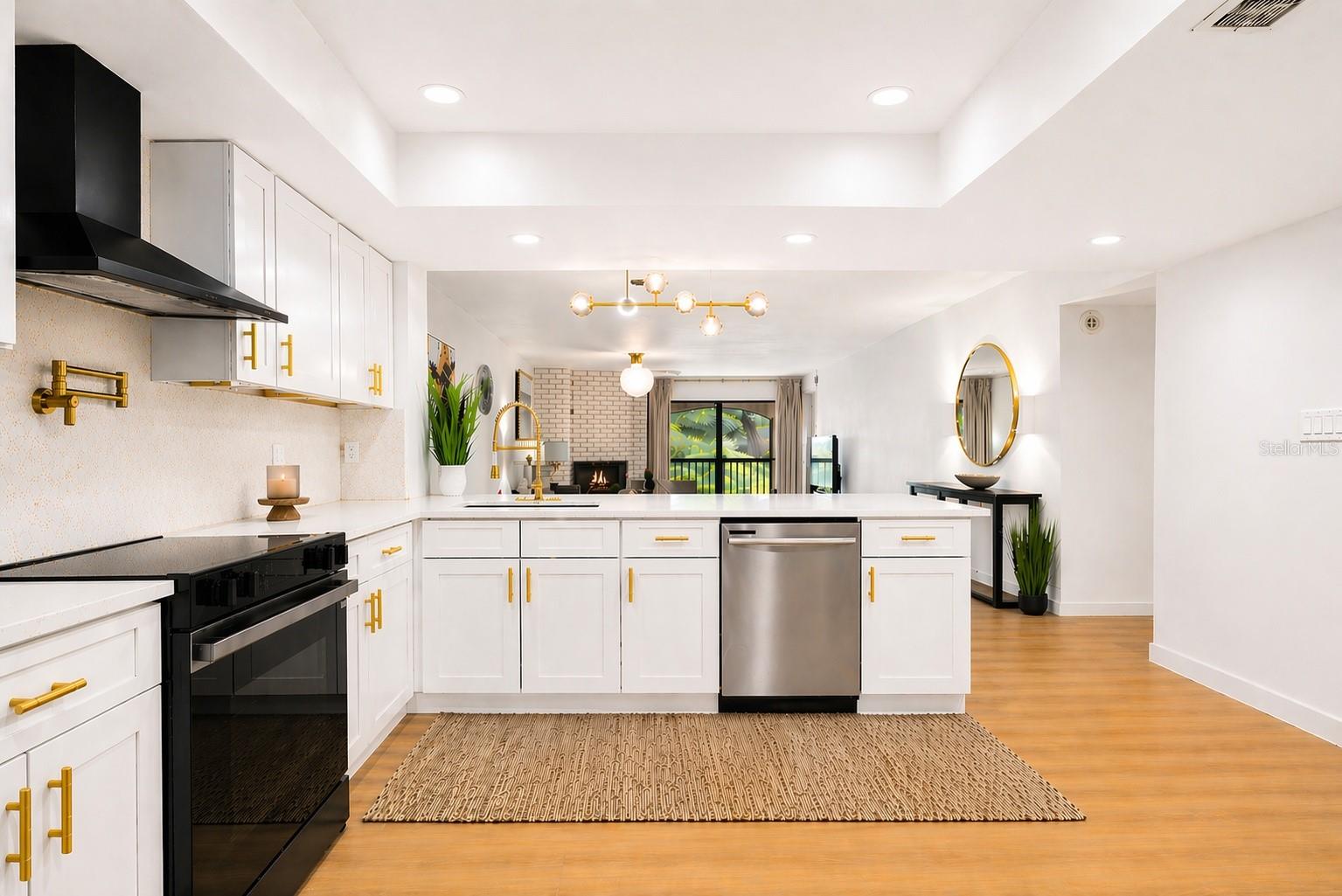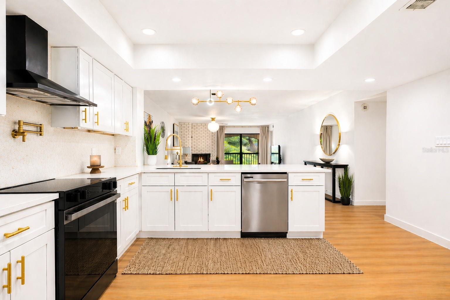 One or more photo(s) has been virtually staged. Welcome to this beautifully remodeled 2-bedroom, 2-bath condo offering a spacious and airy open-concept design. Natural light pours in through three large sliding glass doors, creating a bright and inviting atmosphere throughout. Light oak LVP flooring enhances the home with both style and durability, perfectly suited for everyday living. The kitchen is a true centerpiece, featuring expansive quartz countertops that extend seamlessly into the backsplash, a sleek modern range hood, pot filler over the range, stainless steel appliances, and a fashionable statement faucet. Designed for both function and style, the kitchen also opens to a charming front sitting area—perfect for casual dining or morning coffee. Enjoy exceptional indoor-outdoor living with multiple outdoor spaces ideal for relaxing or entertaining. The oversized screened-in back lanai overlooks the pool and is surrounded by mature live oaks, providing shade and a tranquil setting. The primary suite features a generous walk-in closet with abundant storage, a dedicated vanity area, and a beautifully updated ensuite bath. Both the ensuite and guest bathrooms showcase modern upgraded fixtures, stylish lighting, and warm neutral tile finishes. Additional highlights include designer lighting throughout, a brand-new in-unit washer and dryer for added convenience, a dedicated, assigned covered parking space, and the ease of true low-maintenance living. The HOA includes cable, internet, water, and trash for added convenience. Located within a gated community, residents enjoy access to resort-style amenities including two pools, a hot tub, sauna, clubhouse, fitness center, gym, tennis courts, and pickleball. Ideally situated close to shopping, dining, and everyday essentials, this home offers effortless Florida living in a prime location.