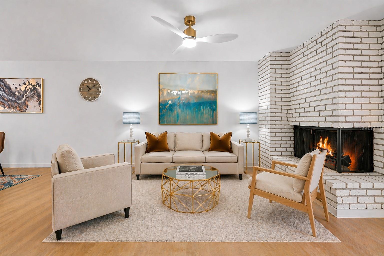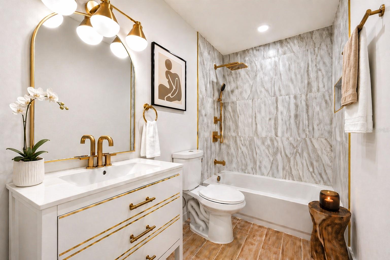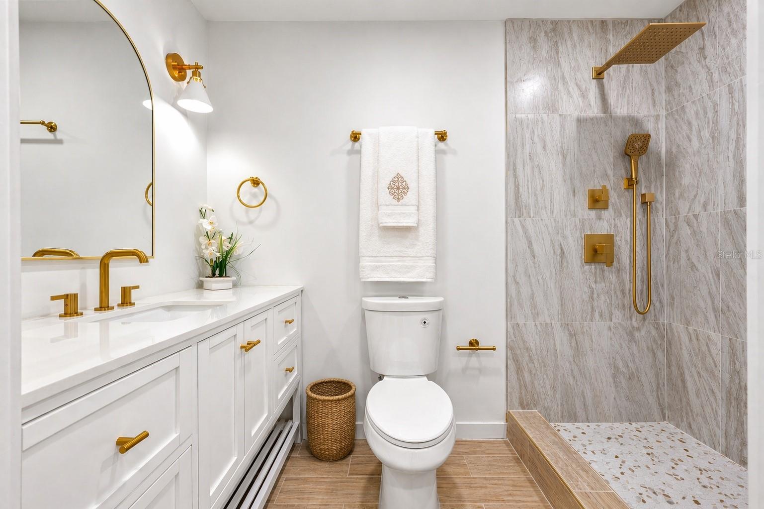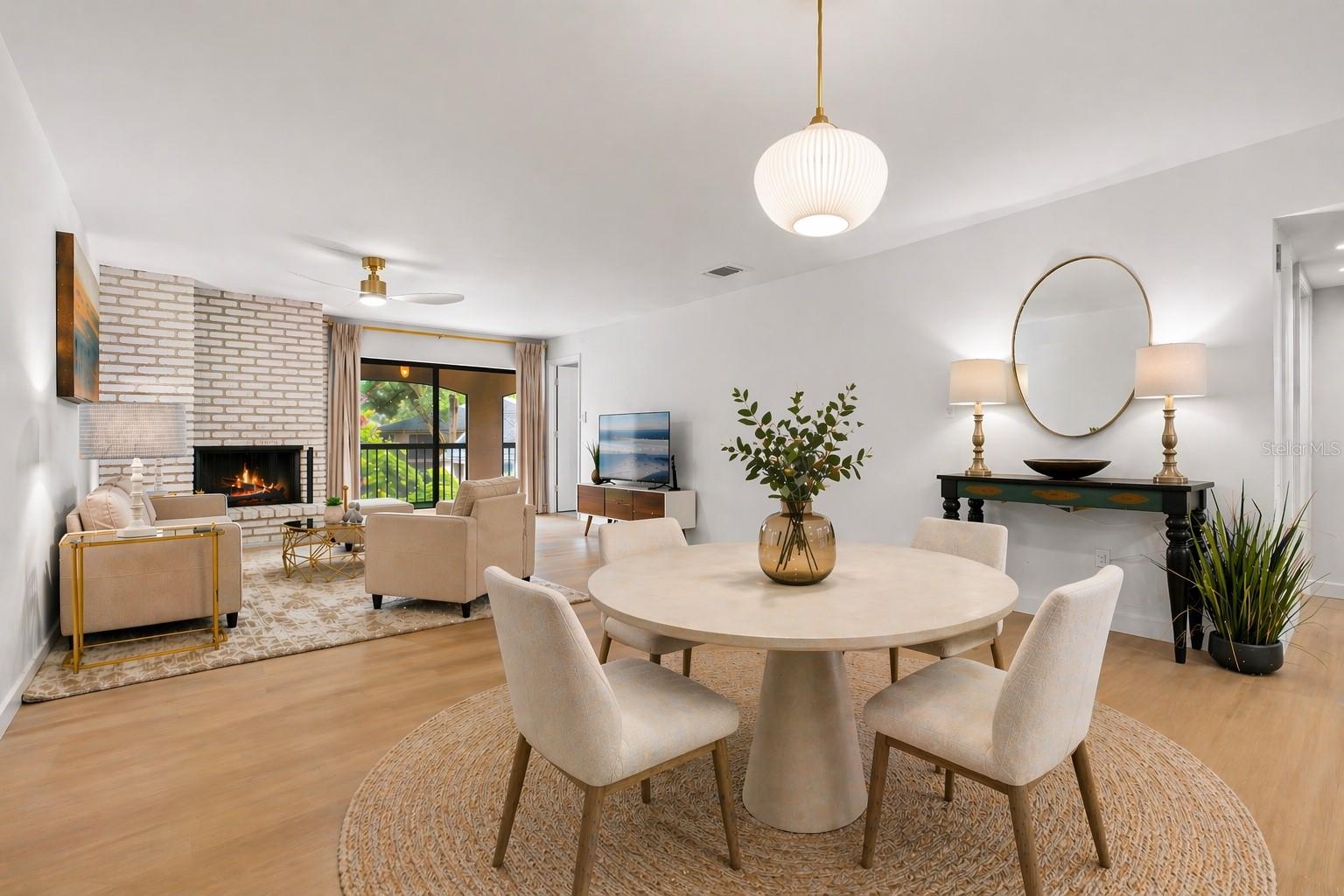 One or more photo(s) has been virtually staged. Welcome to this beautifully remodeled 2-bedroom, 2-bath condo offering a spacious and airy open-concept design. Natural light pours in through three large sliding glass doors, creating a bright and inviting atmosphere throughout. Light oak LVP flooring enhances the home with both style and durability, perfectly suited for everyday living. The kitchen is a true centerpiece, featuring expansive quartz countertops that extend seamlessly into the backsplash, a sleek modern range hood, pot filler over the range, stainless steel appliances, and a fashionable statement faucet. Designed for both function and style, the kitchen also opens to a charming front sitting area—perfect for casual dining or morning coffee. Enjoy exceptional indoor-outdoor living with multiple outdoor spaces ideal for relaxing or entertaining. The oversized screened-in back lanai overlooks the pool and is surrounded by mature live oaks, providing shade and a tranquil setting. The primary suite features a generous walk-in closet with abundant storage, a dedicated vanity area, and a beautifully updated ensuite bath. Both the ensuite and guest bathrooms showcase modern upgraded fixtures, stylish lighting, and warm neutral tile finishes. Additional highlights include designer lighting throughout, a brand-new in-unit washer and dryer for added convenience, a dedicated, assigned covered parking space, and the ease of true low-maintenance living. The HOA includes cable, internet, water, and trash for added convenience. Located within a gated community, residents enjoy access to resort-style amenities including two pools, a hot tub, sauna, clubhouse, fitness center, gym, tennis courts, and pickleball. Ideally situated close to shopping, dining, and everyday essentials, this home offers effortless Florida living in a prime location.