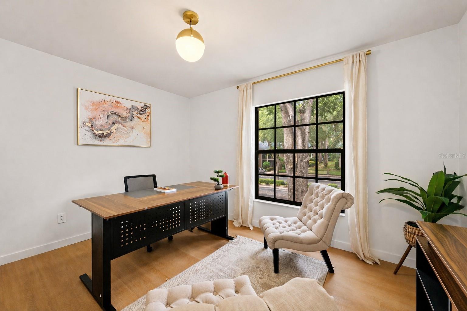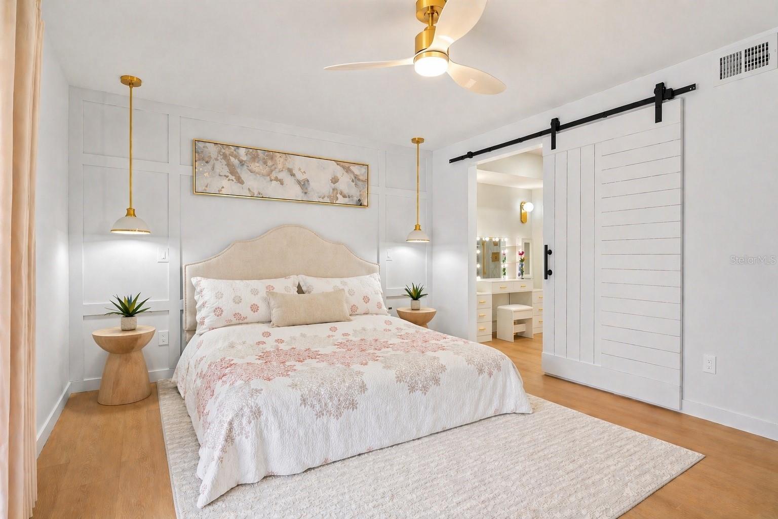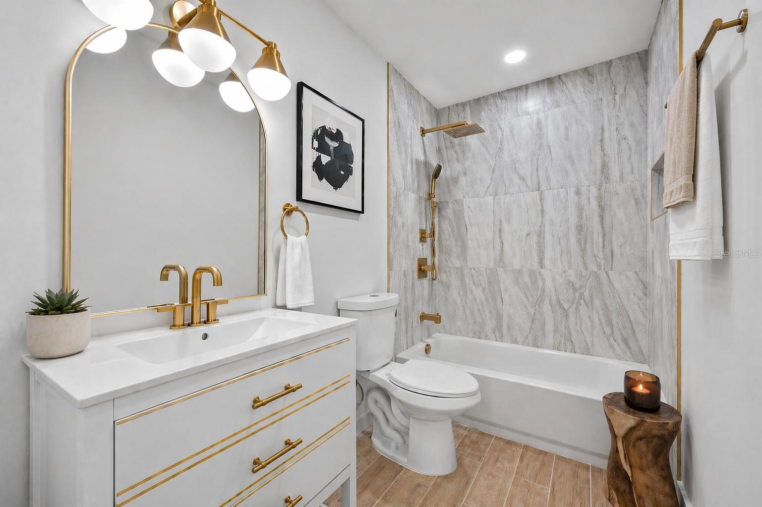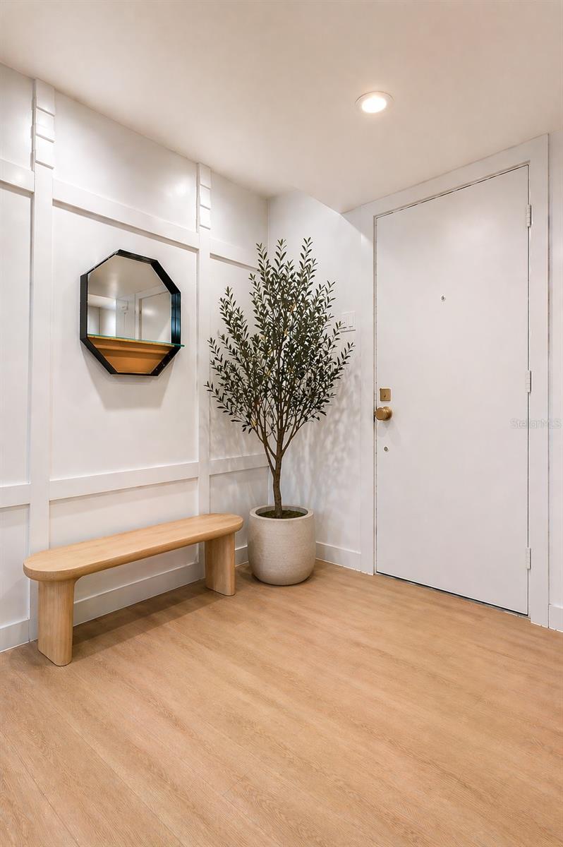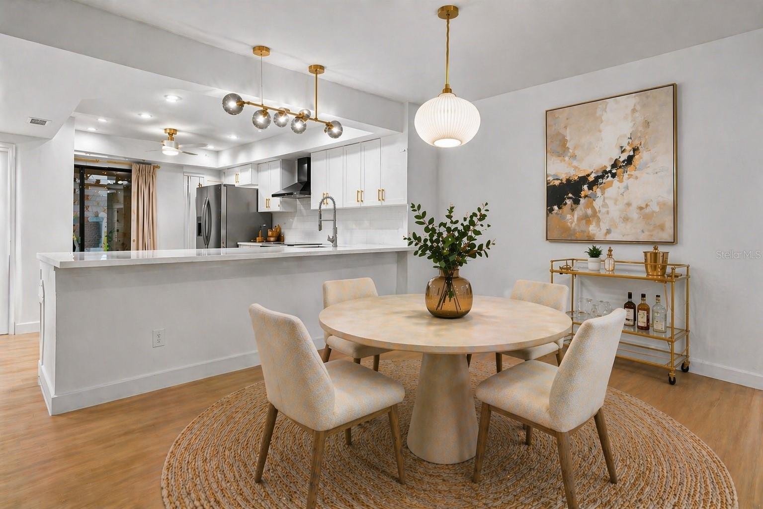 One or more photo(s) has been virtually staged. Welcome to this beautifully remodeled 2-bedroom, 2-bath condo offering a spacious and airy open-concept design. Natural light pours in through three large sliding glass doors, creating a bright and inviting atmosphere throughout. Light oak LVP flooring enhances the home with both style and durability, perfectly suited for everyday living. The kitchen is a true centerpiece, featuring expansive quartz countertops that extend seamlessly into the backsplash, a sleek modern range hood, pot filler over the range, stainless steel appliances, and a fashionable statement faucet. Designed for both function and style, the kitchen also opens to a charming front sitting area—perfect for casual dining or morning coffee. Enjoy exceptional indoor-outdoor living with multiple outdoor spaces ideal for relaxing or entertaining. The oversized screened-in back lanai overlooks the pool and is surrounded by mature live oaks, providing shade and a tranquil setting. The primary suite features a generous walk-in closet with abundant storage, a dedicated vanity area, and a beautifully updated ensuite bath. Both the ensuite and guest bathrooms showcase modern upgraded fixtures, stylish lighting, and warm neutral tile finishes. Additional highlights include designer lighting throughout, a brand-new in-unit washer and dryer for added convenience, a dedicated, assigned covered parking space, and the ease of true low-maintenance living. The HOA includes cable, internet, water, and trash for added convenience. Located within a gated community, residents enjoy access to resort-style amenities including two pools, a hot tub, sauna, clubhouse, fitness center, gym, tennis courts, and pickleball. Ideally situated close to shopping, dining, and everyday essentials, this home offers effortless Florida living in a prime location.