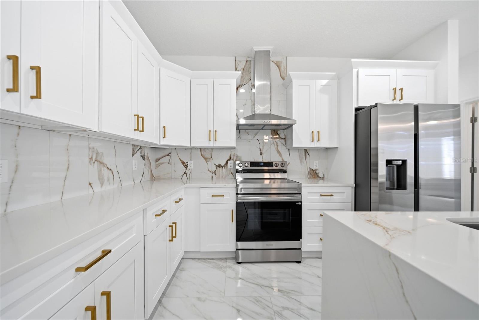 Stunning 4-bedroom, 2.5-bathroom NEW construction that truly stands out from the rest. Featuring 9’4” ceilings and oversized 24x48 porcelain tile flooring throughout, this home delivers a bright, modern, luxury feel from the moment you walk in. The open-concept design highlights a sleek electric fireplace with illuminated niches and a show-stopping kitchen with quartz countertops, waterfall island with wood accent detail, stainless steel appliances, custom cabinetry with gold hardware, and full-height designer backsplash. Both bathrooms showcase upscale finishes with quartz vanities, gold fixtures, and custom tile work. The spacious primary suite offers double walk-in closets and a beautifully designed bath. Located on a desirable corner lot with a covered lanai and ceiling fan, perfect for entertaining. Prime location near shopping, hospitals, schools, just 20–25 minutes to Downtown Orlando and 45–50 minutes to Daytona Beach. Homes with this level of finish do not last — schedule your private showing today. Buyers may receive up to $4,000 toward closing costs when using our preferred lender.