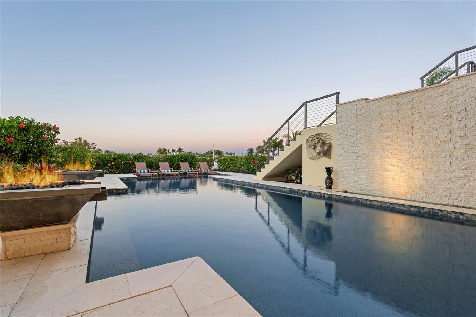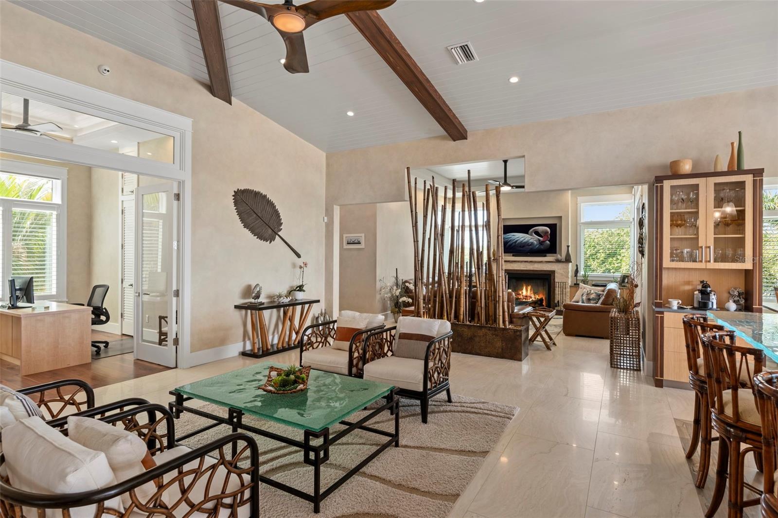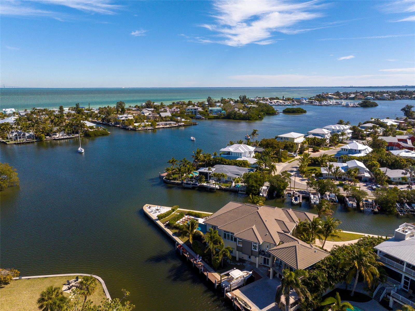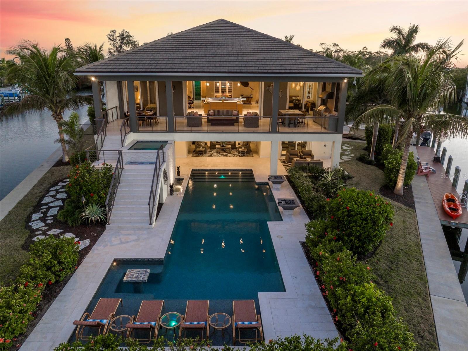 Probably the most beautiful home on Anna Maria Island. Welcome to AMI DREAM HOME, a breathtaking, one-of-a-kind luxury estate on Florida’s Gulf Coast. Nestled in the heart of Anna Maria, this spectacular residence offers the ultimate combination of privacy, elegance, and waterfront living. Set on a rare 18,590 sq. ft. triangular property with 500+ feet of water frontage, this estate extends directly into the pristine waters of Bimini Bay, providing unparalleled views and seamless access to the Gulf of Mexico—without any bridges. Custom-built in 2020, this architectural masterpiece was designed to take full advantage of its exceptional location, just steps from Anna Maria’s world-famous beaches, . Expansive windows frame breathtaking water views from every angle, while lush tropical landscaping enhances the home’s serene and secluded ambiance. Beyond the private gated entrance, you are welcomed into a lush courtyard, where a bridge connects the main residence to the guest house. Stroll along the waterfront to discover a 12,000-lb boat lift alongside a 60-ft dock, perfect for a yacht or cruiser. The meticulously designed outdoor space features a resort-style pool with cascading waterfalls, fire features, and a man-made sandy beach, all safely protected by a reinforced concrete seawall. A stunning fire pit at the property’s tip creates a dramatic setting for unforgettable sunset gatherings. A gated breezeway leads to the elevated main floor, accessible via a grand walnut staircase or the Vertech glass-walled residential elevator. From the Great Room the breathtaking views steal the show—truly unmatched on Anna Maria Island. The open-concept design seamlessly blends indoor and outdoor living, showcasing soaring vaulted ceilings, rich wood beams, and a warm, elevated ambiance. The state-of-the-art gourmet kitchen serves as the heart of the home, designed for both culinary excellence and effortless entertaining. A custom-lit glass countertop, created by ThinkGlass of Montreal, adds a striking focal point, while exquisite imported cabinetry from Hutton Beilman Design integrates seamless Bamboo and Walnut Pilasters. Cambria Quartz and Bridgewater Stone countertops flow through the expansive cooking island, espresso station, and bar. The walls feature a luxurious hand-polished French Polynesian faux finish, complementing the oversized Elysium Travertine floors that extend through the retractable 20-ft glass doors to the outdoor lanai. Spanning 800 sq. ft., the covered lanai is an entertainer’s paradise, complete with an exquisite outdoor kitchen, a fire-lit lounge, an outdoor dining room and an elevated spa all overlooking Bimini Bay. The gourmet outdoor kitchen boasts Quartzite countertops, a Neolith stone backsplash, a Lynx grill, and even a Teppanyaki cooking station—ideal for preparing fresh seafood while soaking in the stunning waterfront panorama. Retractable screens provide privacy and protection from the elements, allowing for year-round enjoyment. Described as a private island resort, this estate offers an unparalleled living experience. Every detail has been meticulously crafted to deliver luxury, comfort, and exclusivity. View this spectacular property online at AMIDREAMHOME.