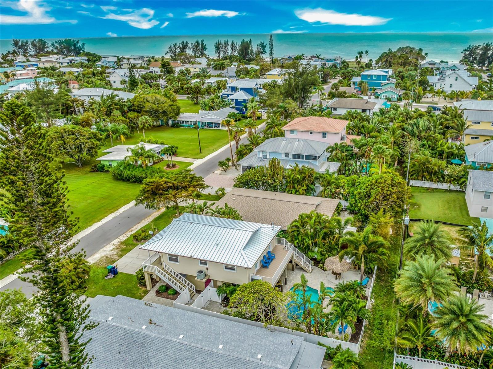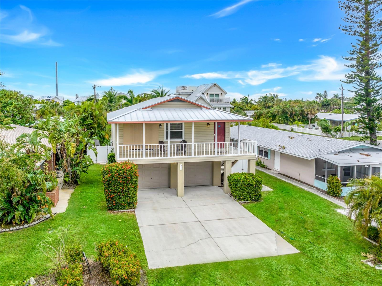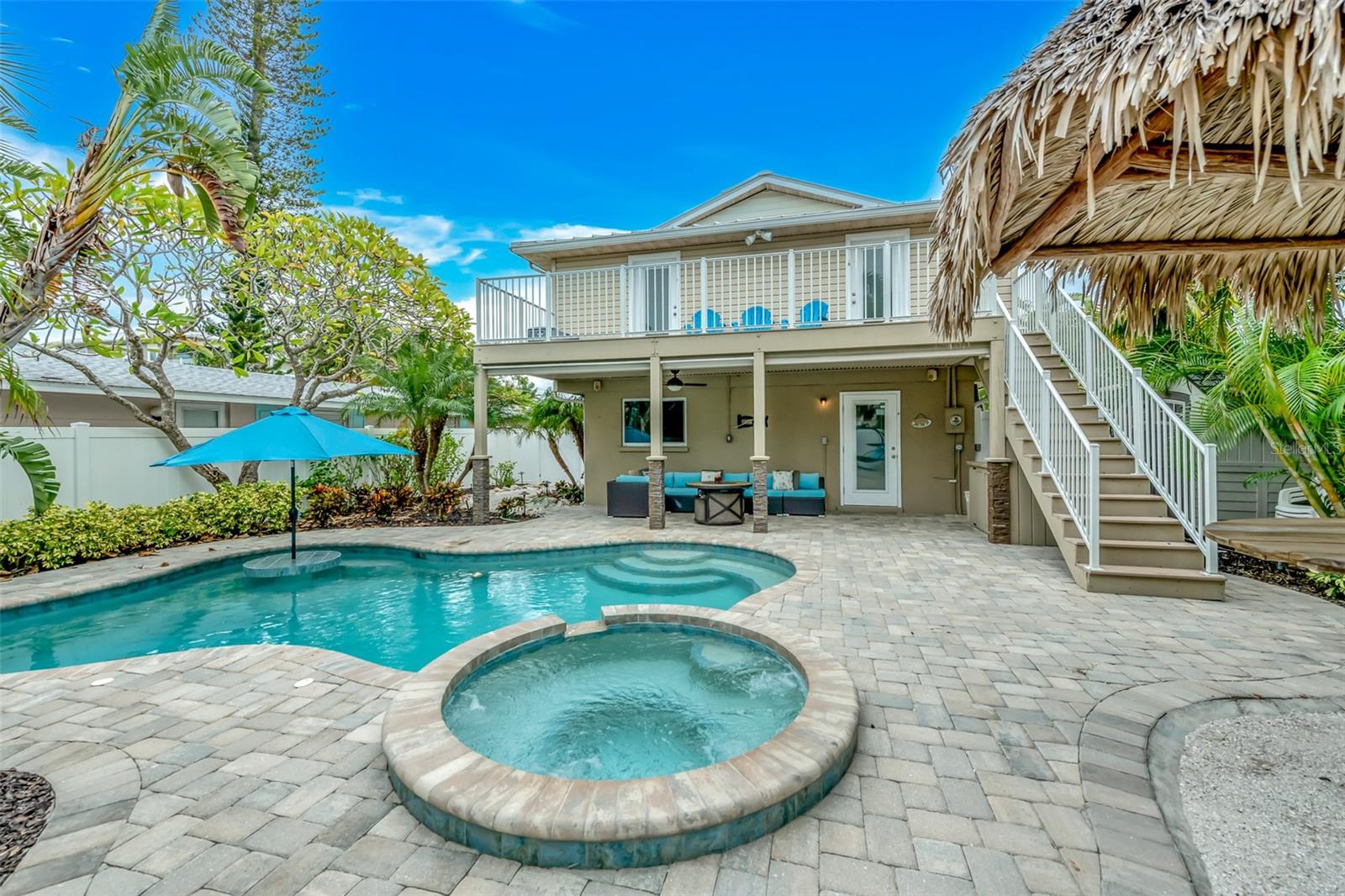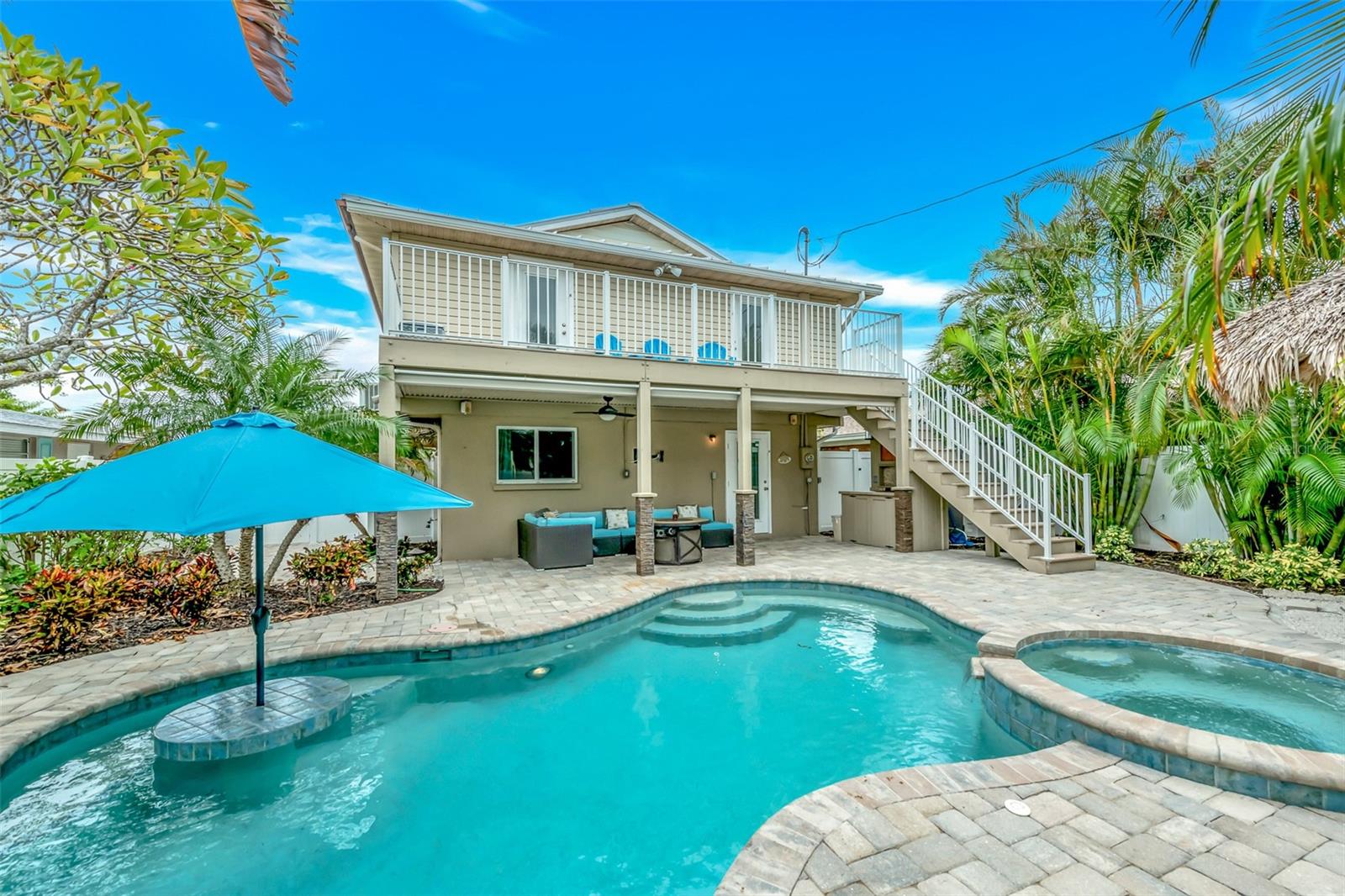 Welcome to your dream coastal retreat! This fully furnished, elevated 2 bedroom, 1 bathroom home is perfectly nestled in the heart of Anna Maria Island. This stunning property is situated on a beautifully landscaped lot surrounded by lush tropical landscaping, a sparkling pool and spa. You can entertain in style with the outdoor kitchen and tiki hut bar area, or relax under the covered lanai with ceiling fans and seating. Step inside to discover a bright, open-concept living space adorned with coastal décor and modern finishes. The living room features light-toned tile flooring, neutral paint, and a feature wall with a sleek electric fireplace, offering a cozy, yet contemporary vibe. The well-equipped kitchen features granite countertops, stainless steel appliances, and a glass-tile backsplash for a polished look. The dining space is perfect for entertaining and intimate gatherings with friends and family. The two spacious bedrooms provide ample closet space and natural light, while the updated bathroom offers a clean and functional layout with elegant finishes. Additional features include a two car garage, upper-level porch, and a bonus room downstairs, providing ample space for relaxation or hosting guests. With the close proximity to the pristine beaches, charming shops, local restaurants and recreational activities, Anna Maria Island offers something for everyone. Whether you’re looking for a personal escape, vacation rental, or investment property, this beachside gem is an incredible opportunity.