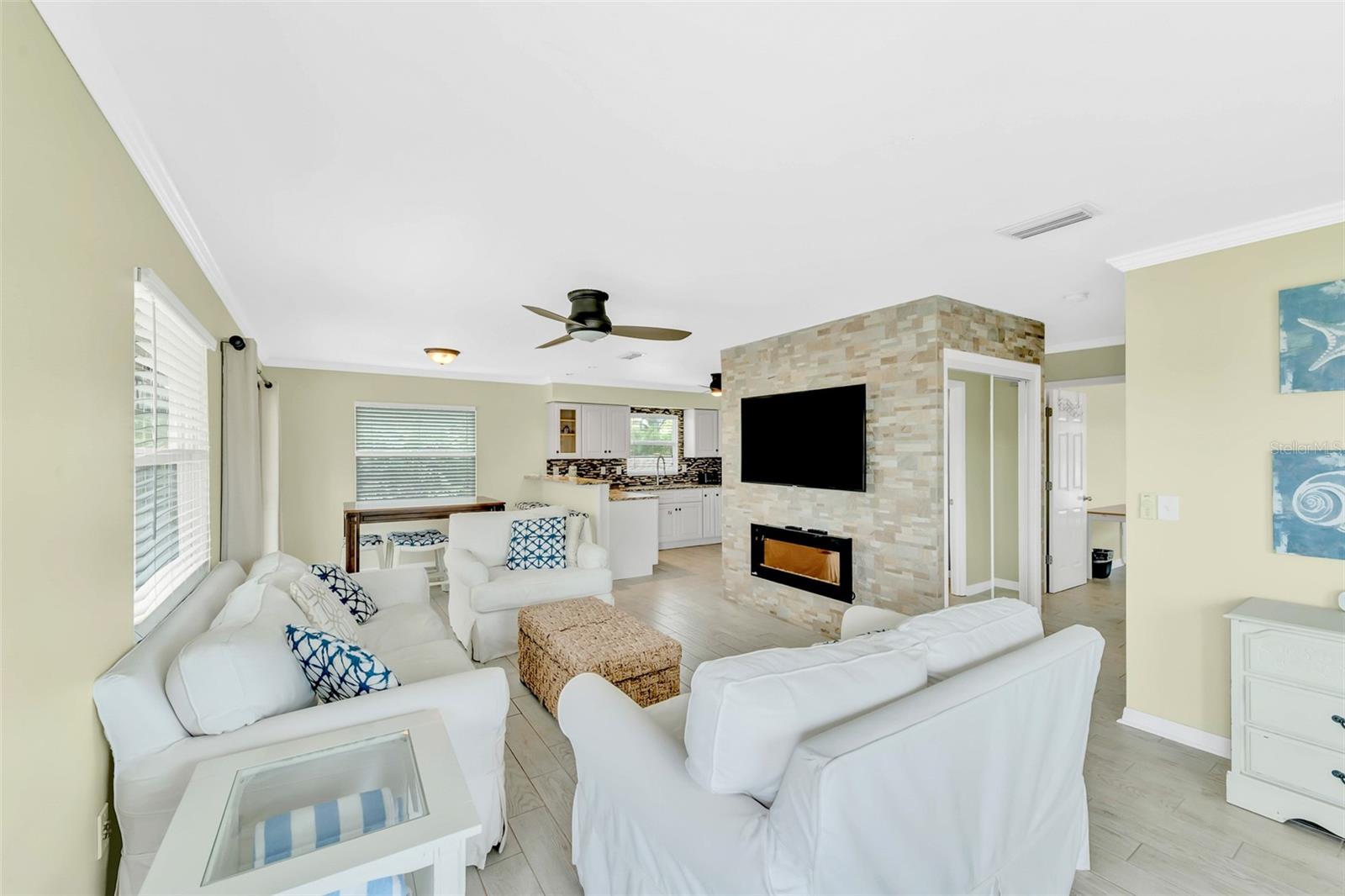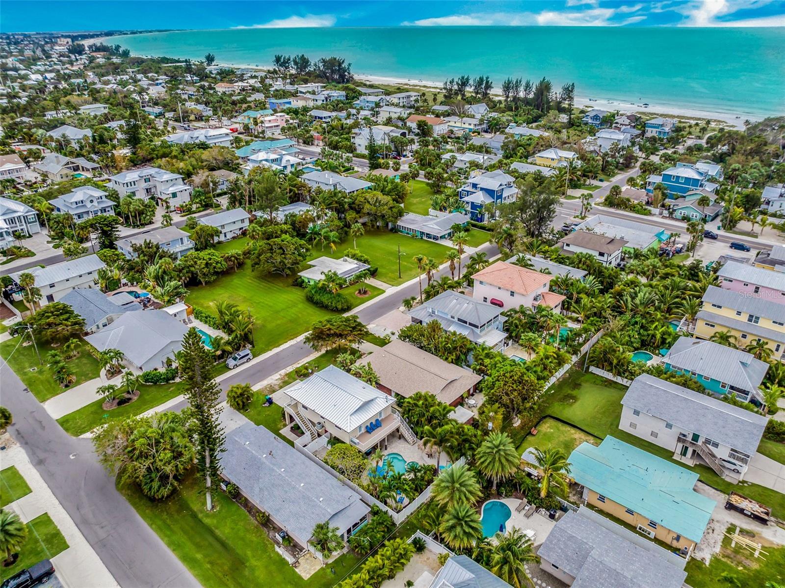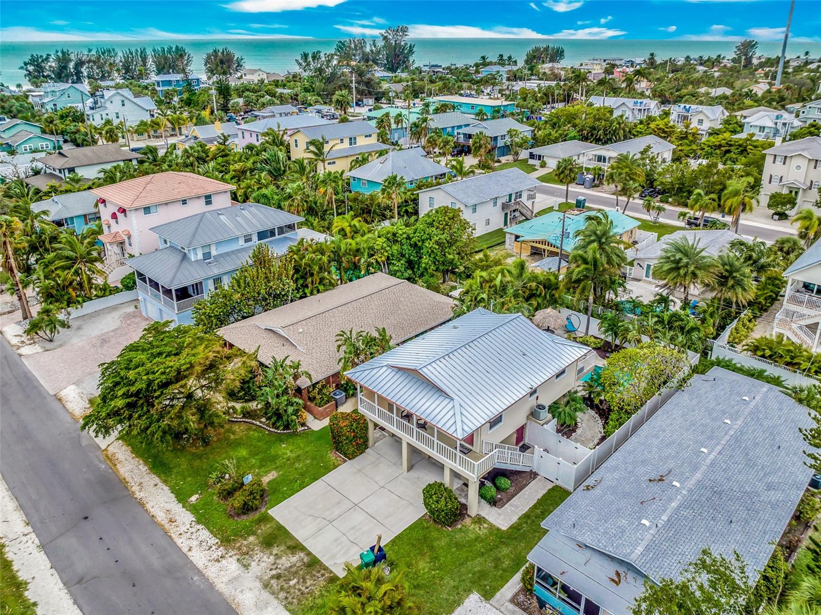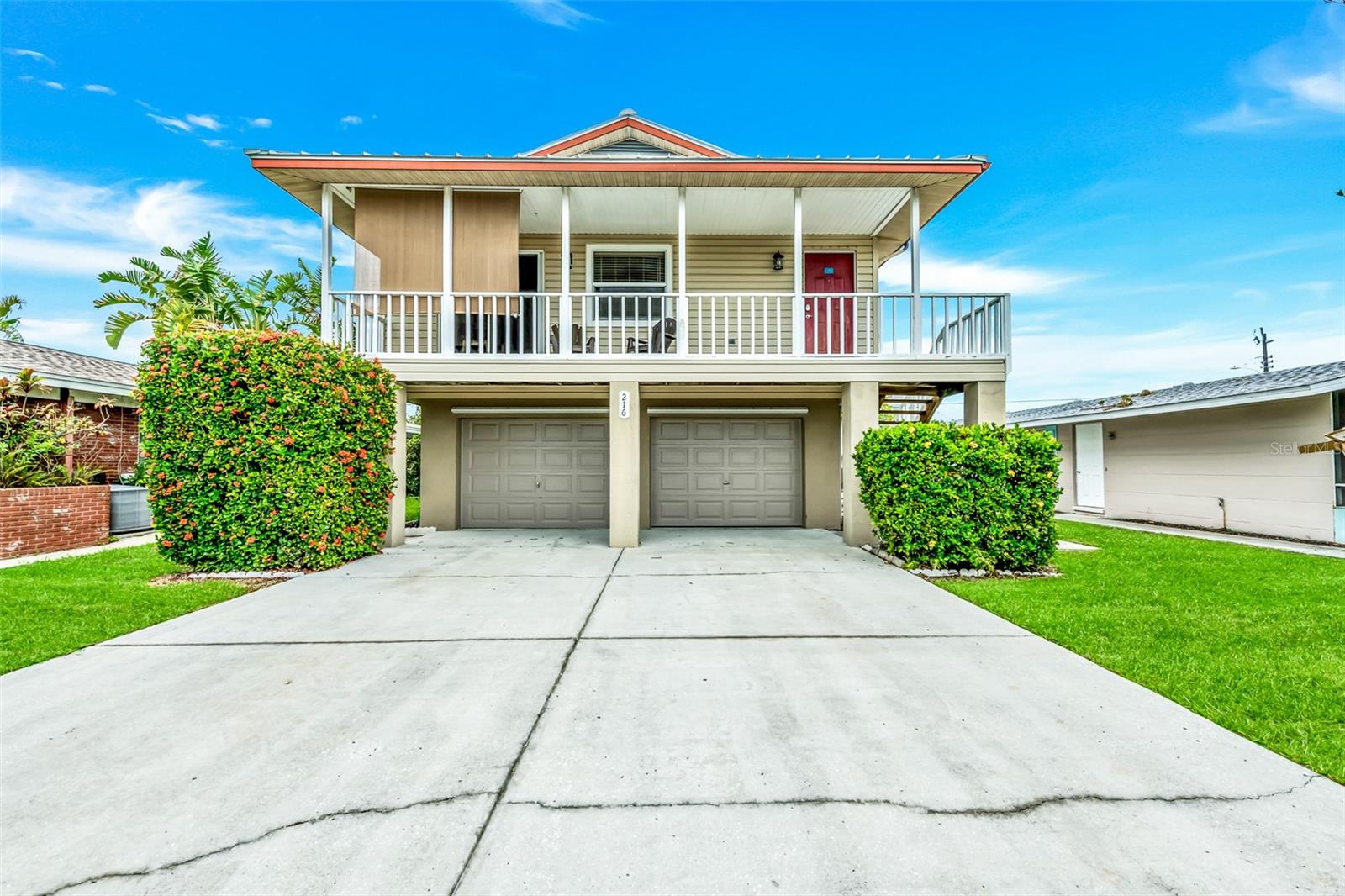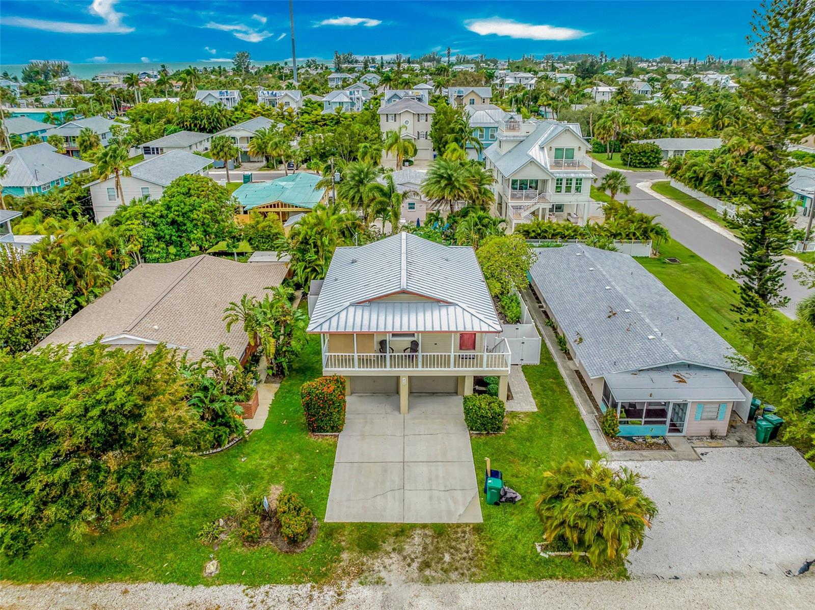 Welcome to your dream coastal retreat! This fully furnished, elevated 2 bedroom, 1 bathroom home is perfectly nestled in the heart of Anna Maria Island. This stunning property is situated on a beautifully landscaped lot surrounded by lush tropical landscaping, a sparkling pool and spa. You can entertain in style with the outdoor kitchen and tiki hut bar area, or relax under the covered lanai with ceiling fans and seating. Step inside to discover a bright, open-concept living space adorned with coastal décor and modern finishes. The living room features light-toned tile flooring, neutral paint, and a feature wall with a sleek electric fireplace, offering a cozy, yet contemporary vibe. The well-equipped kitchen features granite countertops, stainless steel appliances, and a glass-tile backsplash for a polished look. The dining space is perfect for entertaining and intimate gatherings with friends and family. The two spacious bedrooms provide ample closet space and natural light, while the updated bathroom offers a clean and functional layout with elegant finishes. Additional features include a two car garage, upper-level porch, and a bonus room downstairs, providing ample space for relaxation or hosting guests. With the close proximity to the pristine beaches, charming shops, local restaurants and recreational activities, Anna Maria Island offers something for everyone. Whether you’re looking for a personal escape, vacation rental, or investment property, this beachside gem is an incredible opportunity.