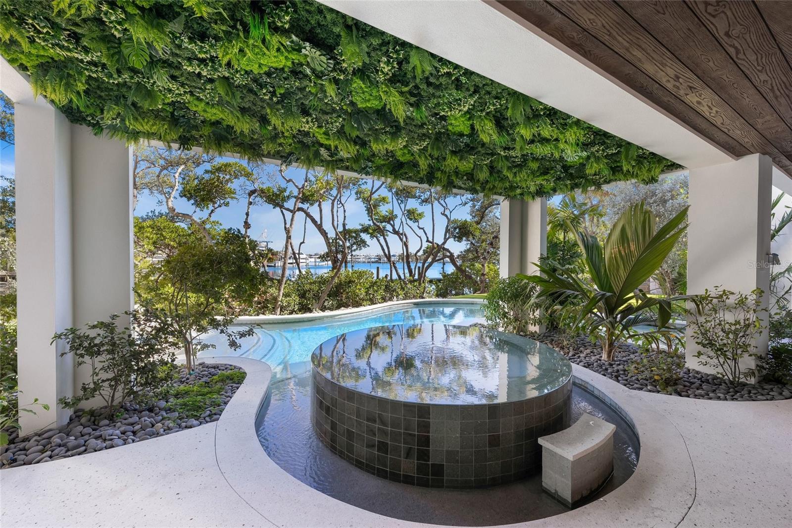 A rare expression of modern island luxury, this newly constructed Polynesian-inspired estate is ideally positioned on South Bay Boulevard in Anna Maria, offering privacy, architectural distinction, and sweeping bay views. Thoughtfully designed around a private, lush interior courtyard, the home centers on a resort-style pool and spa that seamlessly connect to covered outdoor living areas, creating a true indoor-outdoor lifestyle. The residence offers 5 bedrooms, 6 bathrooms, and expansive living spaces defined by clean architectural lines, warm wood accents, and walls of glass that frame tranquil water and tropical landscape views. The open main living level is ideal for entertaining at scale, anchored by a chef’s kitchen featuring custom cabinetry, a full walk-in pantry, and an oversized island, complemented by generous dining and gathering spaces that open directly to the pool courtyard. The primary suite is a private retreat, offering a custom-designed walk-in closet with a dedicated laundry area and a spa-inspired bath with a soaking tub positioned before picture windows overlooking the bay. A dramatic indoor-outdoor shower further enhances the immersive waterfront experience. Outdoor living is elevated with multiple covered terraces, a tranquil spa beneath a living green ceiling, and an expansive rooftop deck showcasing panoramic water views—perfect for sunset enjoyment and evening entertaining. Additional highlights include an elevator servicing all levels, premium finishes throughout, and thoughtfully designed spaces that balance luxury with everyday livability. Located just moments from Anna Maria’s renowned beaches, dining, and shopping, this exceptional residence presents a rare opportunity to own a newly built architectural masterpiece on the bay.