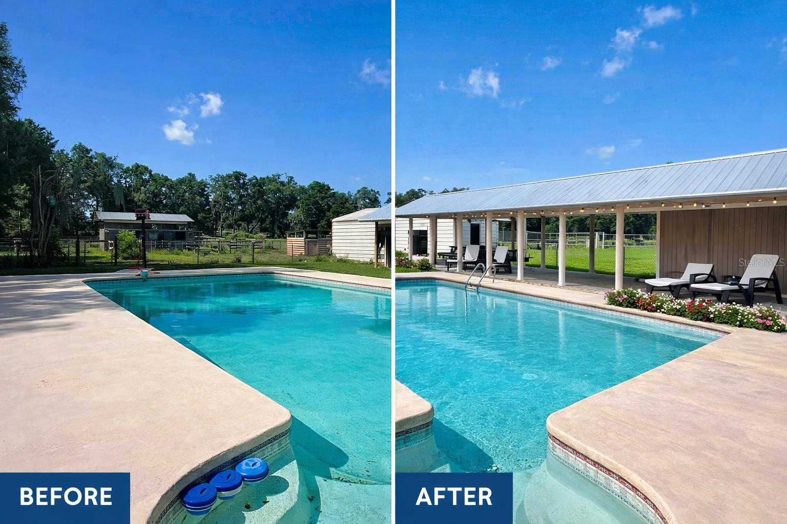 AMAZING HORSE FARM! Welcome to this charming 5-acre equestrian-ready, ranch-style property offering fully functional land, true horse infrastructure, and the freedom of no HOA — thoughtfully designed for everyday farm living with room to expand. The main residence and the covered pavilion both feature metal roofs replaced in 2021, providing long-term durability and peace of mind. Offered at $499,000. If you’ve been waiting for an affordable Anthony farm that actually functions, this is it. This 5-acre equestrian property is among the lowest-priced true horse farms in Marion County, offering real-world functionality — not just acreage on paper. The land is flat and fully functional, featuring established perimeter fencing, a barn with two oversized stalls, a feed room and wash rack, an RV hookup, and two separate driveways designed for everyday farm use. During the summer months, the pasture produces abundant grass suitable for equine grazing, supporting routine horse care and helping reduce supplemental feed needs. The 4-bedroom, 2-bath ranch-style home is solid, warm, and practical, and has passed a 4-point inspection. Interior features include wood flooring, solid cabinetry, no carpet, and an enclosed front porch filled with natural light — a comfortable space that feels lived-in and welcoming. Major updates include a whole-home water softener that is regularly maintained, along with well-kept systems that provide peace of mind for the next owner. While the home is currently vacant, it is move-in ready and has been consistently maintained, making it easy to show and ready for its next owner. The pool is professionally serviced every two weeks, the water softener remains on a regular maintenance schedule, and the property continues to be cared for so systems and features stay in good working order. This creates a smooth, easy transition for a buyer seeking immediate enjoyment with the opportunity for thoughtful personalization and future enhancements to reflect their own vision. Outdoor living is a true highlight, featuring a private lap-style in-ground pool and a large covered pavilion — ideal for entertaining or unwinding after a day with the horses. Recent seller updates include installation of a new pool timer (with a new cover on order) and repairs to cracking around the pool deck. The pool does require resurfacing; pricing reflects current condition and allows for customization. The acreage offers long-term flexibility and potential, including the possibility of building a larger main residence while retaining the existing home as a guest house, in-law suite, or rental (buyer to verify). This property provides a solid foundation with the opportunity to add your own style, vision, and future improvements. Located approximately 20 minutes from the World Equestrian Center, with paved road access, low taxes, and no HOA, this Anthony horse farm delivers freedom, functionality, and long-term upside in an area where fully functional acreage continues to grow more scarce. Select images have been virtually enhanced to illustrate potential cosmetic improvements. If you’re looking for real land, real function, and a property ready for your personal touch, this is a must-see Anthony horse farm.