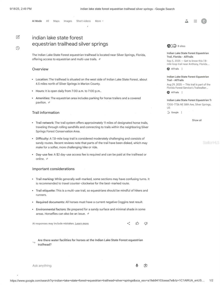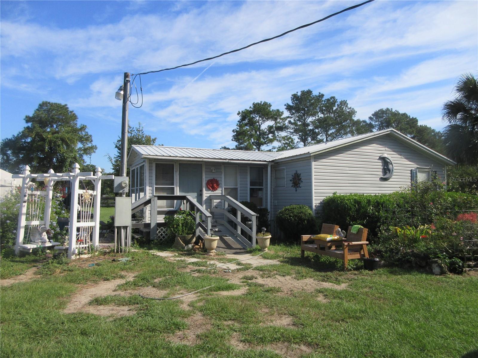 Equestrian Dream Come True! Ride your horses, hike or run straight from your front door into the Indian Lake State Forest. The trail system offers approximately 11 miles of designated horse trails traveling through rolling sandhills and connecting to trails within the neighboring Silver Springs Forest Conservation area. This property is also 30 minutes to the World Equestrian Center, HITS Horse Shows and 20 minutes to down town Ocala! NO HOA! Included is a 3/2 Pioneer 24x48 Doublewide Mobile Home with a 12x16 rustic Florida Room and a 9x9 screen room. Outside includes 18x21 two car carport, 22x22 tent carport, 21x24 lawn mower tent carport, 8x12 shed, 7x11 shed, vinyl frame for a 14x16 carport, 21x43 carport, 21x21 pole barn, 39x42 frame two stall barn with tack room and feed room, 6x9 chicken coup, 12x12 chicken coup, 4x9 chicken coup, 4x7 chicken coup and a 4x6 chicken coup. 2025 updates include the 2025 new 21x43 carport (previously mentioned), two RV hook ups, updated breaker box on pole, new cross fencing and new flooring in the kitchen and master bedroom. The master bath has a lovely granite counter top. All the above sits on a beautiful cleared fenced and cross fenced 3 acres of pasture with three paddocks. All zoned A1 Agricultural. So bring your family and all of your animals! Other updates are a 2022 central A/C Heat unit, 2014 metal roof on the doublewide. 2023 well pump and tank, 2023 vinyl siding, 2023 shutters and hurricane panels. Also included is a range, refigerator, 4 ceiling fans & window treatments. Re-plumbed by "Professional Choice Plumbing" in 2024. The paved road to the property is 2 miles long, however the last half mile is a fairly bumpy dirt road. But you get a lot for your money on this one! So, bring your family and all of your animals and let the fun begin! An absolutely great property at a great price of just $275,000! Also just minutes away is the Ocala National Forest which affords you almost a ½ million acres of Forest to roam, 600 lakes, 2 rivers, Juniper Springs, Silver Glen Springs, Salt Springs, Swimming, Skiing, Big BASS Fishing, Boating, Camping, Hiking, Horse back riding and some of the best ATV riding anywhere. Daytona Beach is just 1 hour away. Let the fun begin! You need it!