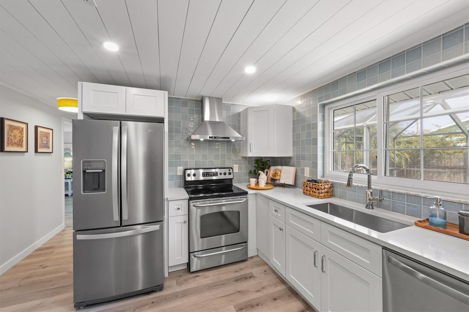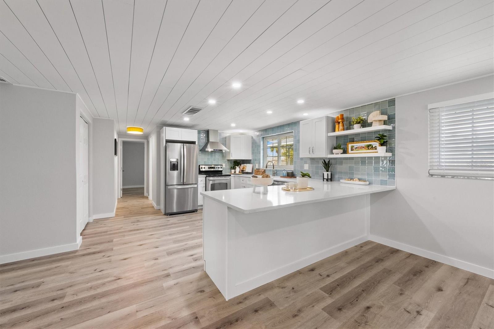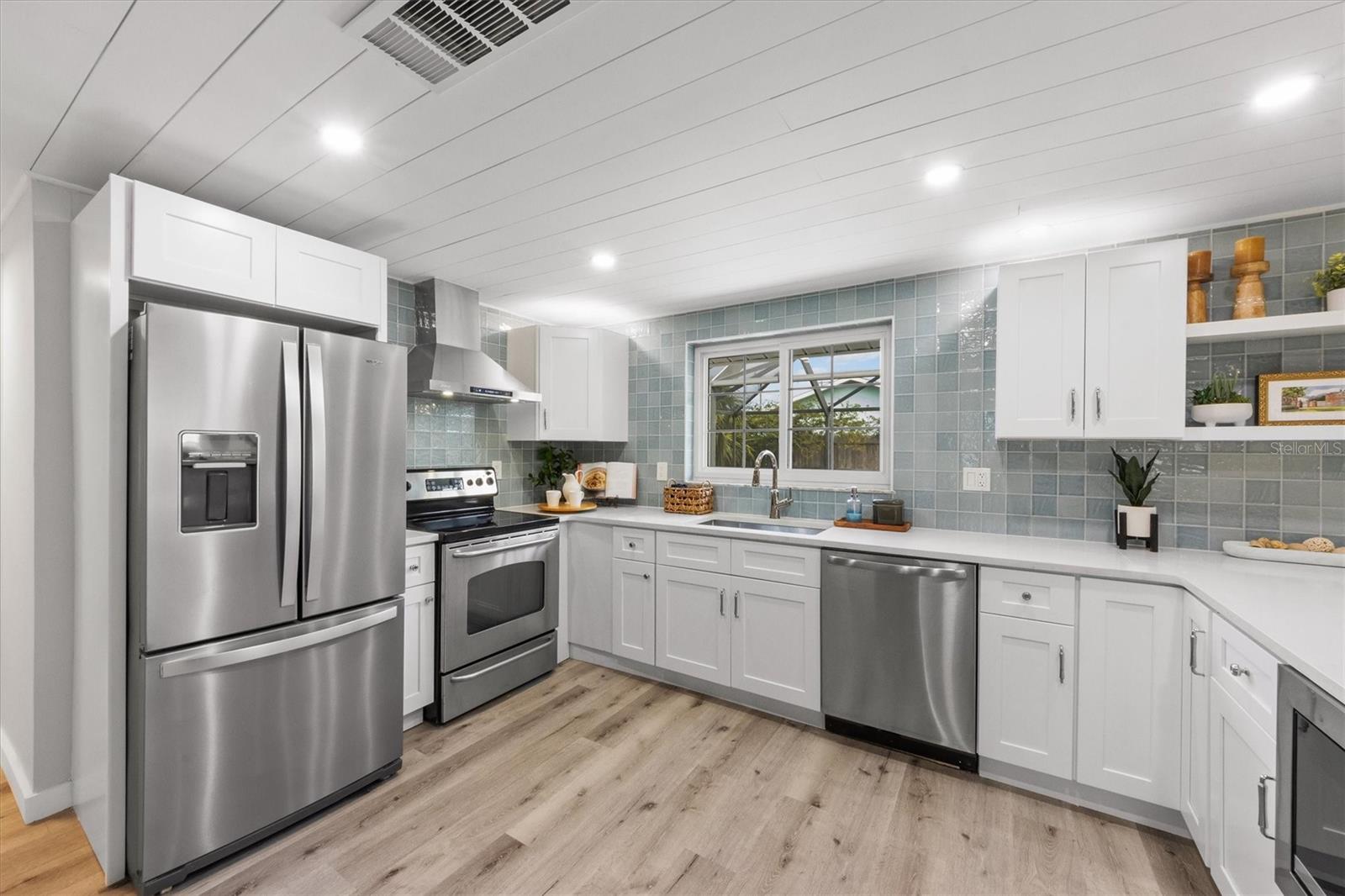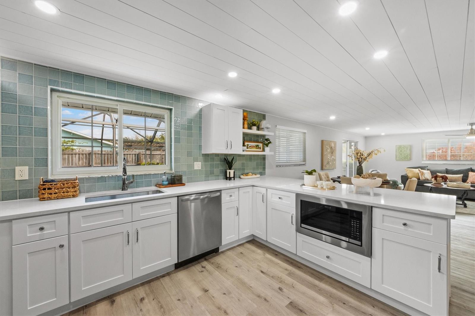 Located in the heart of Apollo Beach, this single family pool home with 3 bedrooms, 2 bathrooms a garage and coastal kitchen is one to look at! As you enter the foyer you walk into the kitchen to your left and great room to your right. The kitchen boasts all new appliances, quartz countertops with a coastal blue backsplash. Throughout the kitchen and great room the shiplap ceiling detail gives a coastal modern feel to add character and warmth to this lovely home. The large primary bedroom has an en suite bathroom with a walk-in shower and dual sink vanity. There are 2 additional bedrooms with ample closet space. The second bathroom has a bathtub and a handheld shower fixture for ease of use. Walking out the back slider you’ll enjoy covered patio space next to the pool. Envision relaxing in your outdoor furniture as other jump in the pool. The 2 car garage had plenty of space for toys and storage. This home move-in ready with a modernize updates and a coastal vibe. Don’t miss out on this one, come take a look and enjoy what this home has to offer!