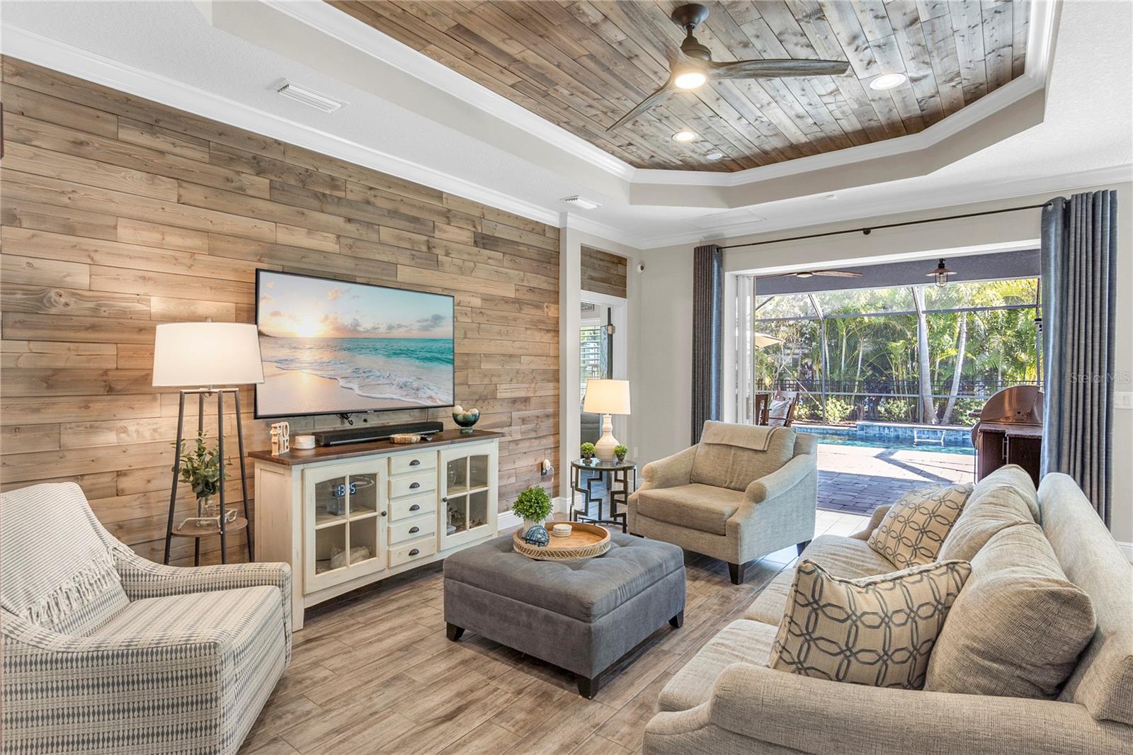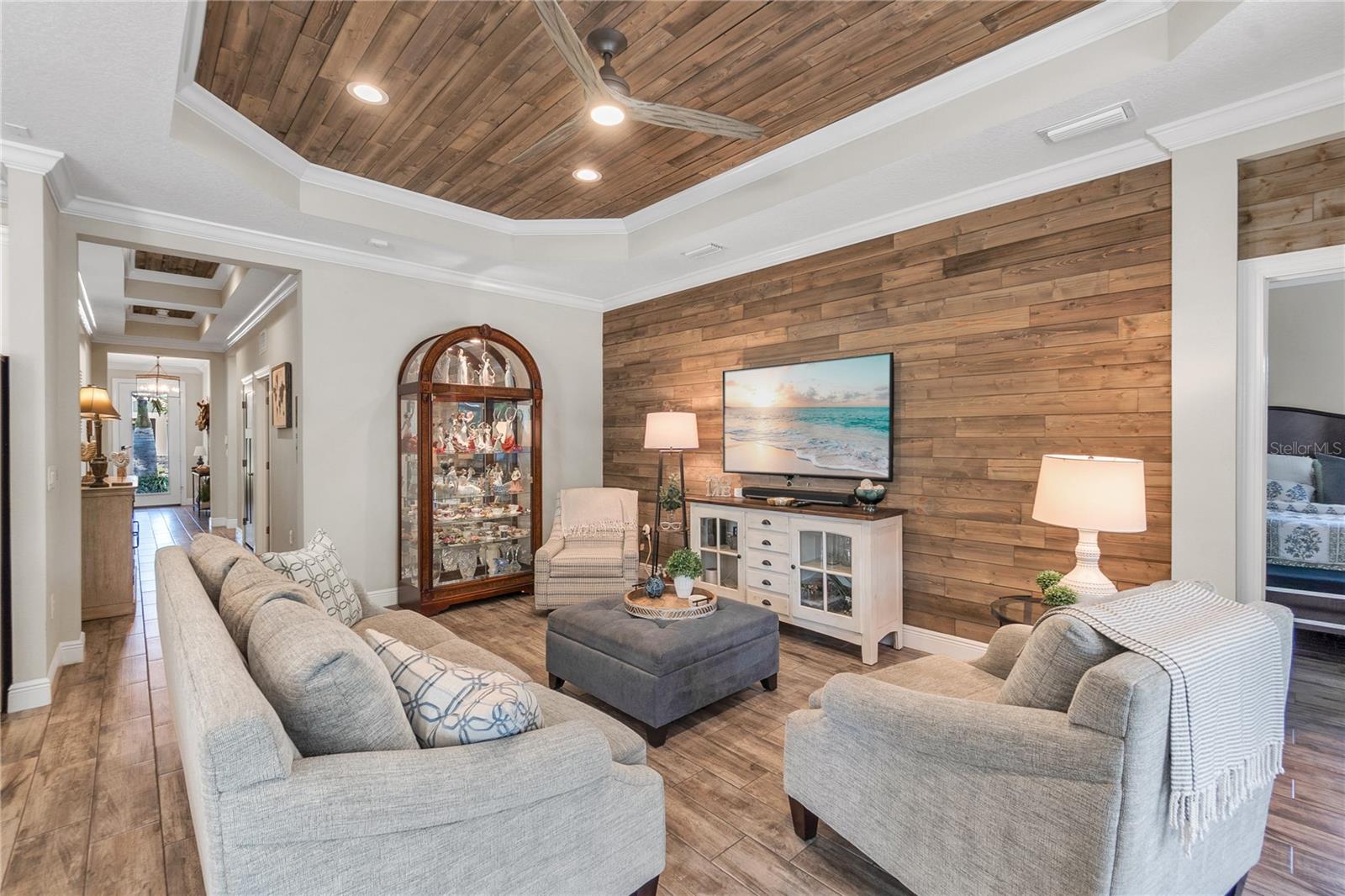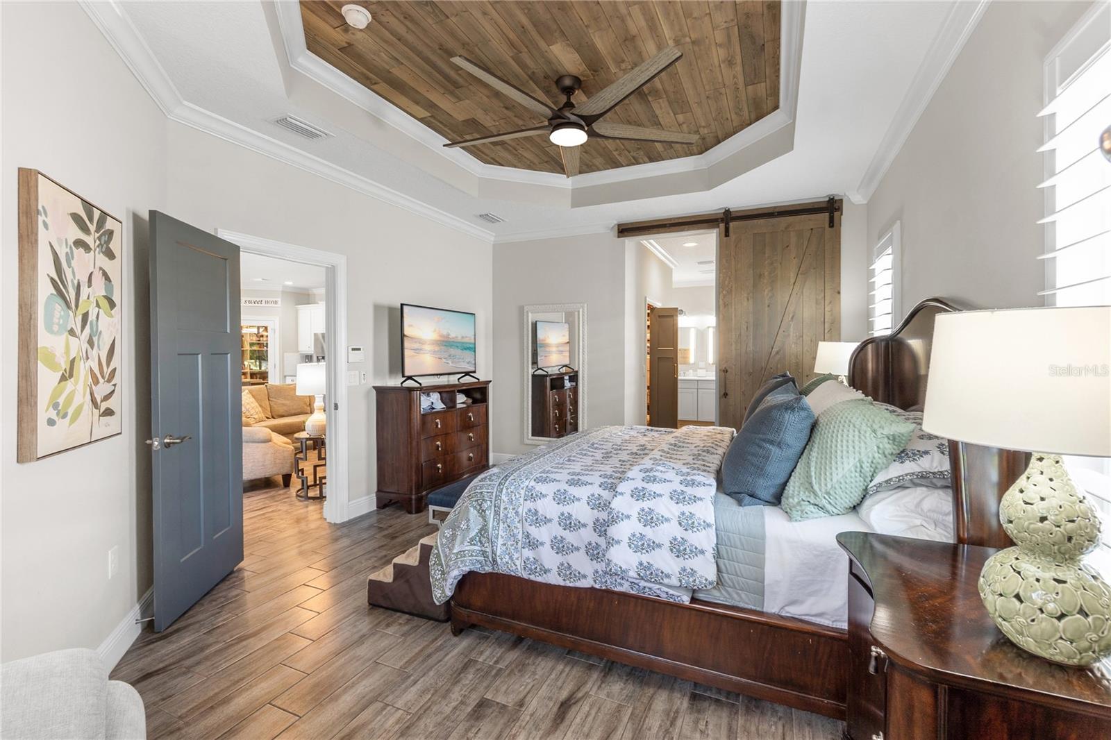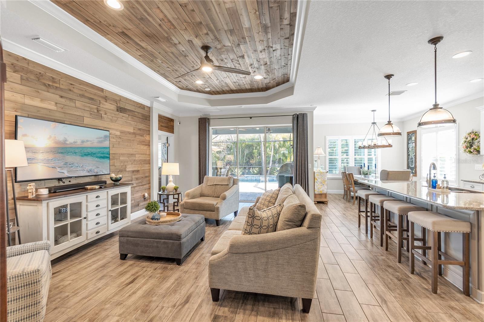 STUNNING HOME IN DESIRABLE WATERSET!! This immaculate triple-split floor plan features 3 bedrooms, 3 full baths, plus a den, and showcases unparalleled elegance, better than a model! The home offers an open layout with beautiful porcelain wood-look tile flooring throughout and coffered ceilings with wood in-lay in the foyer, living room, and primary bedroom, enhanced by custom shiplap accents in key areas. The kitchen is a chef's dream, equipped with upgraded appliances, two-tone cabinets, granite countertops, and a walk-in pantry featuring an upgraded glass door. Convenient USB outlets are installed in both the kitchen and master bedroom. Custom California Closets can be found in every closet, including the pantry, and a stylish barn door provides access to the primary bath, which boasts a double vanity with custom lighted mirrors. The primary bedroom features a custom tray ceiling and a large picture window while the guest bedroom includes an ensuite bathroom. The third bedroom offers a walk-in closet. Upgraded French doors lead to the den, and all bathrooms showcase elegant fixtures, including custom glass barn doors in the secondary bathroom showers. Throughout the home you'll find upgraded lighting, wired surround sound, smart home, a security system with closed-circuit cameras, exquisite doors, plantation shutters on every window, and bluetooth designer ceiling fans. A spacious laundry room provides; built-in cabinets, sink, pullout built-in dog bowls, fold-out ironing board, pulldown clothes drying rack. The garage features durable Snap Lock flooring, adding a touch of luxury. The exterior boasts low-maintenance landscaping, an outdoor built-in kitchen, saltwater & solar-heated pool. BONUS - New Roof & Pool Cage. This property has it all, come see it for yourself!