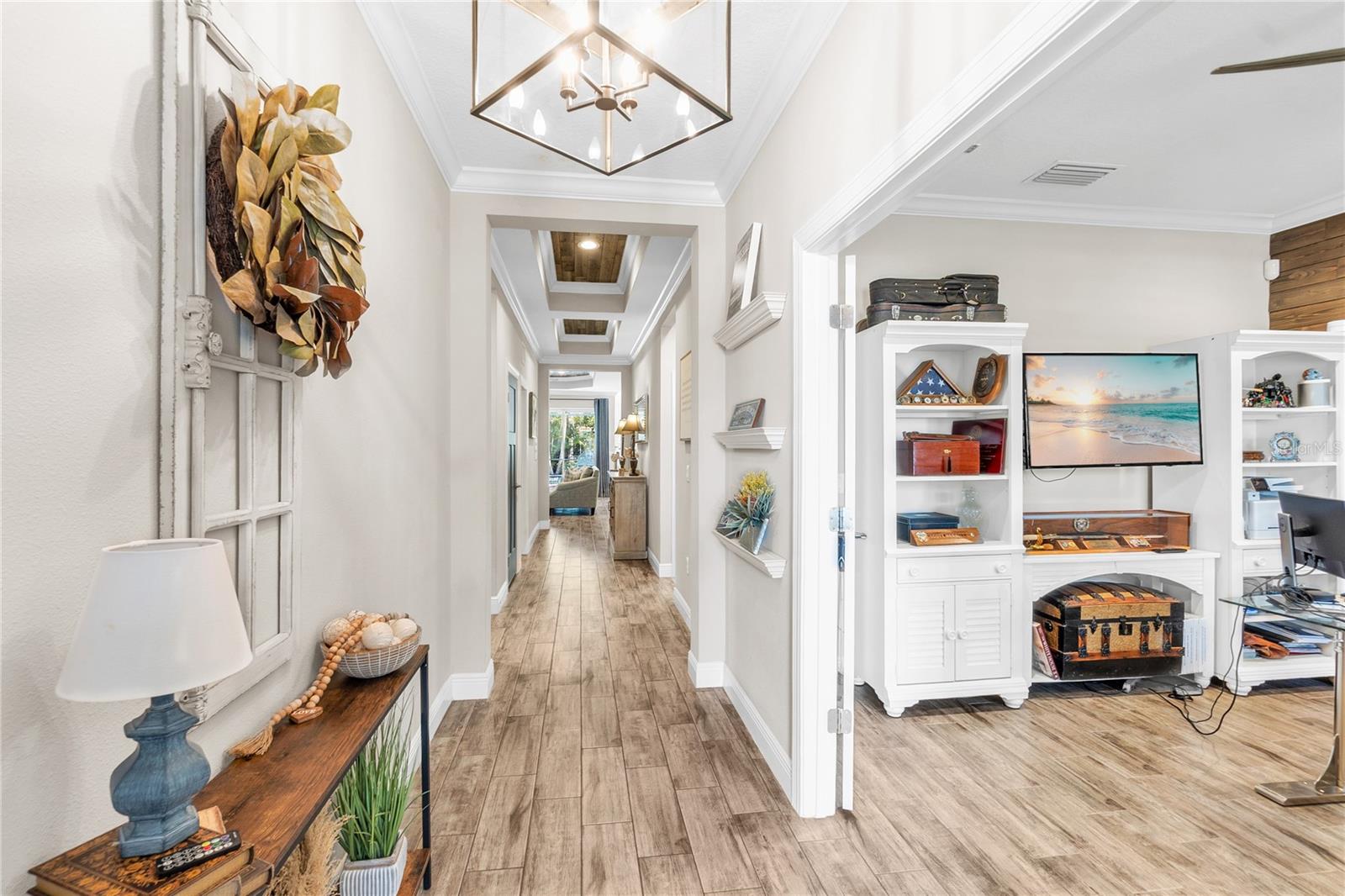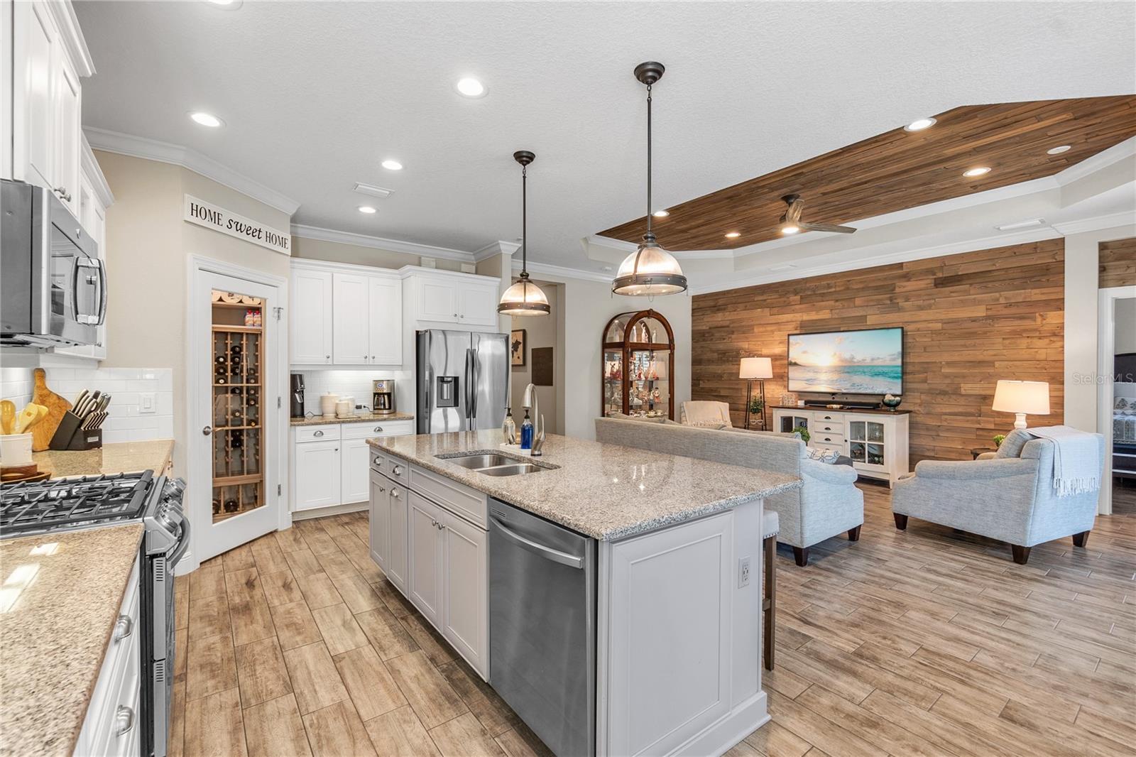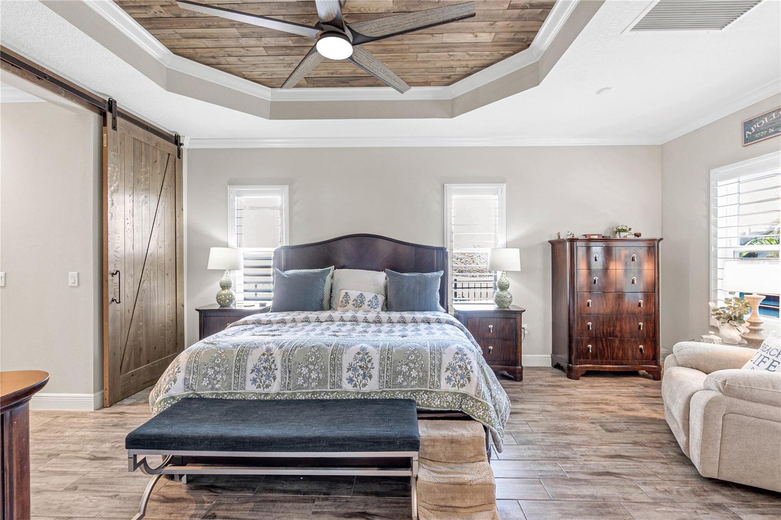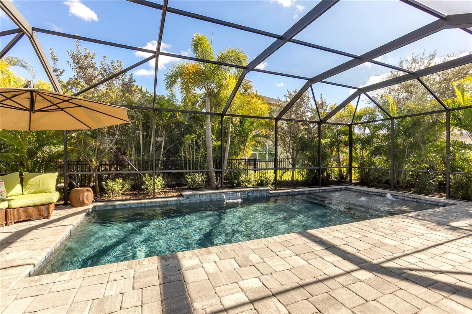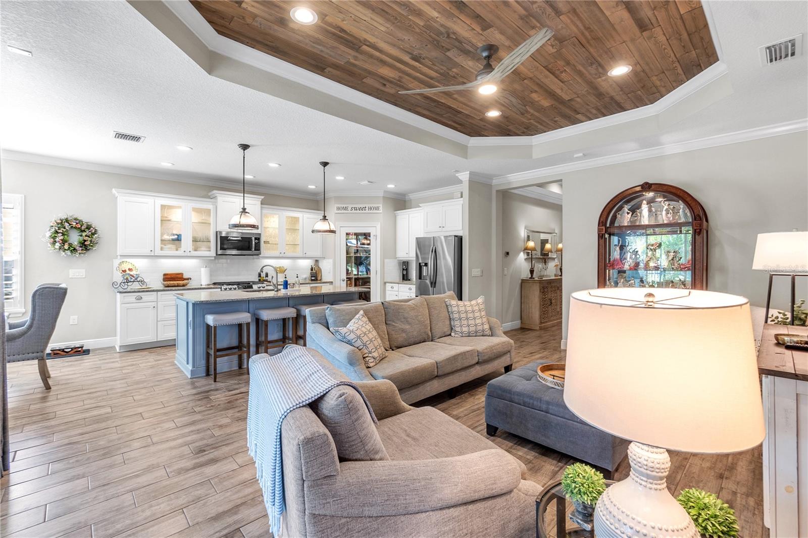 STUNNING HOME IN DESIRABLE WATERSET!! This immaculate triple-split floor plan features 3 bedrooms, 3 full baths, plus a den, and showcases unparalleled elegance, better than a model! The home offers an open layout with beautiful porcelain wood-look tile flooring throughout and coffered ceilings with wood in-lay in the foyer, living room, and primary bedroom, enhanced by custom shiplap accents in key areas. The kitchen is a chef's dream, equipped with upgraded appliances, two-tone cabinets, granite countertops, and a walk-in pantry featuring an upgraded glass door. Convenient USB outlets are installed in both the kitchen and master bedroom. Custom California Closets can be found in every closet, including the pantry, and a stylish barn door provides access to the primary bath, which boasts a double vanity with custom lighted mirrors. The primary bedroom features a custom tray ceiling and a large picture window while the guest bedroom includes an ensuite bathroom. The third bedroom offers a walk-in closet. Upgraded French doors lead to the den, and all bathrooms showcase elegant fixtures, including custom glass barn doors in the secondary bathroom showers. Throughout the home you'll find upgraded lighting, wired surround sound, smart home, a security system with closed-circuit cameras, exquisite doors, plantation shutters on every window, and bluetooth designer ceiling fans. A spacious laundry room provides; built-in cabinets, sink, pullout built-in dog bowls, fold-out ironing board, pulldown clothes drying rack. The garage features durable Snap Lock flooring, adding a touch of luxury. The exterior boasts low-maintenance landscaping, an outdoor built-in kitchen, saltwater & solar-heated pool. BONUS - New Roof & Pool Cage. This property has it all, come see it for yourself!