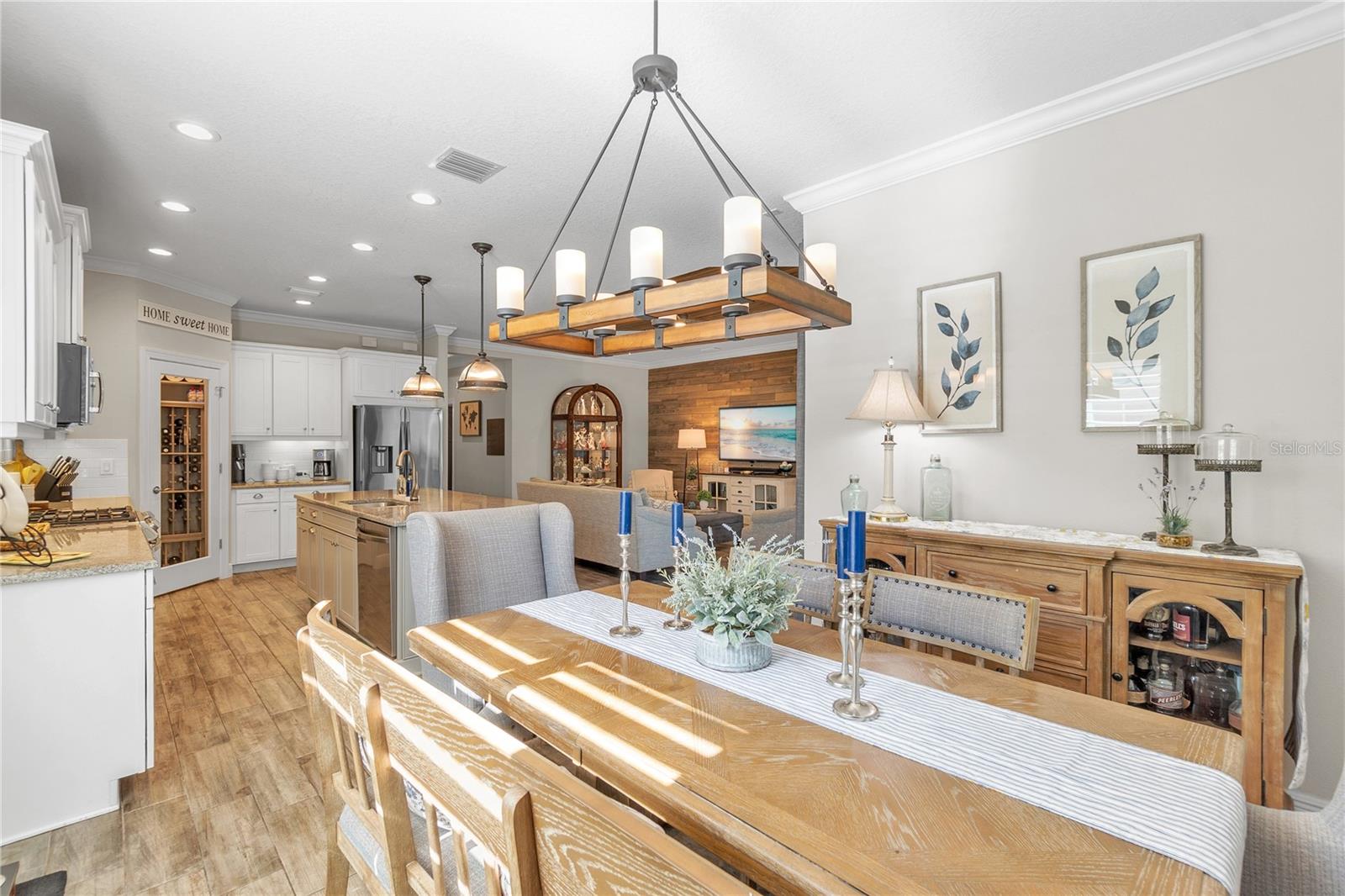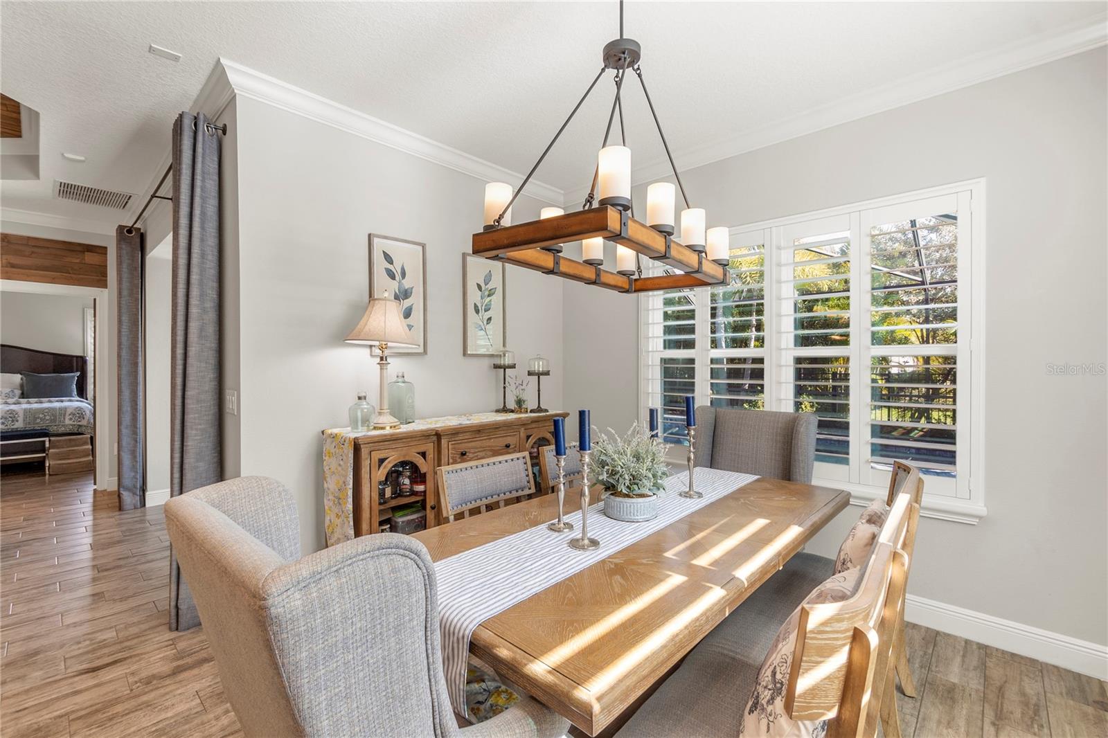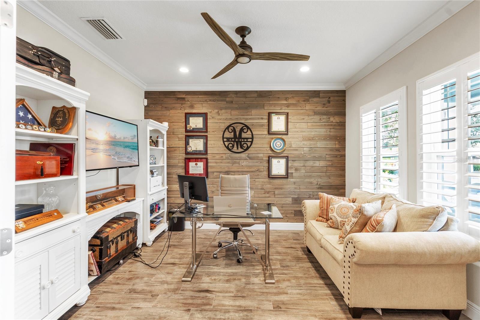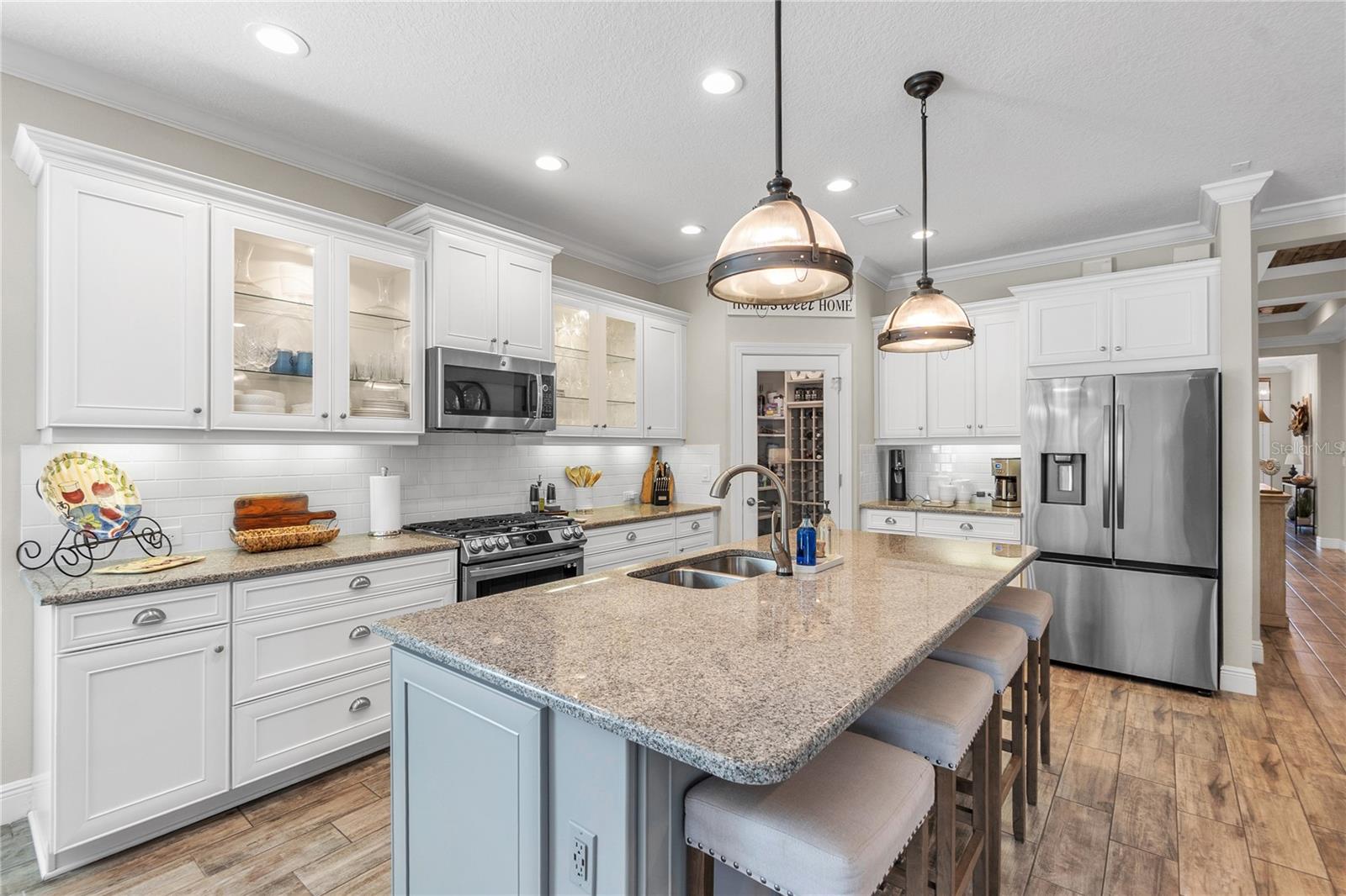 STUNNING HOME IN DESIRABLE WATERSET!! This immaculate triple-split floor plan features 3 bedrooms, 3 full baths, plus a den, and showcases unparalleled elegance, better than a model! The home offers an open layout with beautiful porcelain wood-look tile flooring throughout and coffered ceilings with wood in-lay in the foyer, living room, and primary bedroom, enhanced by custom shiplap accents in key areas. The kitchen is a chef's dream, equipped with upgraded appliances, two-tone cabinets, granite countertops, and a walk-in pantry featuring an upgraded glass door. Convenient USB outlets are installed in both the kitchen and master bedroom. Custom California Closets can be found in every closet, including the pantry, and a stylish barn door provides access to the primary bath, which boasts a double vanity with custom lighted mirrors. The primary bedroom features a custom tray ceiling and a large picture window while the guest bedroom includes an ensuite bathroom. The third bedroom offers a walk-in closet. Upgraded French doors lead to the den, and all bathrooms showcase elegant fixtures, including custom glass barn doors in the secondary bathroom showers. Throughout the home you'll find upgraded lighting, wired surround sound, smart home, a security system with closed-circuit cameras, exquisite doors, plantation shutters on every window, and bluetooth designer ceiling fans. A spacious laundry room provides; built-in cabinets, sink, pullout built-in dog bowls, fold-out ironing board, pulldown clothes drying rack. The garage features durable Snap Lock flooring, adding a touch of luxury. The exterior boasts low-maintenance landscaping, an outdoor built-in kitchen, saltwater & solar-heated pool. BONUS - New Roof & Pool Cage. This property has it all, come see it for yourself!