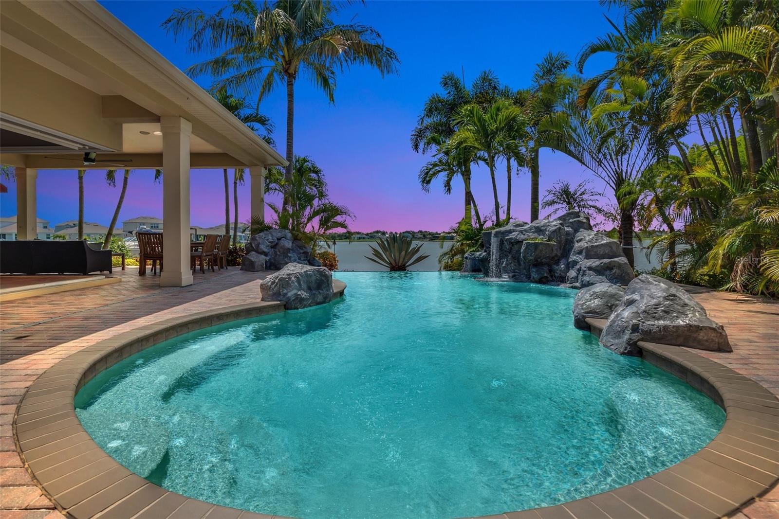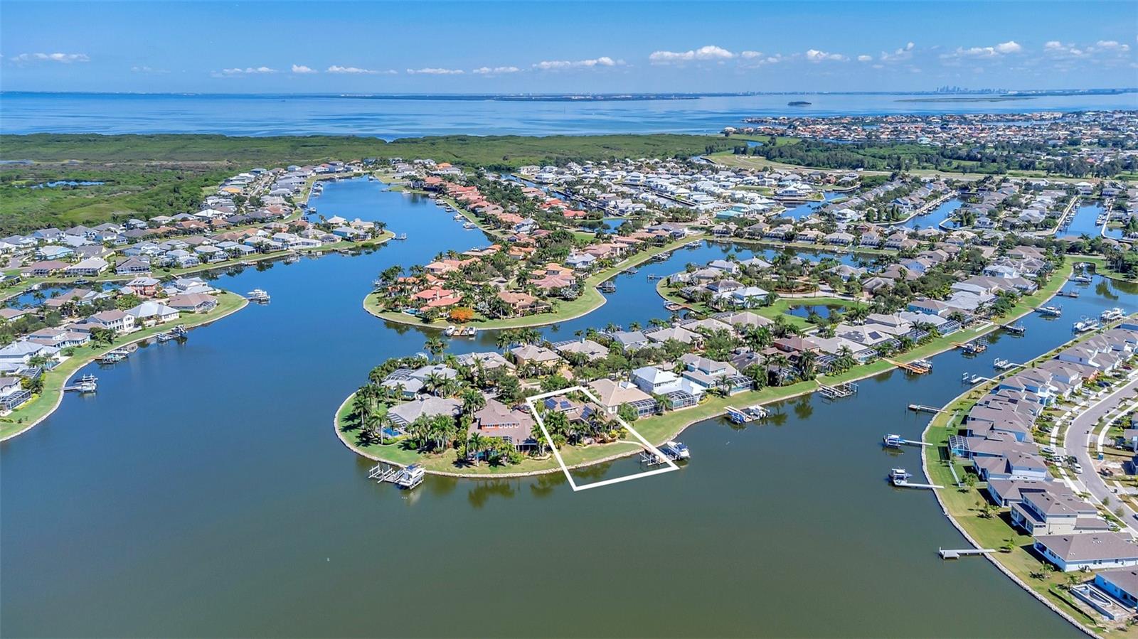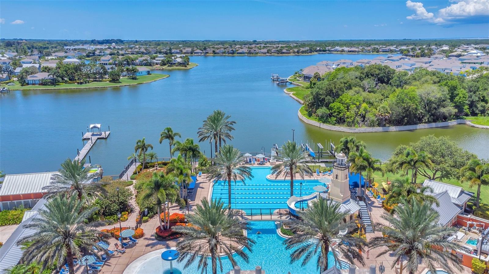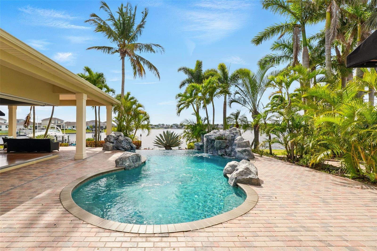 Under contract-accepting backup offers. Welcome to coastal living at its finest in the magnificent estate located in the exclusive MiraBay community! This stunning waterfront retreat boasts a private dock with a lift (20k pound lift and 15”wide will accommodate a 30’ plus boat easily), ideal for boating enthusiasts looking for direct access to the beautiful waters of Tampa Bay. Featuring: 3 Spacious Bedrooms and 3.5 Elegant Bathrooms, a Dedicated Office and a Media Room perfect for work and play, a Tandem 3-Car Garage ideal for extra storage or your weekend ride. It is equipped with a 26 KWH LG Solar Power System for an energy-efficient and eco-conscious lifestyle that will produce almost 100% of the power required to operate this home, the system is owned by the seller and payed off and will convey, it includes a 25-year transferable warranty of which it has 19 years left. The power bill is only $20/month. A New Roof was just installed updated for peace of mind. Custom Renovations have been done throughout the house including updated Kitchen cabinets and countertops, Lighting fixtures, new paint, updated bathroom faucets, cabinets and countertops, and more.. The stunning backyard features a Lush Tropical Landscaping, curated to impress with a Custom salt water Pool to create your own private oasis with wide open water views and an expansive outdoor lanai with a full-service summer kitchen. Whether you're entertaining on the water or enjoying a quiet night in, this home offers the perfect blend of luxury, comfort, and convenience. Additional features: The is located within the community lagoon which is connected to the Gulf of Mexico via a 1/2-mile canal, Lagoon water levels are not impacted by tide ensuring full access to open water 100% of the time and protected from mayor weather events. A Mosquito Mist System for the whole house virtually eliminates mosquitos around the perimeter of the lanais and poolThe MiraBay community is a gated, resort-style community with clubhouse, pool, fitness center, tennis courts, and more! Makes you feel you’re living in your own privet resort. Schedule your private showing today — waterfront homes like this don’t last long!