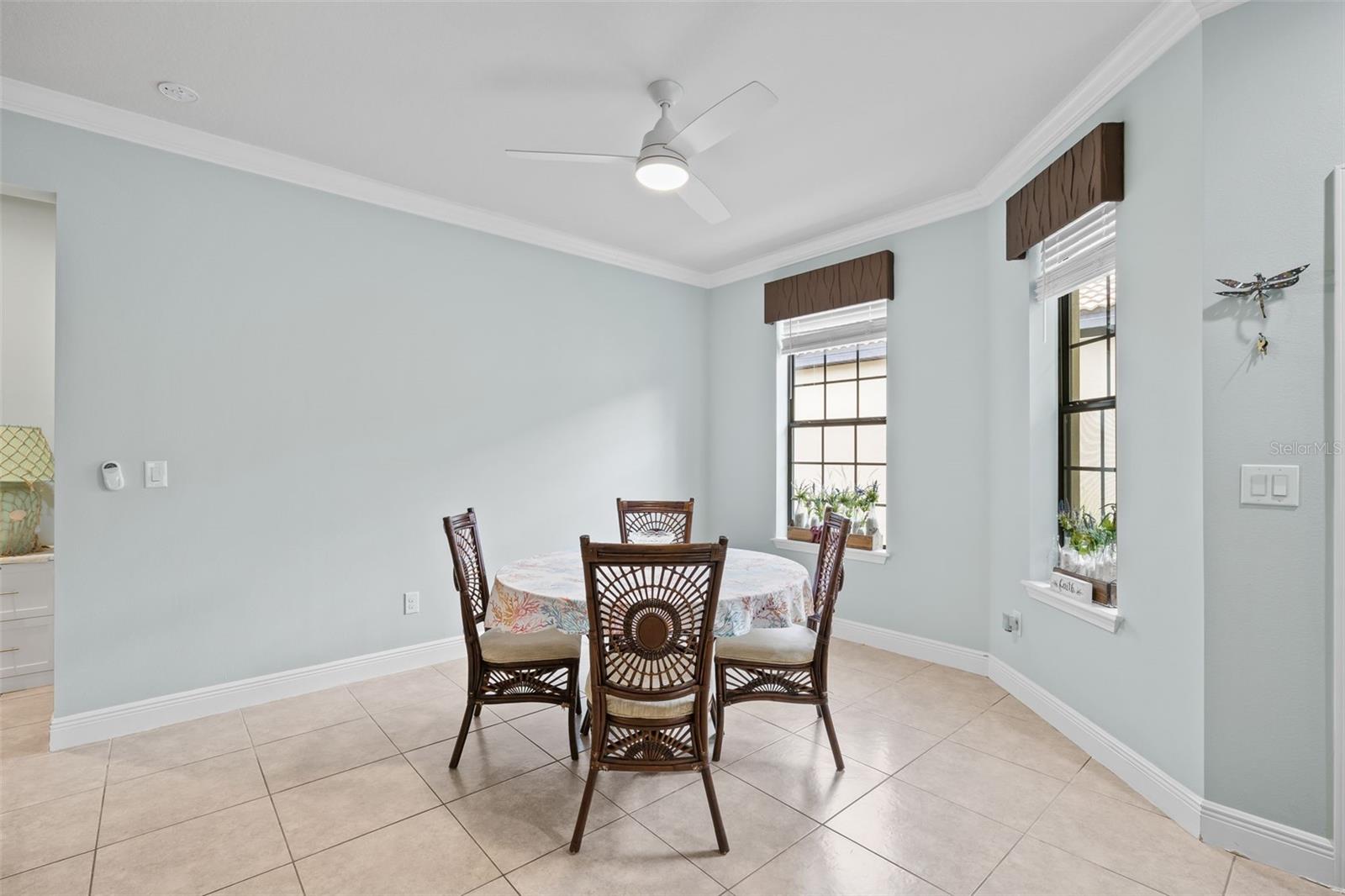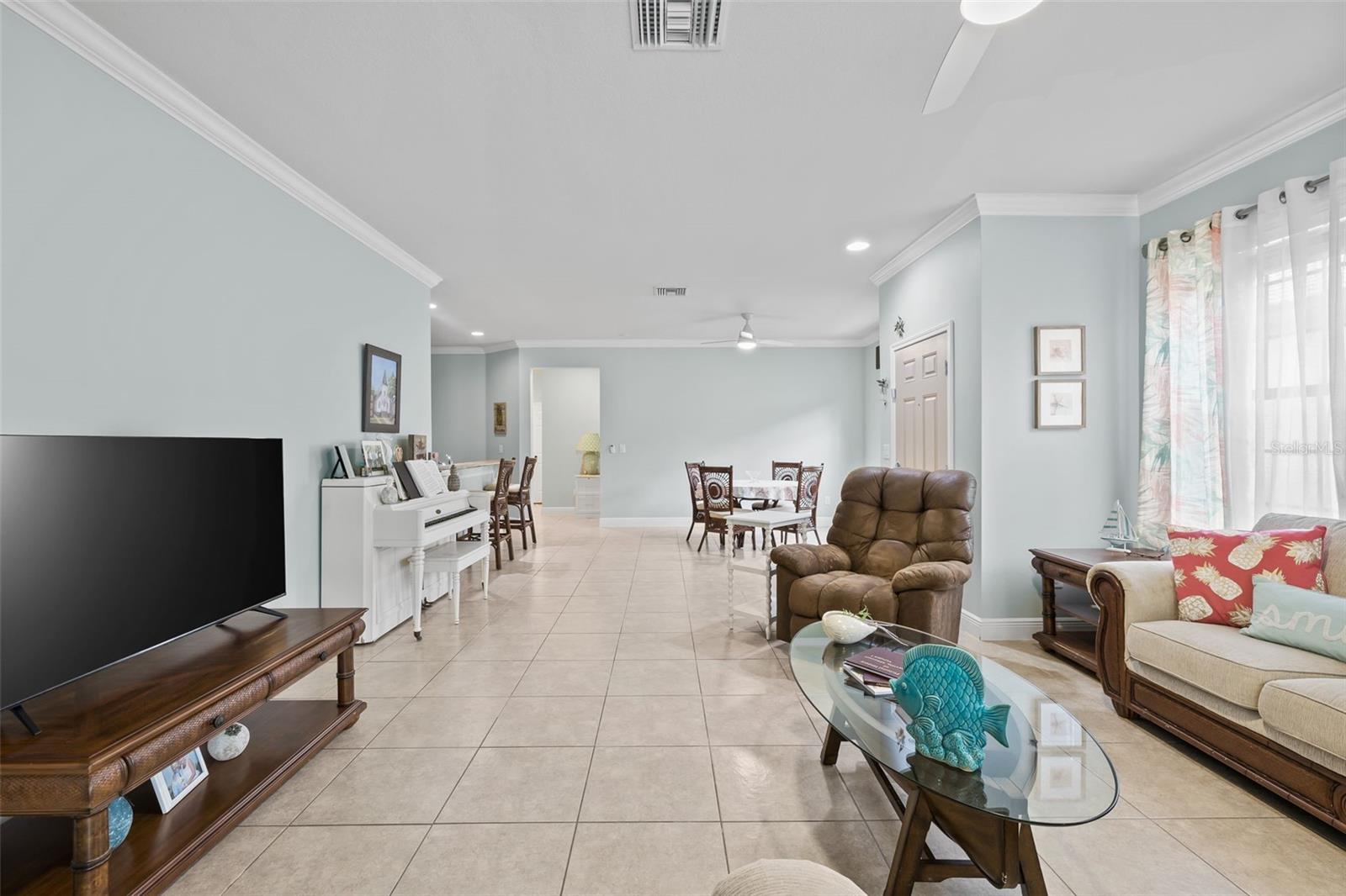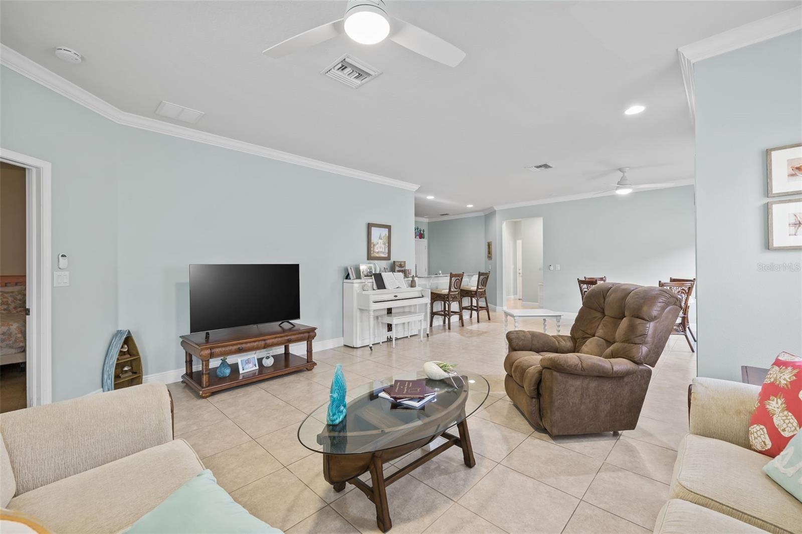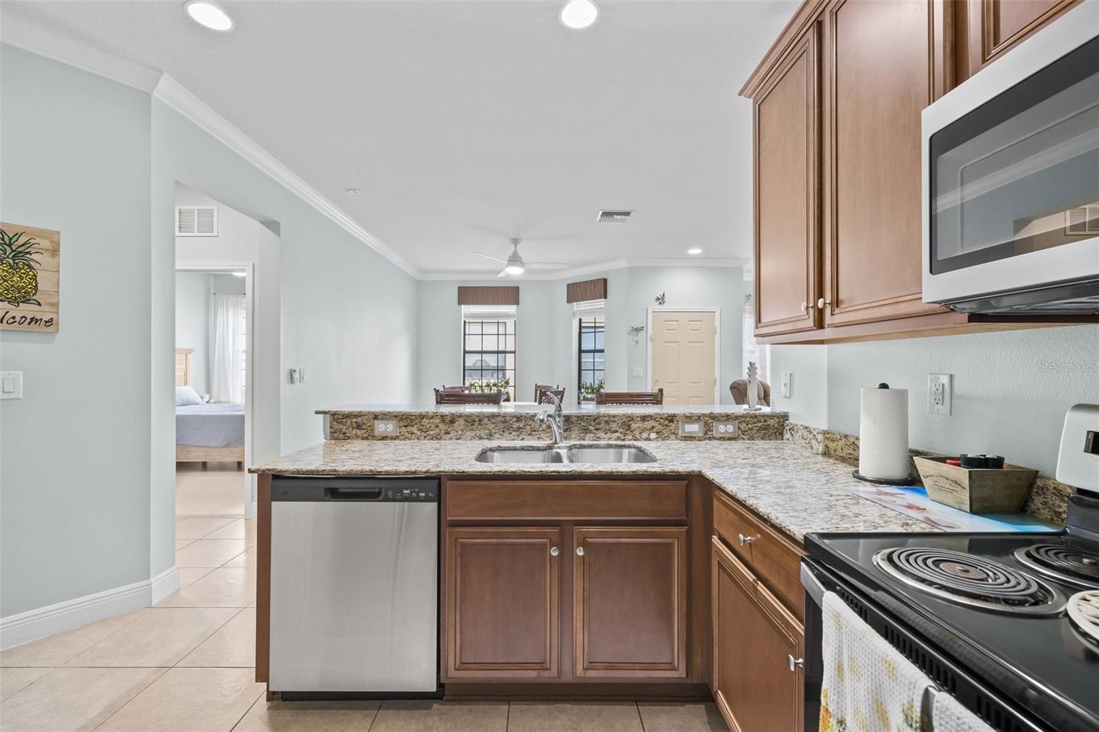 Charming villa with 2 bedrooms, 2 baths, and a 2-car garage nestled in the serene, gated community of SouthShore Falls by Del Webb! This inviting Everglades model features an airy open floor plan, adorned with tile flooring throughout most areas except the bedrooms, allowing ample natural light and ensuring privacy with no rear neighbors. Recently refreshed inside and out, it boasts window treatments, blinds, and elegant crown molding enhancing the great room, kitchen, and dining spaces. The well-appointed kitchen showcases a breakfast bar, 42" wood cabinets, stainless steel appliances, a closet pantry, and sleek granite countertops. Ideal for hosting gatherings, the spacious great room seamlessly connects to the screened lanai through sliding doors. The primary suite indulges with his/her closets and a primary bath featuring dual sinks and a roomy walk-in shower. Guests enjoy privacy with the split bedroom layout, while the inside utility room, complete with washer and dryer, adds convenience to laundry days. SouthShore Falls offers a wealth of amenities for residents. Outdoor enthusiasts can delight in tennis courts, pickleball, pools, and a fitness room. Conveniently situated off US41 near I75, it provides easy access to Tampa, Sarasota, gulf beaches, major attractions, cultural venues, medical facilities, shopping, and dining options. Don't miss the opportunity to make this exceptional home yours—call today to begin the journey!