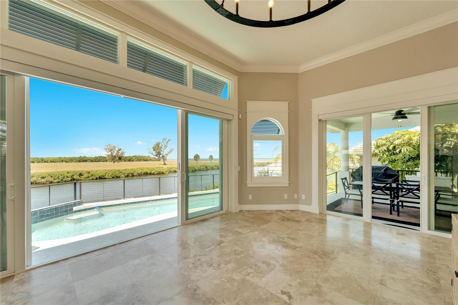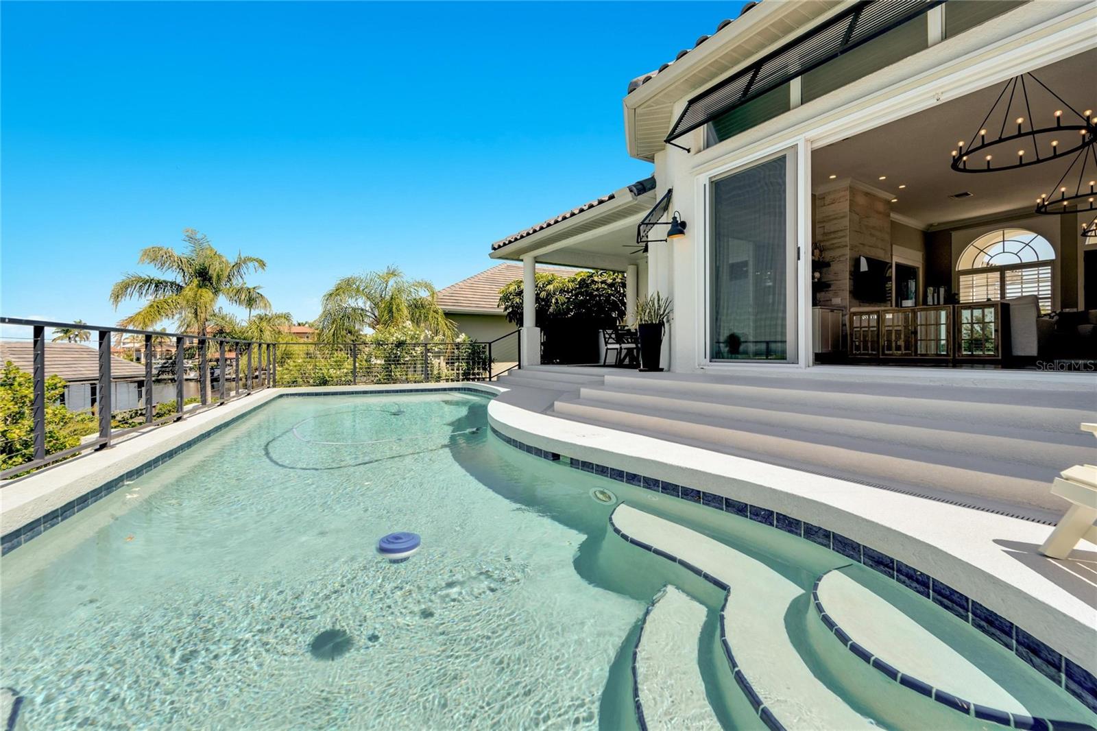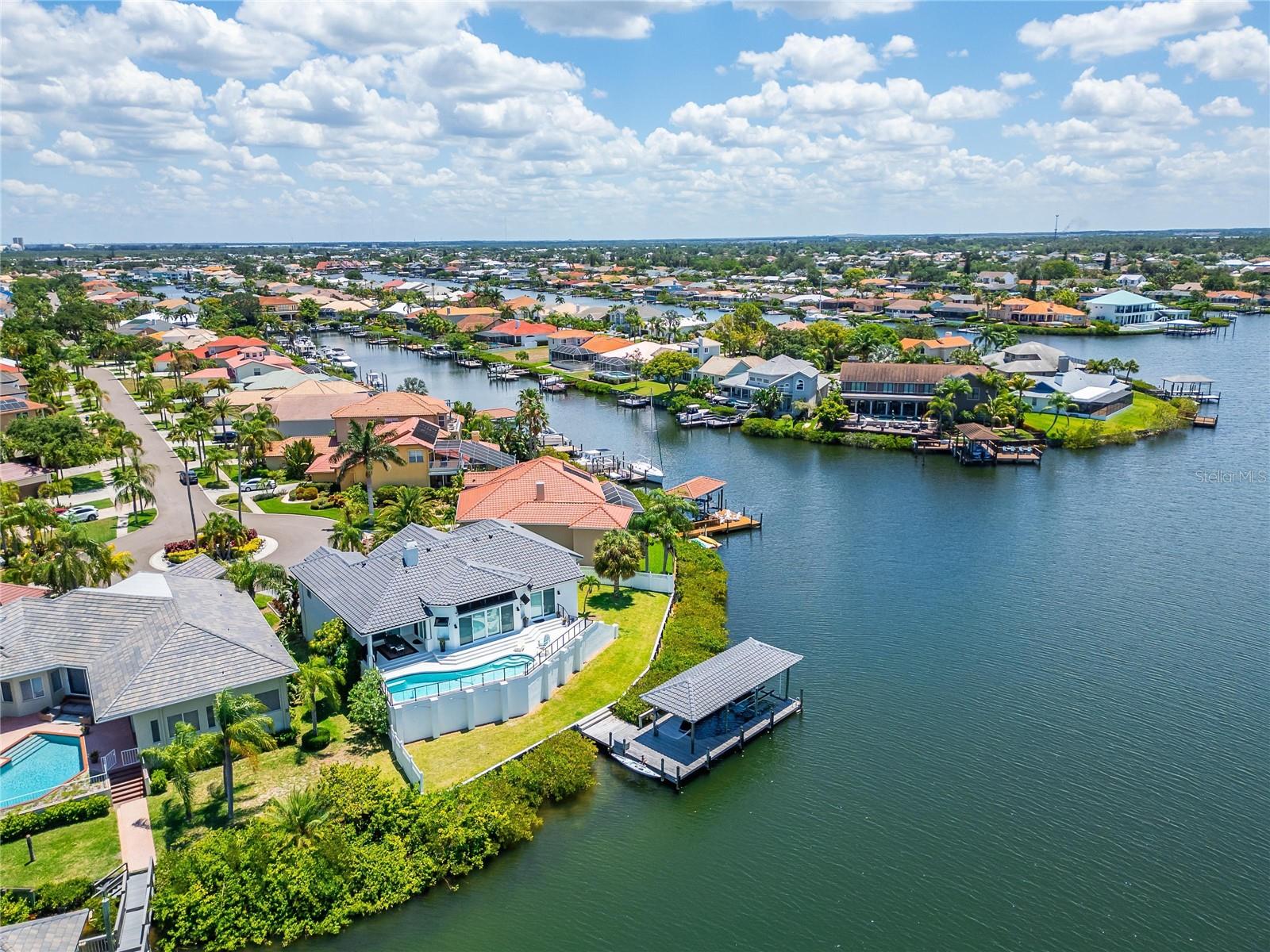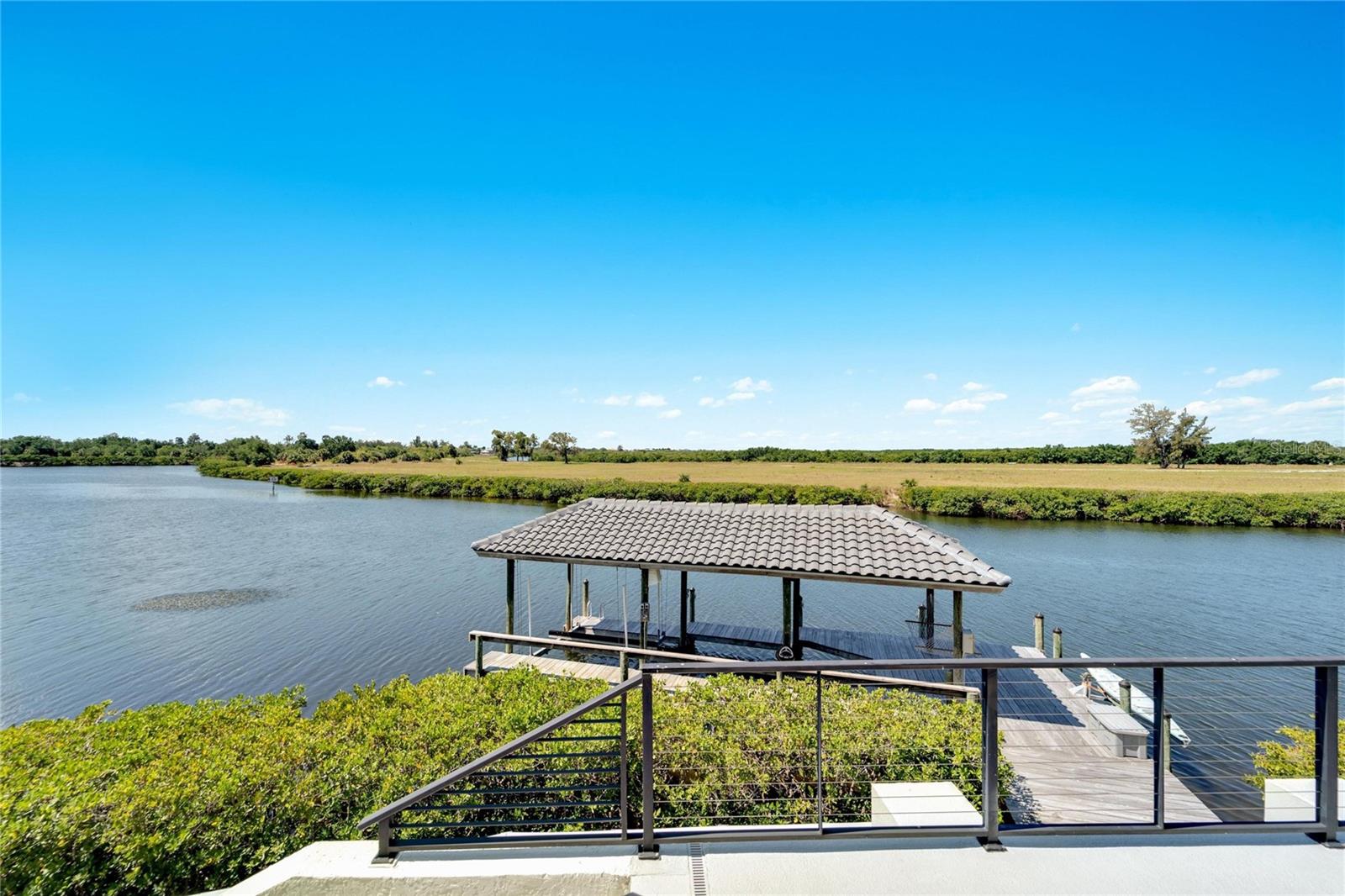 Check out your views from this coastal luxury turn key waterfront home with 140 feet of water shoreline! This exquisite property features 4 bedrooms and 3 full and one half bathrooms with wraparound water views including stunning vistas of Tampa Bay and the St. Petersburg skyline. Prepare to be captivated by the breathtaking sunset views this home has to offer. As you enter this coastal paradise, you're greeted by panoramic water views, 13 foot ceilings, travertine flooring throughout, an inviting great room with gas fireplace and dining area open to the kitchen with an additional seating area. This home is an entertainer's dream. Sliders from living area lead out to your heated saltwater pool and covered lanai area. This makes for a perfect set up for all your gatherings. When its time to unwind head to the primary bedroom with ensuite and 2 walk-in closets, plus sliders that lead out to the lanai area. The primary bath includes double sink vanity, separate soaking tub and walk-in shower. Opposite side of the home you will find guest bedroom with ensuite, plus 2 additional bedrooms and full hallway bathroom. The attractive staircase leads to laundry room with sink and work area. From here you will enter into your garage with 5 panel doors for boat and lifted truck clearance. Garage includes 2,900 sq. ft., workshop area and half bath. This space can hold up to 6 cars. Outside is where you will be spending most of your time. Enjoy your own private dolphin and manatee show from your covered boat dock with water, electric, fishing station, and 12,000 pound boat lift that can house a 35 foot boat. Plenty of dock space to sit and relax and watch the show! Leaving from your dock you are minutes away from the open waters of Tampa Bay. This is truly a boater's paradise! Feel safe and secure with home security system and 24 hour gated community of Symphony Isles. Home and dock tile roof installed 2023. This home also includes well water for affordable lawn irrigation. The community of Symphony Isles features 24 hour guard security at gate, community club house for all social gatherings, community pool, playground, boat ramp and private beach for residents and NO CDD!! Travel time to Tampa International Airport is 25 miles (35 minutes) MacDill Air Force Base is 27 miles (40 minutes) 1 hour to the beautiful beaches of Tampa Bay. This is the one!!