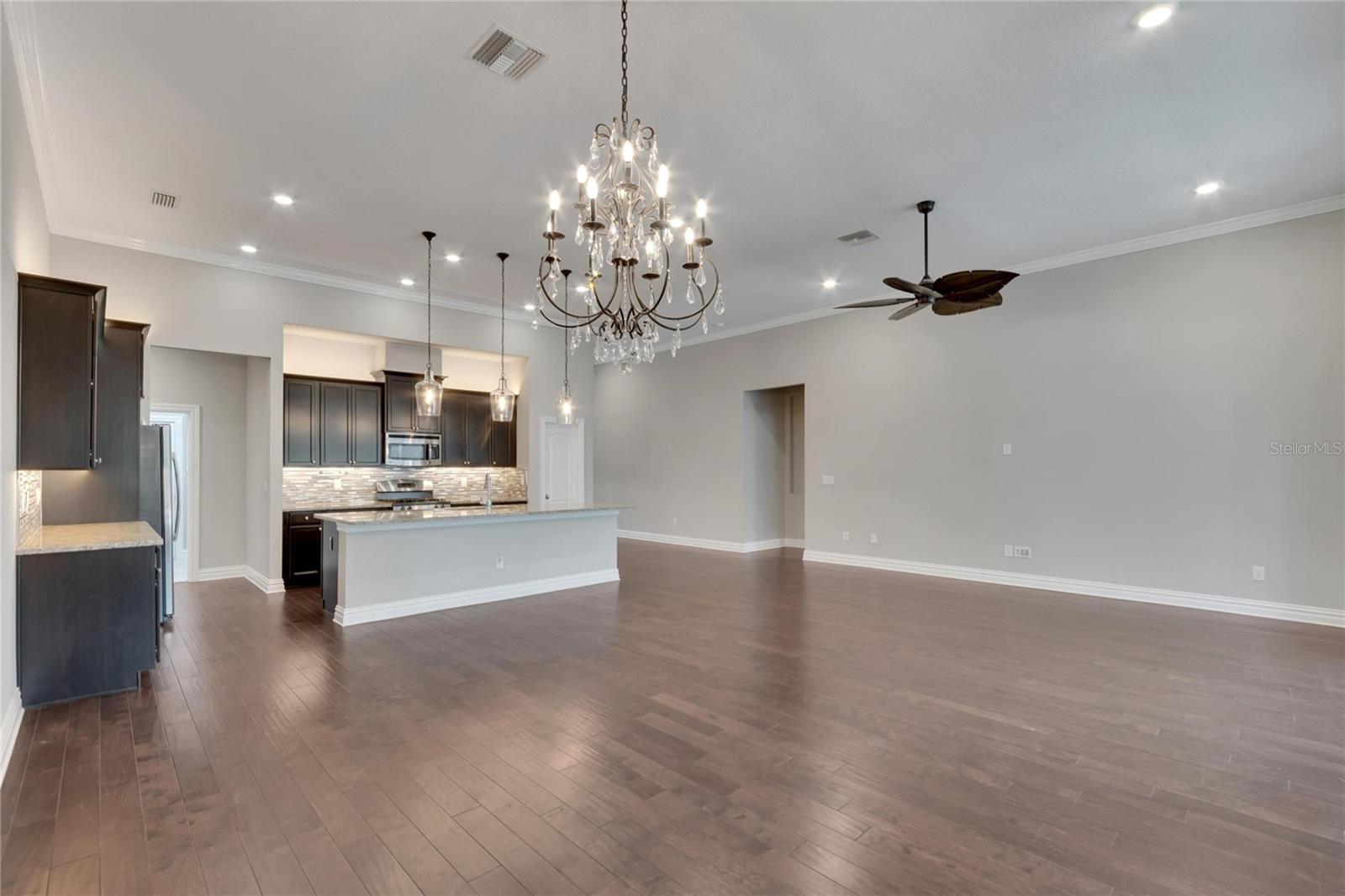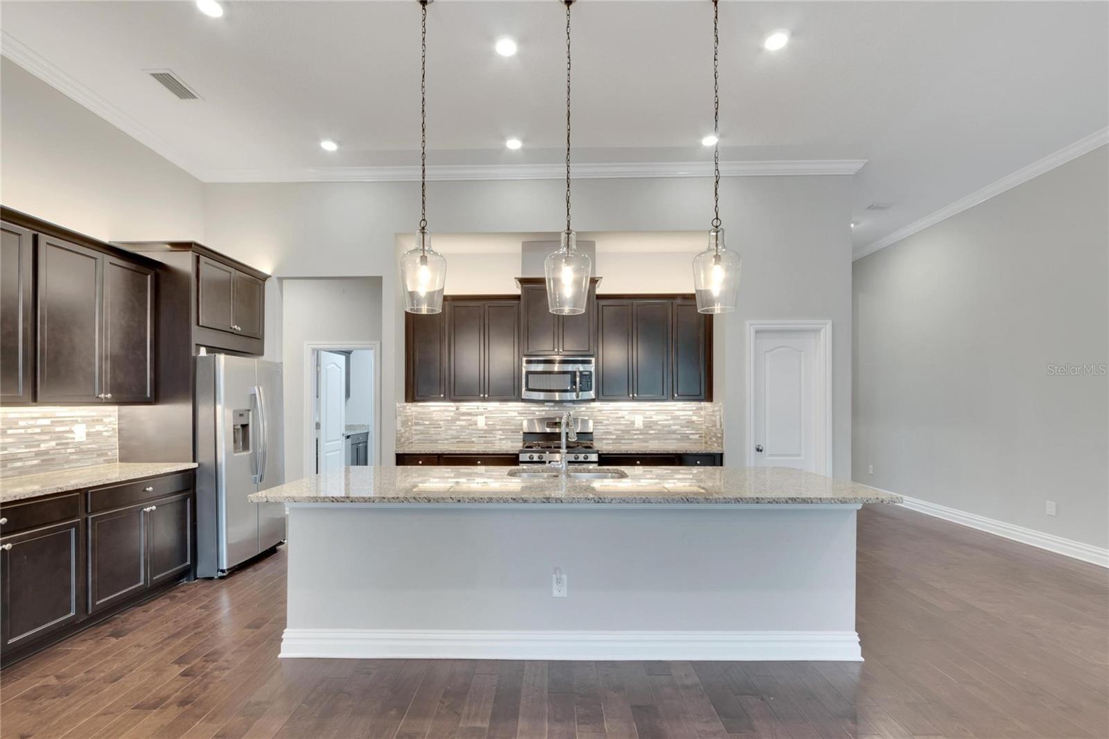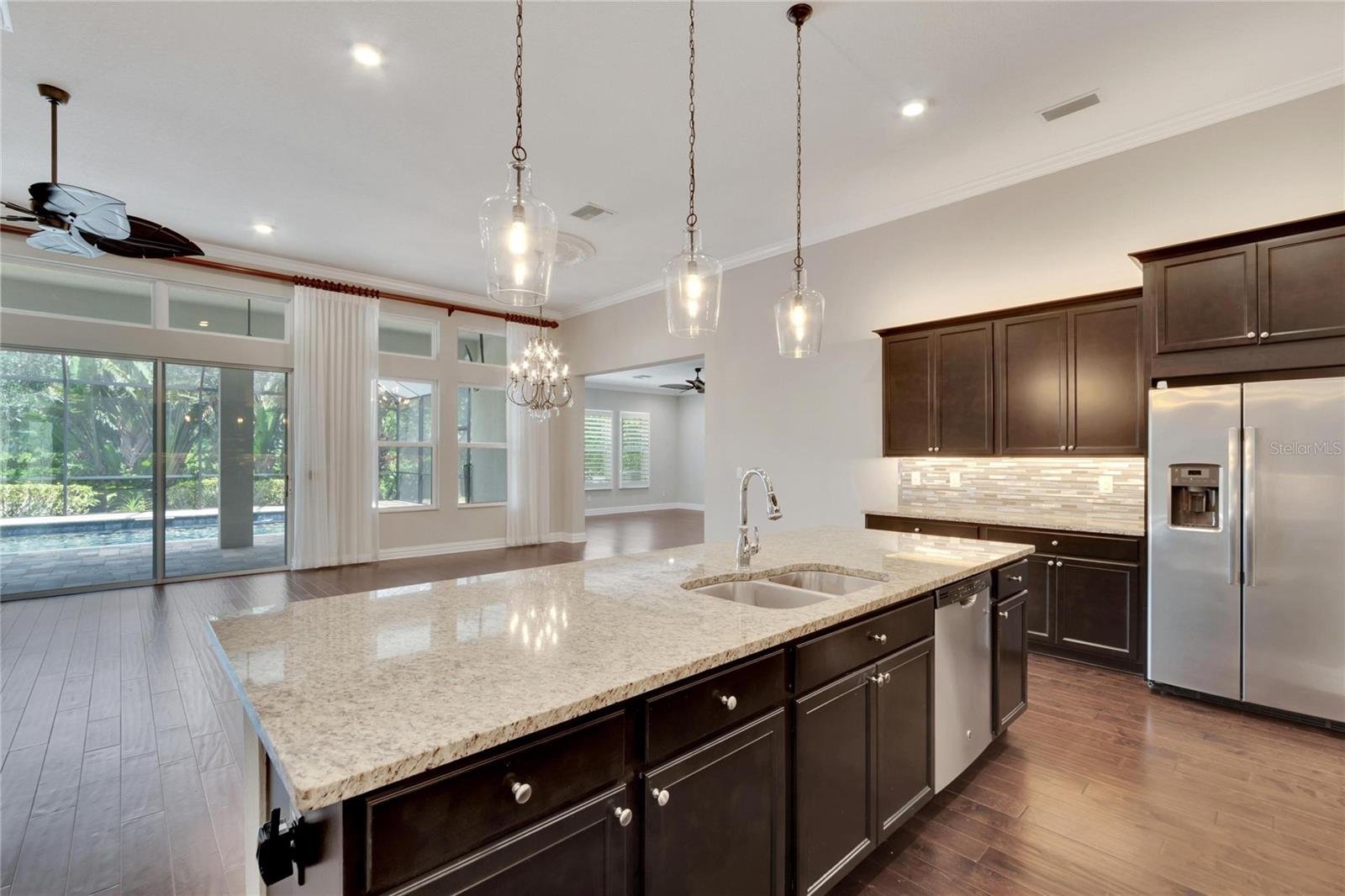 "Welcome Home! This meticulously mantained Cardel Florida Home in the desirable community of Waterset features 4 bedrooms, 3 bathrooms, a 3-car garage with parking for 6 cars, and a UVA protection screened-in heated saltwater black-bottom pool with a tropical landscaped privacy oasis. The home is equipped with a Generac System powered by natural gas to ensure uninterrupted utilities during power outages, storms, or emergencies. Other features include engineered hardwood flooring throughout the main living area, 12" high ceilings, crown molding, large built-in shelves, recessed lighting, Vortex Security System, floor-to-ceiling custom curtains with wooden 4" rod, wooden 3" plantation shutters on all windows, ceiling fans, tankless water heater, smart thermostats, new steel garbage disposal, a spacious office with attached extra room, an oversized laundry room, hurricane panels, gas appliances, and overhead garage storage. The kitchen boasts granite countertops, stainless steel appliances, microwave, a 5-burner gas cooktop, 42" upper cabinets with crown molding and under-cabinet lighting, a backsplash, an oversized island, and a walk-in corner pantry with built-in shelving. The primary bathroom features dual vanities, granite countertops, a walk-in shower with a rain showerhead, a garden tub, and a spacious walk-in closet with built-in shelving. A Jack and Jill bathroom seamlessly merges two bedrooms, providing a convenient and practical solution for families. The backyard oasis can be accessed through 15' glass sliders giving you a seamless indoor/outdoor living leading to a covered patio with pavers, the tropical landscaping includes matured Queen, Foxtail and Traveler palm trees. Other features include ceiling fans and a TV, which you can watch from the built-in seating bench in the pool. A garden allows you to grow veggies. The community of Waterset, offers multiple clubhouses, dog parks, fitness centers, 3 resort-style pools, playgrounds, splash pad, parks, walking trails, and an active lifestyle/activities program. Several schools, including charter school options, are within a 5-minute drive. The location between I-75, US Hwy 41 and the Crosstown provides convenient commuting options to Tampa, St. Pete, and Sarasota. Nearby amenities include the biggest newly built sports complex in the county, dog spa, grocery stores, restaurants, a YMCA, and a new town center with shops and restaurants currently under construction.
