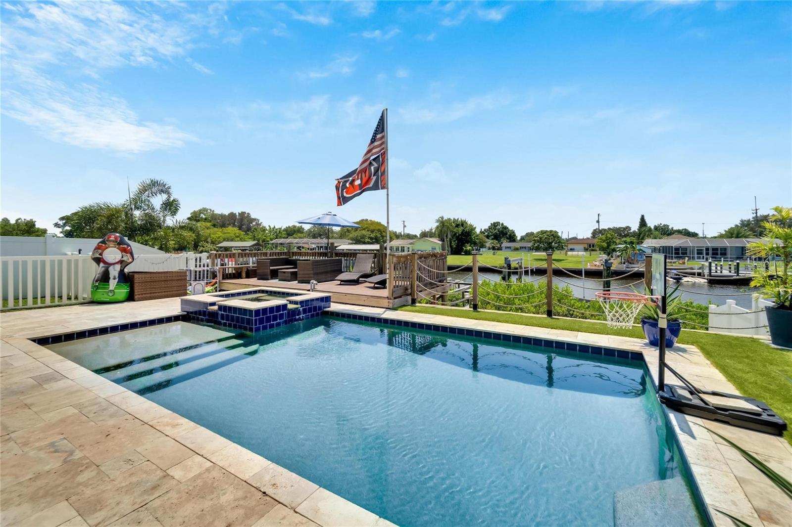 This serene waterfront oasis in Apollo Beach is built to stand against storms with double sea walls ensures you are high and dry! Welcome to modern luxury and coastal charm! This stunning 3,831 SQ FT residence boasts five spacious bedrooms. Four of the bedrooms being full en-suites. This home was custom built with love, no detail missed! Situated in a gated community on the end of the Cul-de-Sac provides ample privacy! The custom teak wood exterior and interior ceilings, water views and natural light really creates a harmonious balance of comfort and modernity! Upon entering through the glass door you will immediately notice the heart of the home! This living, dining, and kitchen are sure to wow you! The Chef's kitchen is equipped with top of the line Thermador gas appliances, stainless steel farmhouse sink, double thickness quartz countertops, oversized island and additional custom bench seating! The spacious living room, and dining invites culinary adventures with an aesthetic flow! The generous open concept illuminates with natural light and water views from every angle! Outdoor living is redefined here, starting with beautiful sealed travertine floors, outdoor lighting and turf grounds, complementing the fully equipped Coyote gourmet outdoor kitchen. Enjoy dinner on the composite wood deck while overlooking the salt water pool and spa or watching manatees and dolphins play in the canal! Walking onto the composite dock, you will find a 16,000 lb boat lift and E-Z Port jet ski docks. With electric and water on the dock, fishing and cleaning your boat become effortless. Below the deck, you'll find ample storage for kayaks and other outdoor toys. In addition there is an exterior storage room, and dog run with natural grass. Upstairs you will find four en-suite bedrooms! Three of which have a private balcony. The primary bedroom boost a spectacular en-suite smart shower with multiple rain heads and a truly impressive closet! You will also find a very well appointed laundry room full of custom cabinetry and tons of space. Let your imagination run with the spacious upstairs dry bar! Additionally, the residences features 2 brand new AC units, smart home technology keyless entry, interior and exterior systems controlled by your phone, and Custom fans through out. Also Finished attic, rubber flooring in the garage, and sealed brick paver driveway. With its meticulous design and attention to detail, this home is an exceptional retreat for relaxation and entertainment. You are a 10 minute boat ride to Tampa bay! Apollo Beach is rapidly growing area! About 35 mins to McDill Airforce base, Tampa International Airport, and some of Florida's best beaches! Centrally located between Tampa and Bradenton!