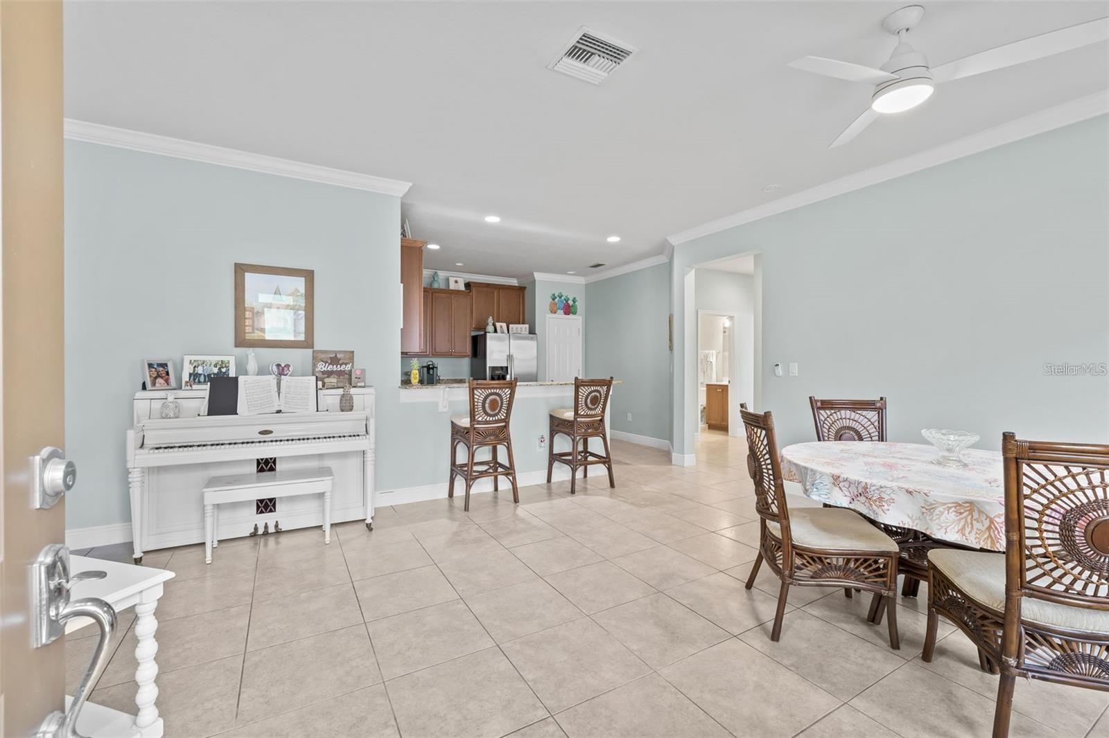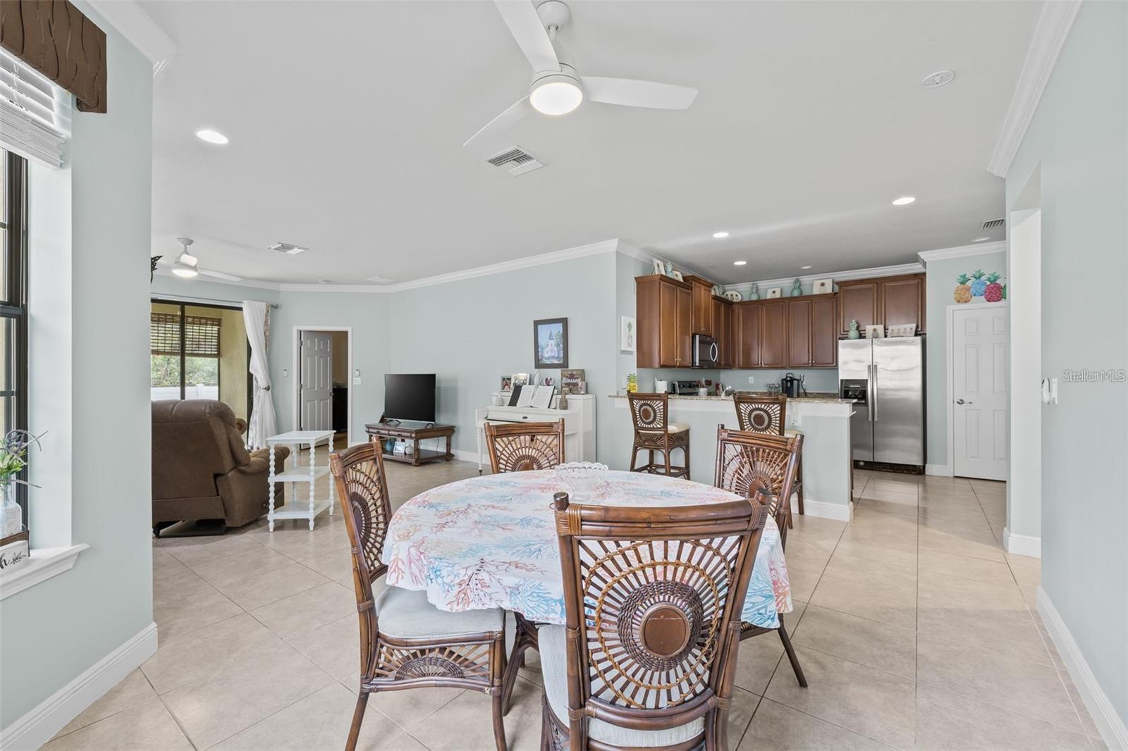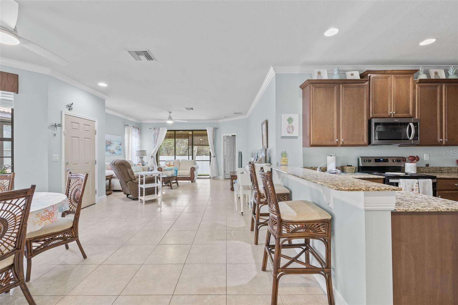 Under contract-accepting backup offers. Discover this charming 2-bedroom, 2-bath villa with a 2-car garage, located in the peaceful, gated community of SouthShore Falls by Del Webb! This delightful Everglades model offers a bright, open floor plan with tile flooring throughout most of the home (luxury vinyl in the bedrooms), providing a light, airy atmosphere and plenty of privacy with no rear neighbors. Recently updated both inside and out, the home features window treatments, blinds, and stylish crown molding that complement the great room, kitchen, and dining areas. The kitchen is a true highlight, featuring a breakfast bar, 42" wood cabinetry, stainless steel appliances, a closet pantry, and beautiful granite countertops. Ideal for entertaining, the spacious great room opens seamlessly to the screened lanai through sliding glass doors. The private primary suite includes his-and-her closets and a luxurious en-suite bath with dual sinks and a large walk-in shower. Guests will enjoy their own space with a split-bedroom layout, while the inside utility room with washer and dryer adds to the home's practicality. SouthShore Falls offers an abundance of amenities, including tennis and pickleball courts, pools, and a fitness center. Conveniently located near US41 and I-75, this home offers easy access to Tampa, Sarasota, Gulf beaches, shopping, dining, and top medical facilities. Don’t miss your chance to own this exceptional home—call today to schedule your private showing!