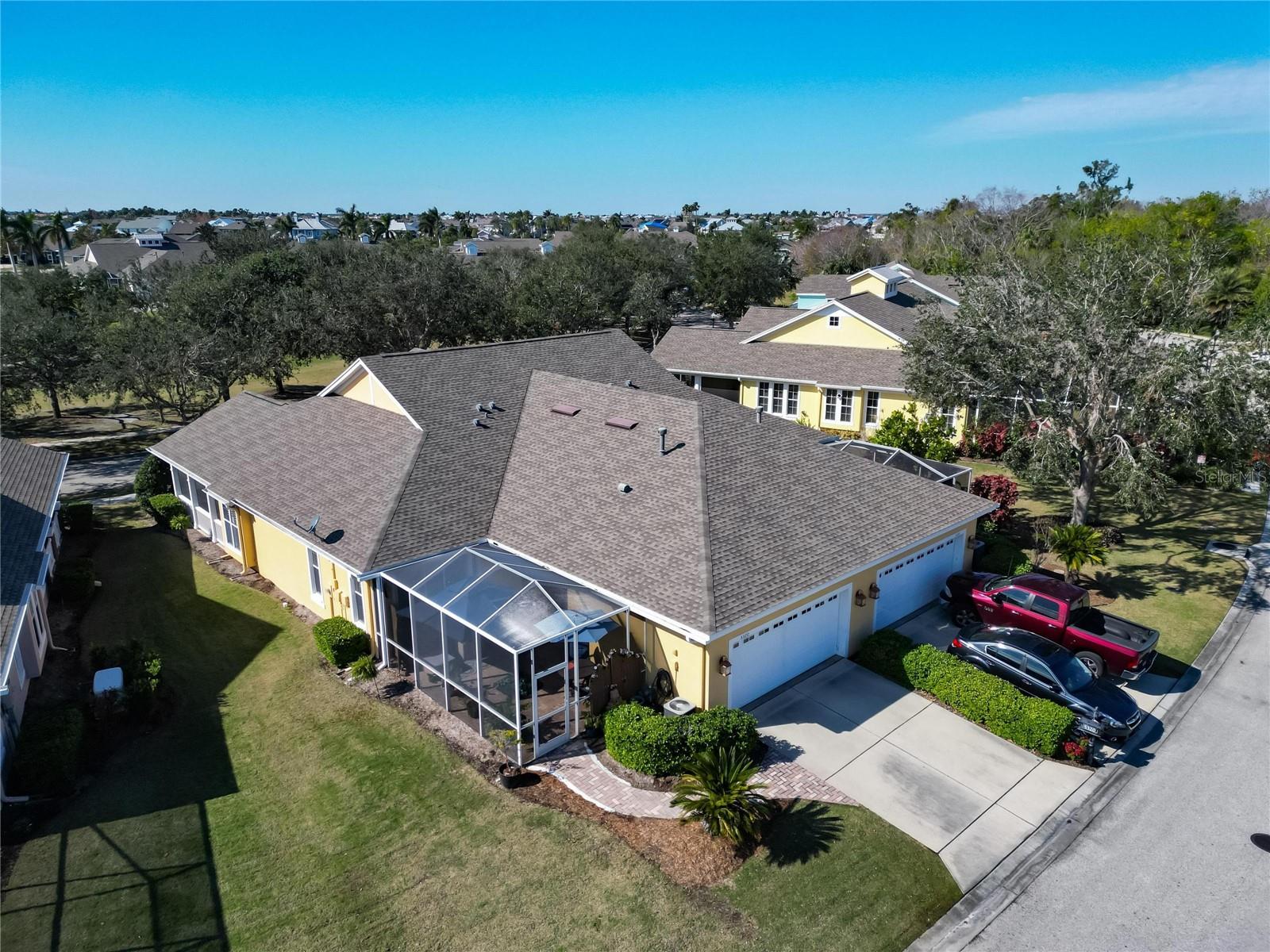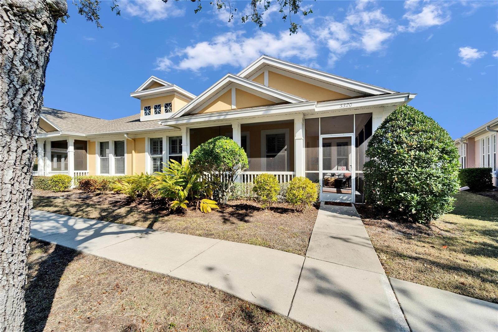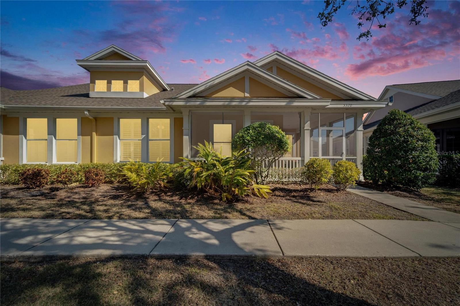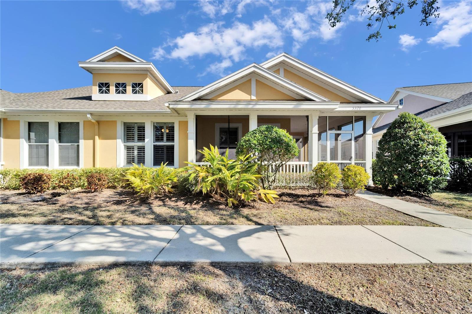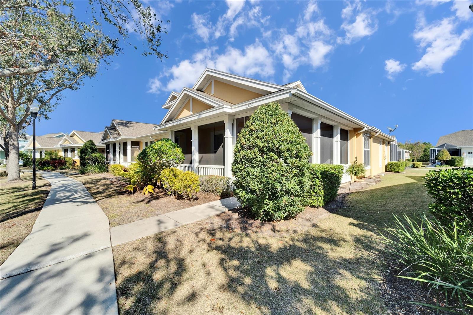 Welcome Home to this MiraBay Villa Home with two bedrooms (split floor plan) plus an Office/Study/Den/Bedroom, two bathrooms & attached two car garage with large screened Lanai and screened front porch. Third bedroom is currently being used as an Office. Features include engineered hardwood floors, plantation shutters, tray ceilings in the Owner’s Suite and Dining Room, garden tub in the main bathroom with split vanity and a large walk-in closet plus a shower, NEW roof 2022, NEW range 2024, NEW washer (2024), NEW microwave (3/2025), NEW frameless shower (Bath 2), freshly painted (white) kitchen cabinets, plantation shutters throughout, engineered hardwood except kitchen and bathrooms and more!! New lanai screening (1/2025). Furnishings optional. Move-in ready so you can start enjoying resort style living in gated MiraBay.