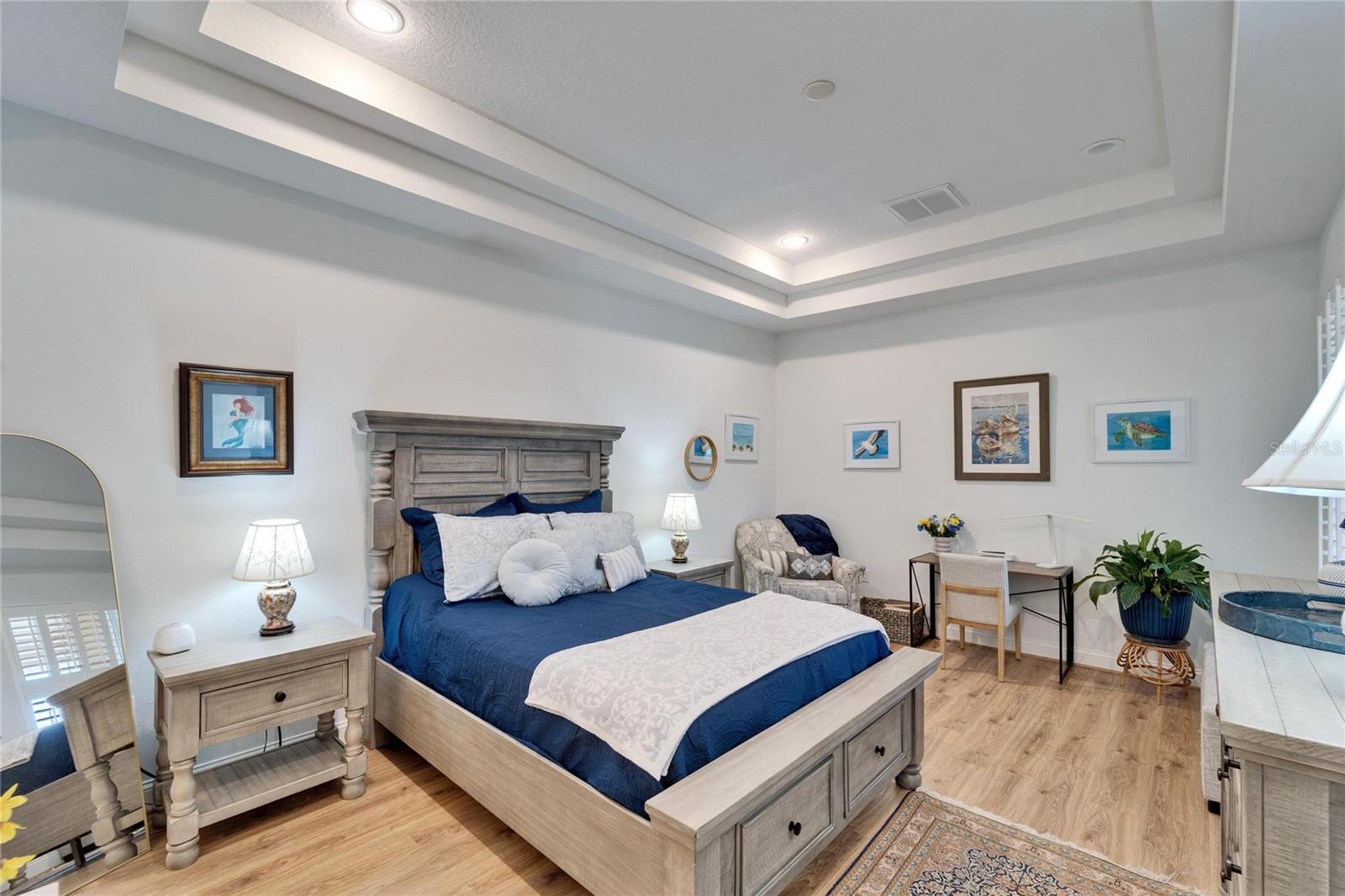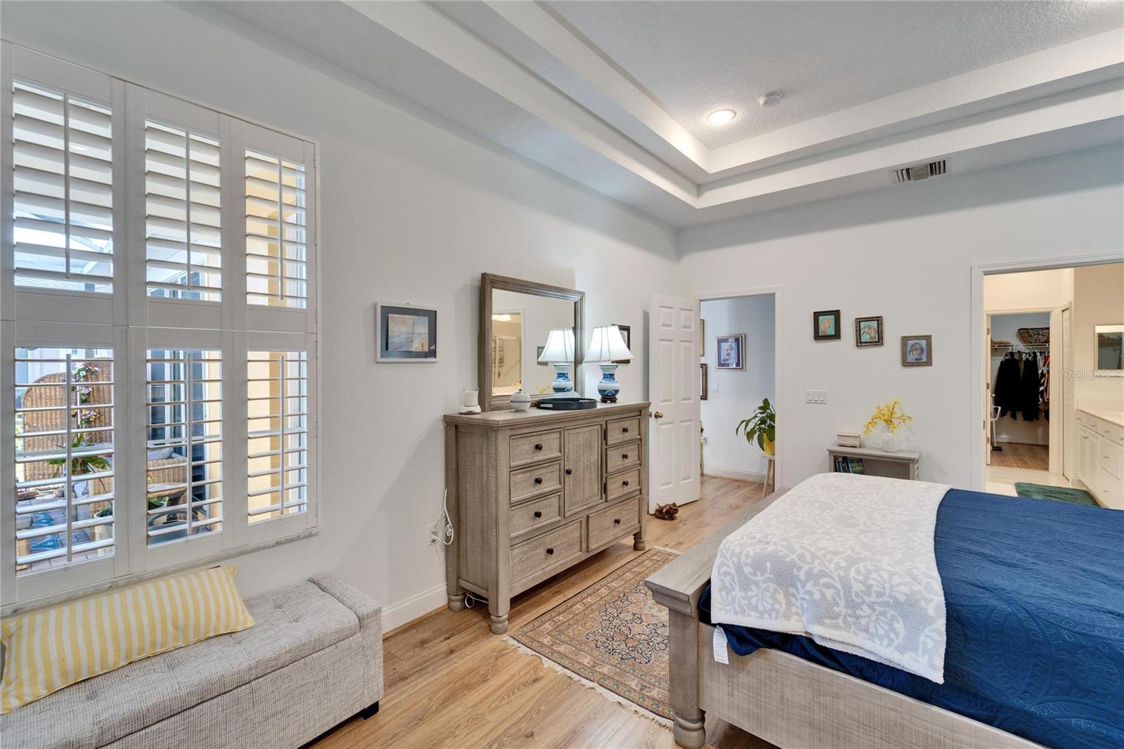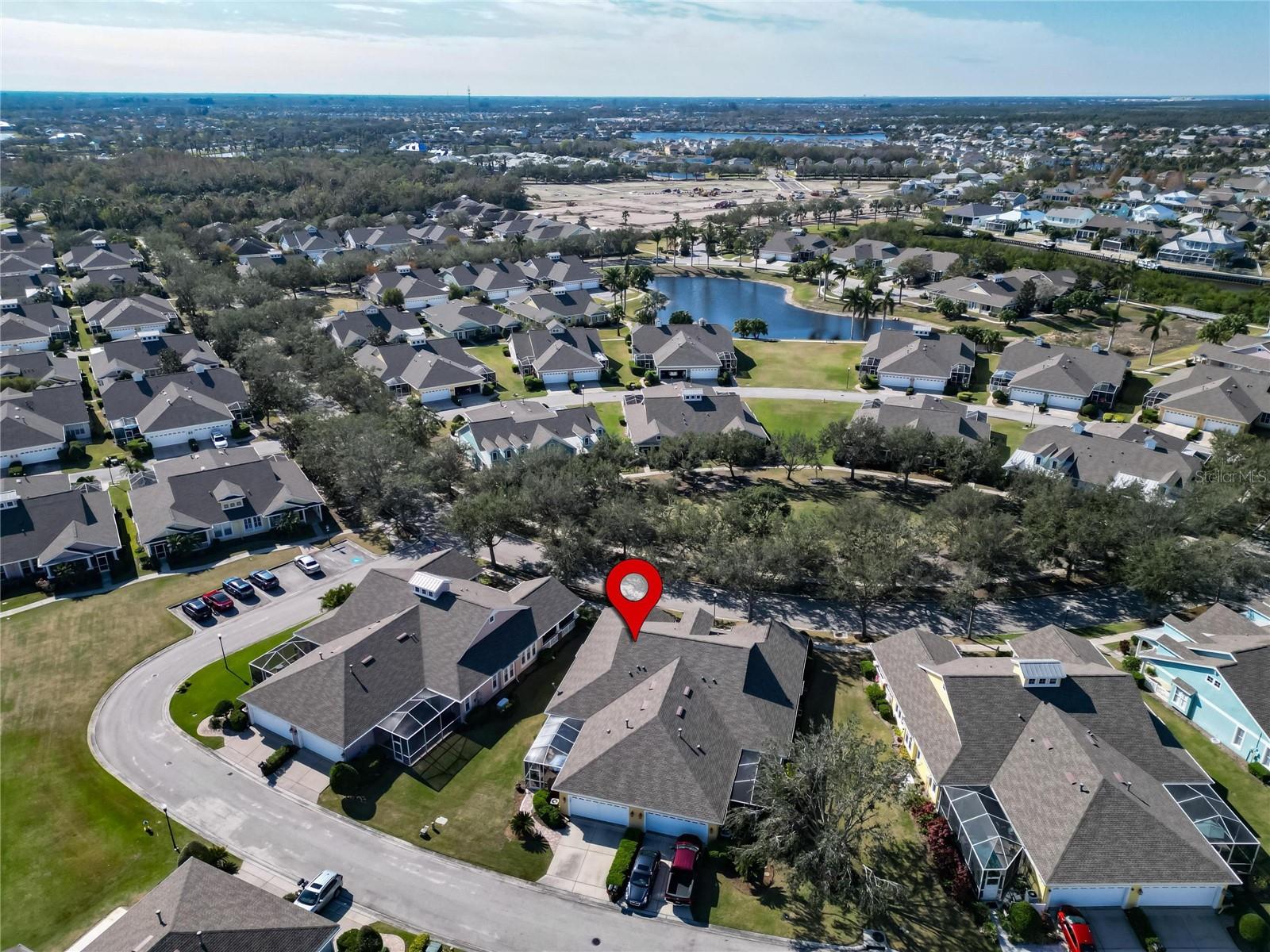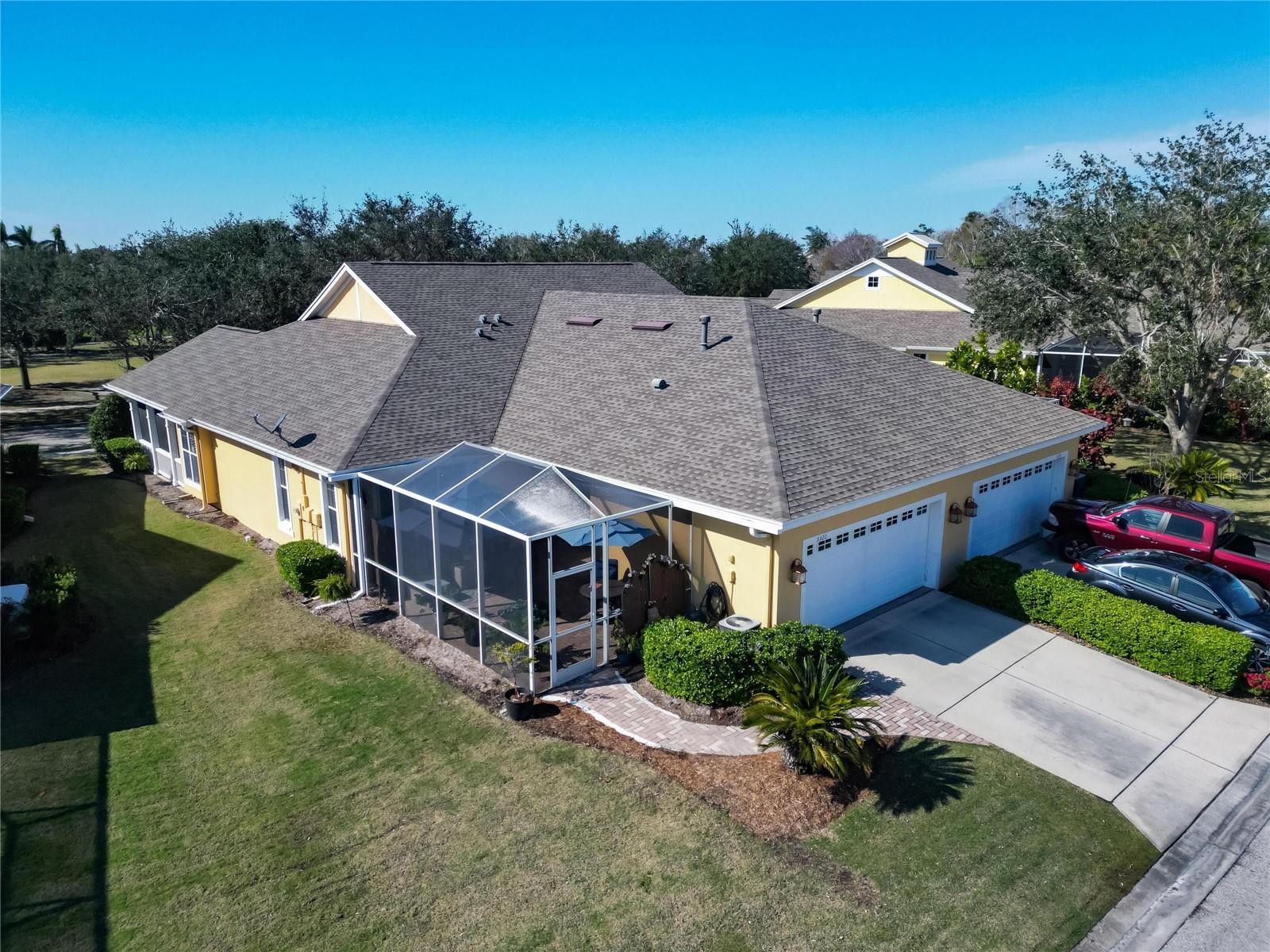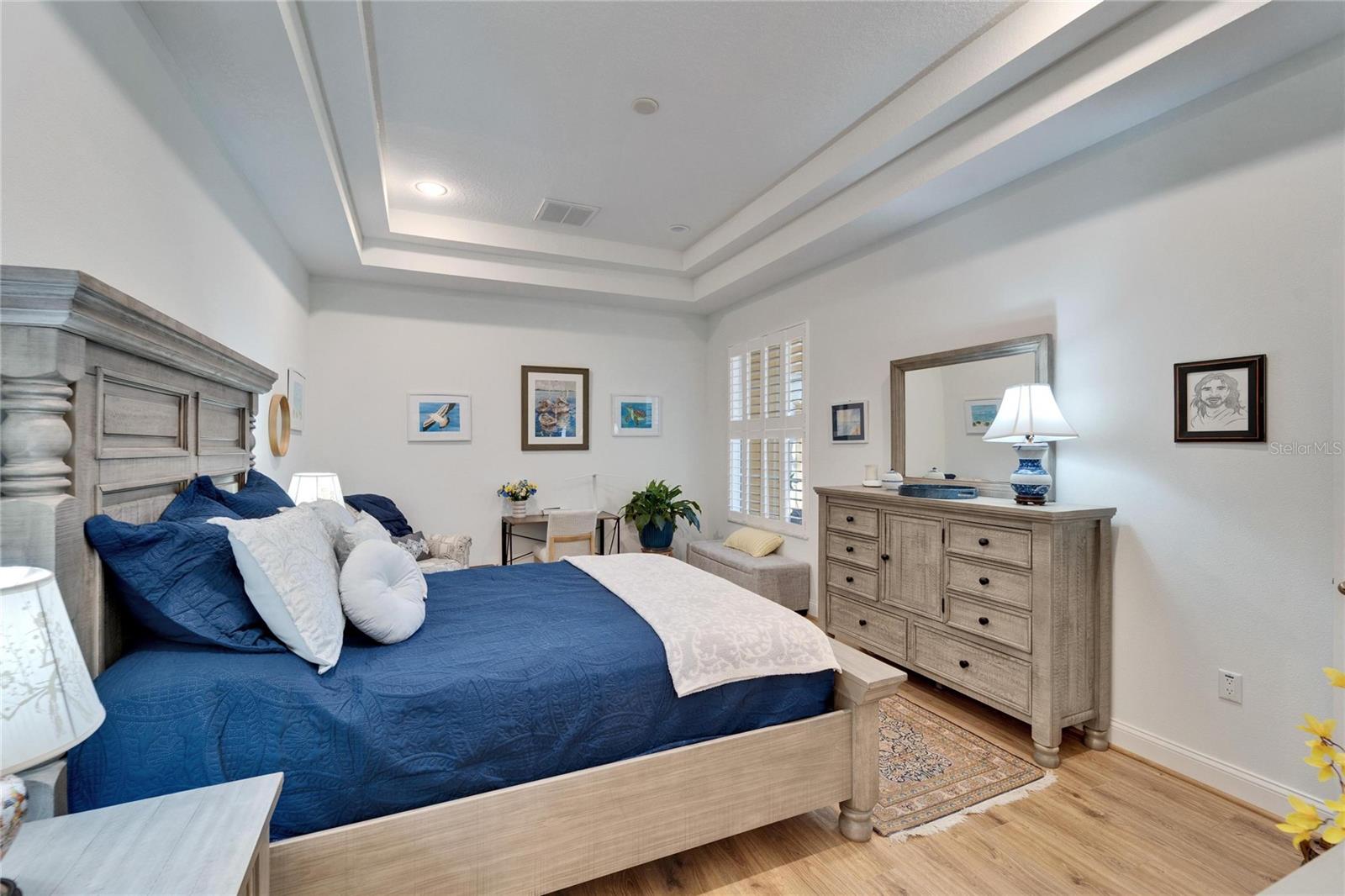 Welcome Home to this MiraBay Villa Home with two bedrooms (split floor plan) plus an Office/Study/Den/Bedroom, two bathrooms & attached two car garage with large screened Lanai and screened front porch. Third bedroom is currently being used as an Office. Features include engineered hardwood floors, plantation shutters, tray ceilings in the Owner’s Suite and Dining Room, garden tub in the main bathroom with split vanity and a large walk-in closet plus a shower, NEW roof 2022, NEW range 2024, NEW washer (2024), NEW microwave (3/2025), NEW frameless shower (Bath 2), freshly painted (white) kitchen cabinets, plantation shutters throughout, engineered hardwood except kitchen and bathrooms and more!! New lanai screening (1/2025). Furnishings optional. Move-in ready so you can start enjoying resort style living in gated MiraBay.