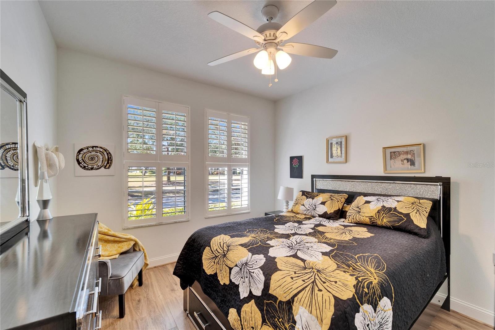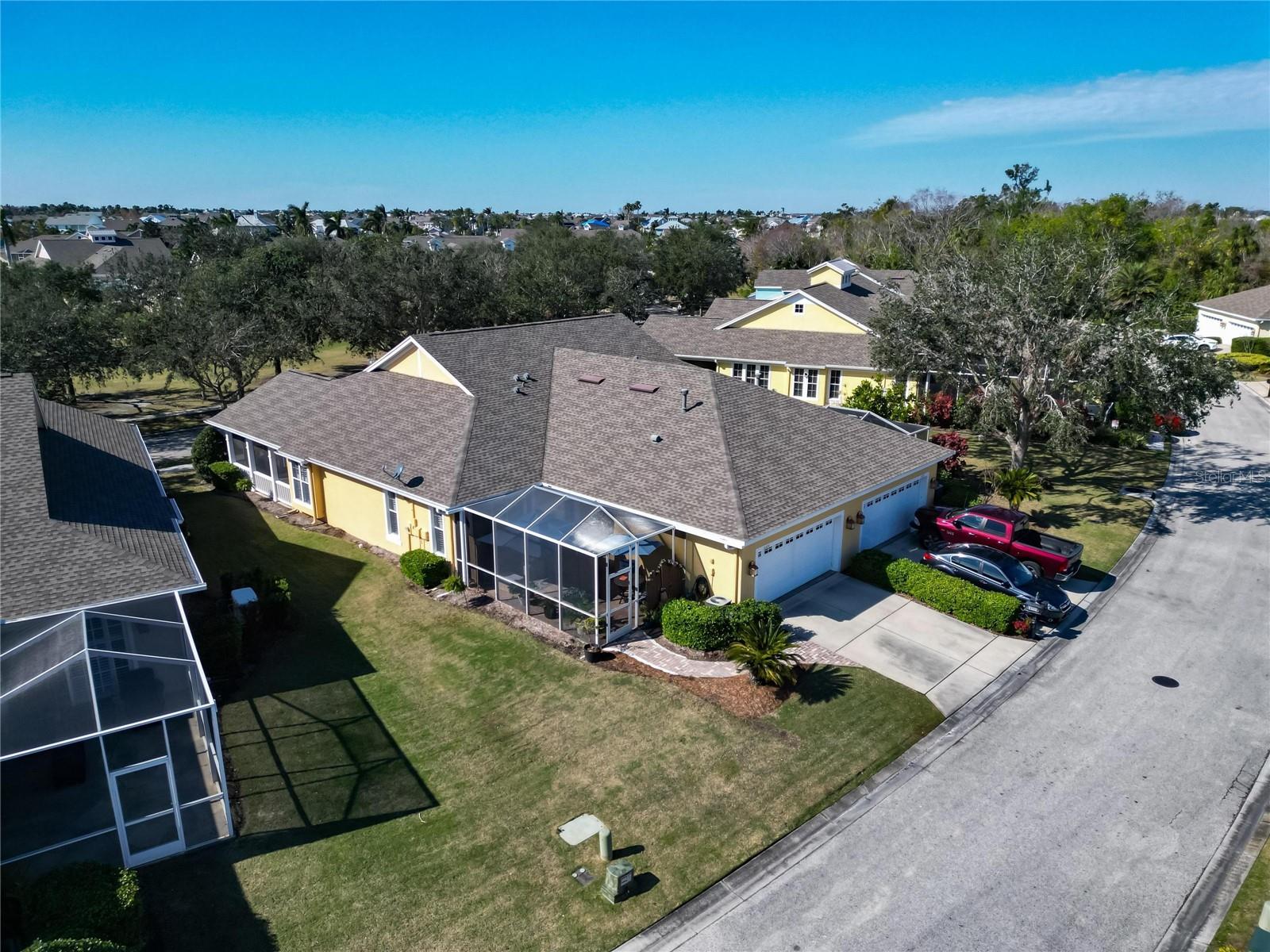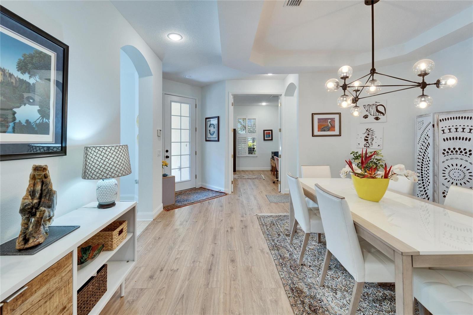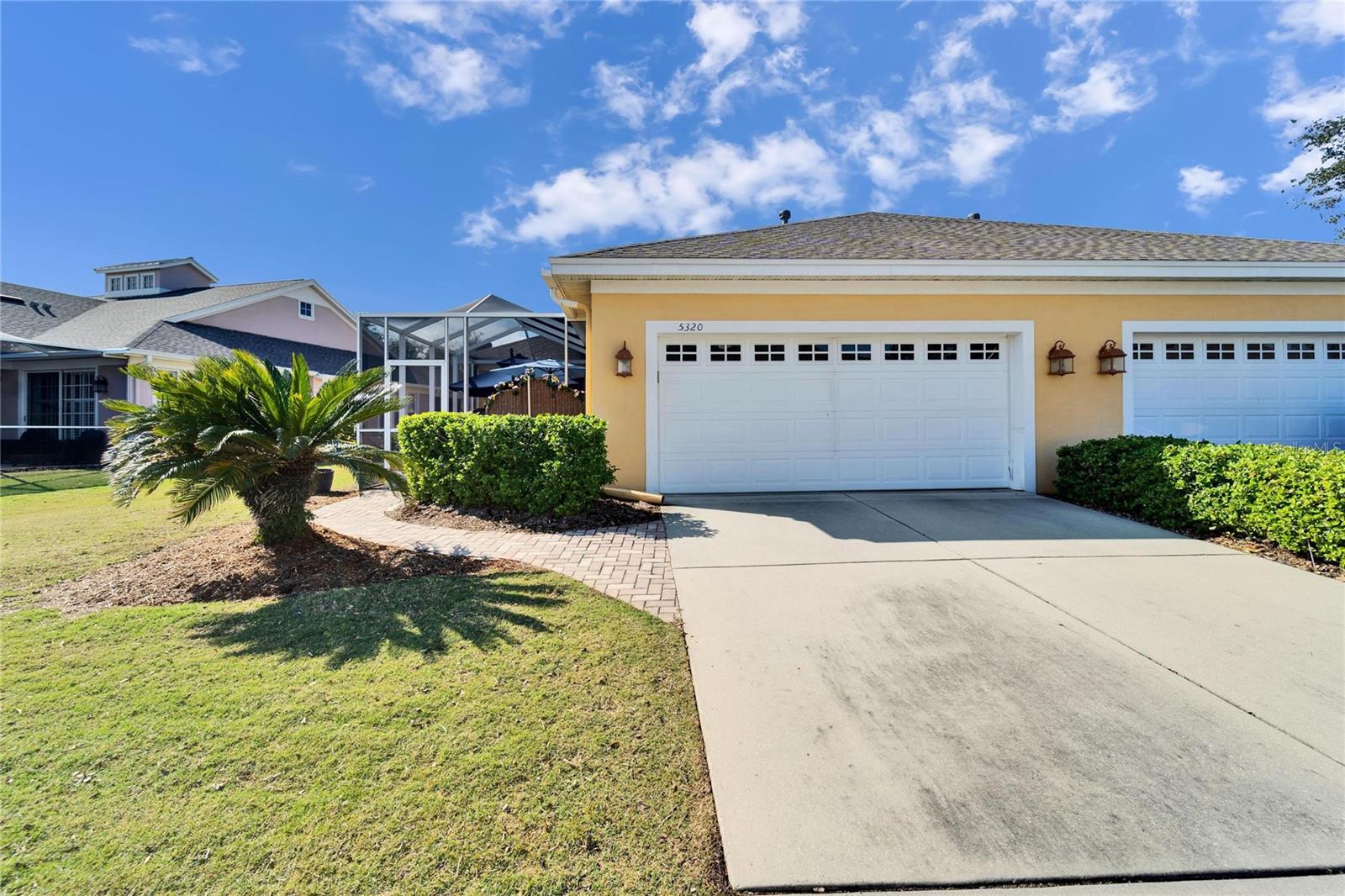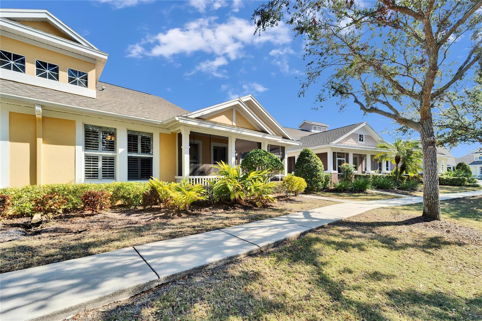 Welcome Home to this MiraBay Villa Home with two bedrooms (split floor plan) plus an Office/Study/Den/Bedroom, two bathrooms & attached two car garage with large screened Lanai and screened front porch. Third bedroom is currently being used as an Office. Features include engineered hardwood floors, plantation shutters, tray ceilings in the Owner’s Suite and Dining Room, garden tub in the main bathroom with split vanity and a large walk-in closet plus a shower, NEW roof 2022, NEW range 2024, NEW washer (2024), NEW microwave (3/2025), NEW frameless shower (Bath 2), freshly painted (white) kitchen cabinets, plantation shutters throughout, engineered hardwood except kitchen and bathrooms and more!! New lanai screening (1/2025). Furnishings optional. Move-in ready so you can start enjoying resort style living in gated MiraBay.