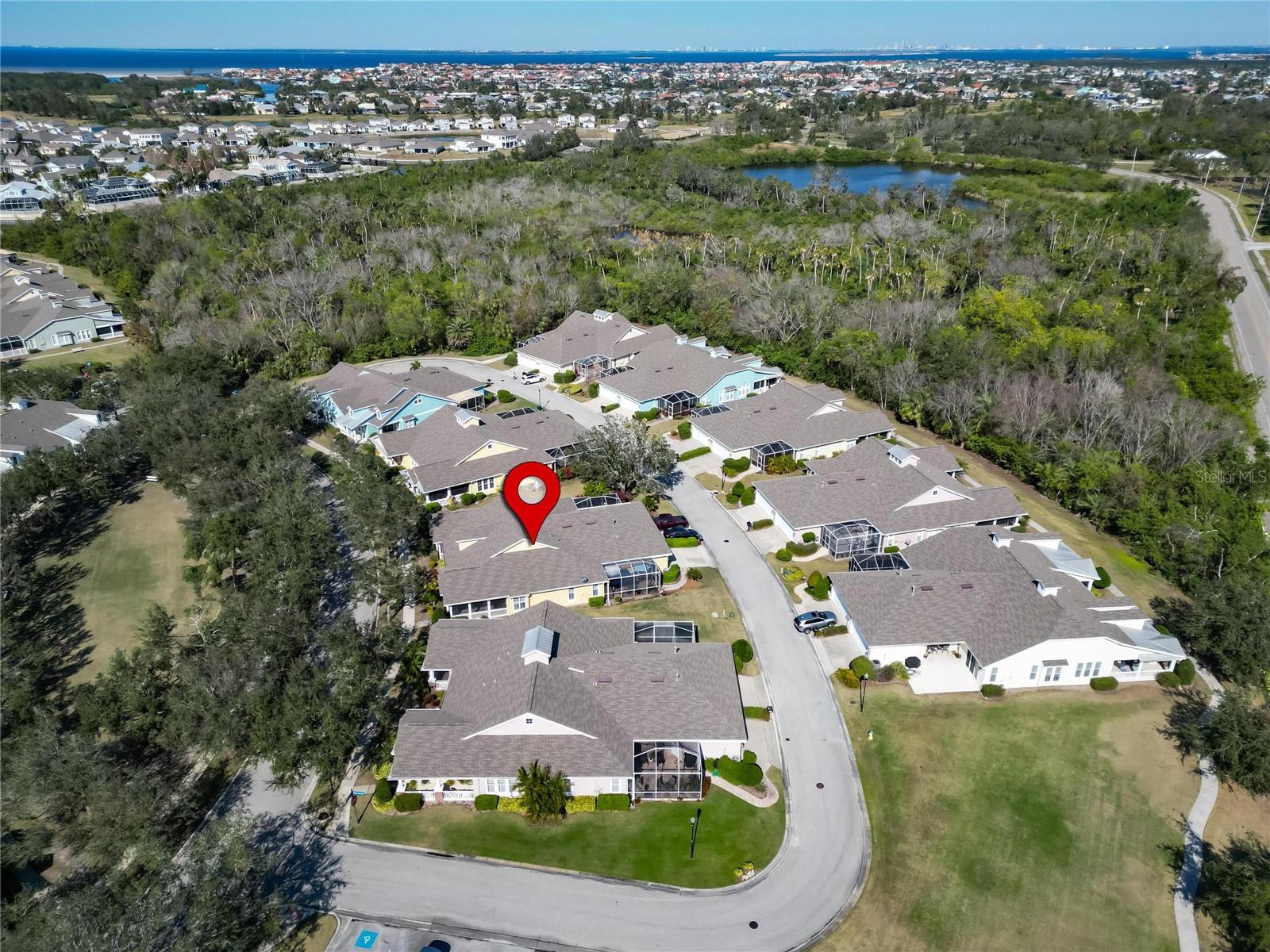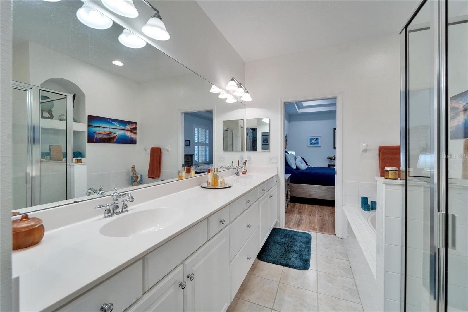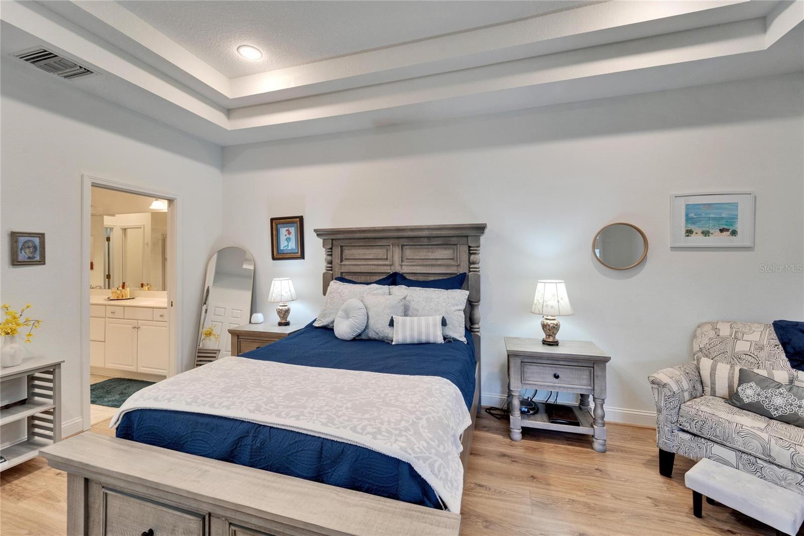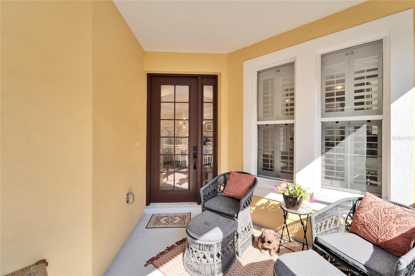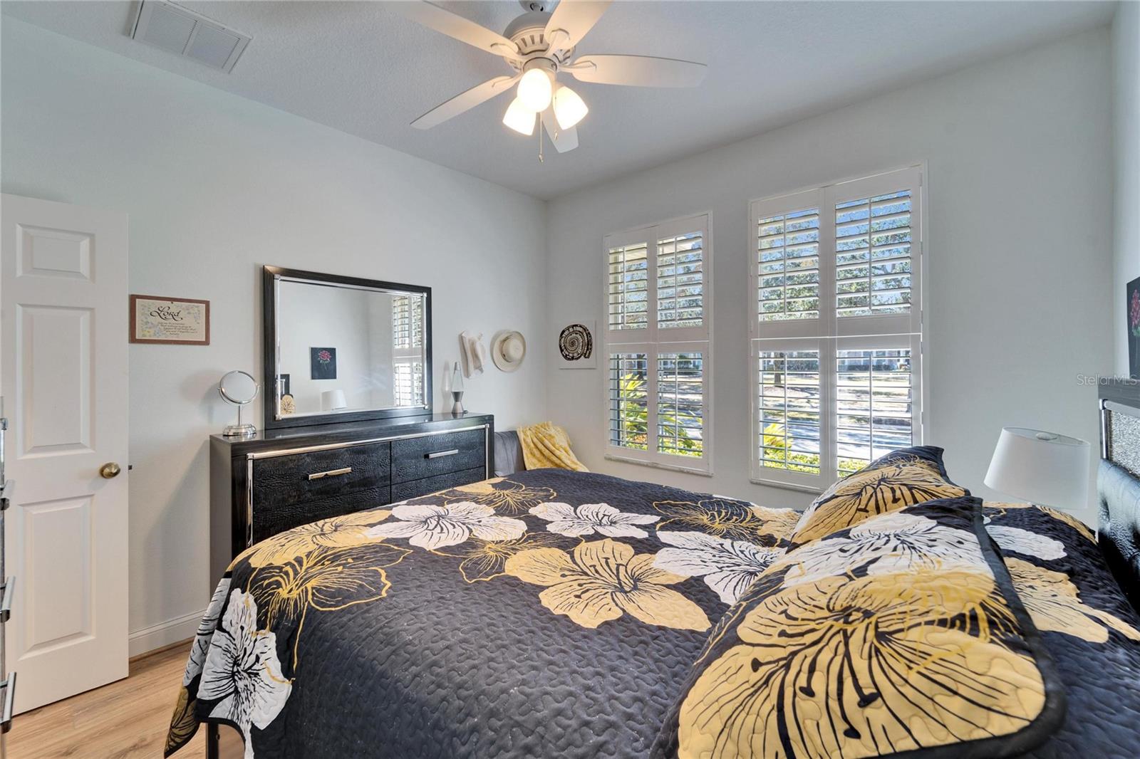 Welcome Home to this MiraBay Villa Home with two bedrooms (split floor plan) plus an Office/Study/Den/Bedroom, two bathrooms & attached two car garage with large screened Lanai and screened front porch. Third bedroom is currently being used as an Office. Features include engineered hardwood floors, plantation shutters, tray ceilings in the Owner’s Suite and Dining Room, garden tub in the main bathroom with split vanity and a large walk-in closet plus a shower, NEW roof 2022, NEW range 2024, NEW washer (2024), NEW microwave (3/2025), NEW frameless shower (Bath 2), freshly painted (white) kitchen cabinets, plantation shutters throughout, engineered hardwood except kitchen and bathrooms and more!! New lanai screening (1/2025). Furnishings optional. Move-in ready so you can start enjoying resort style living in gated MiraBay.