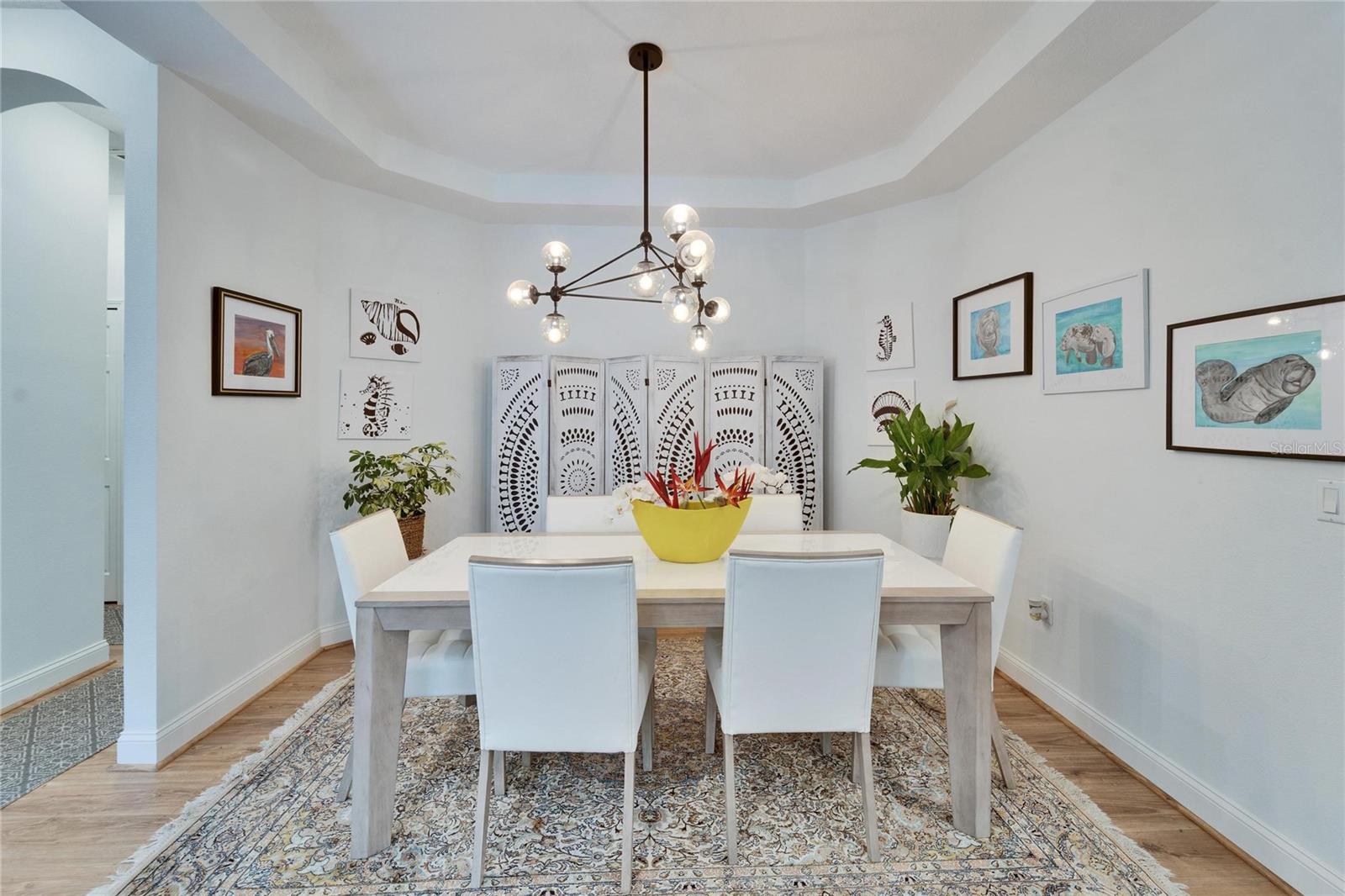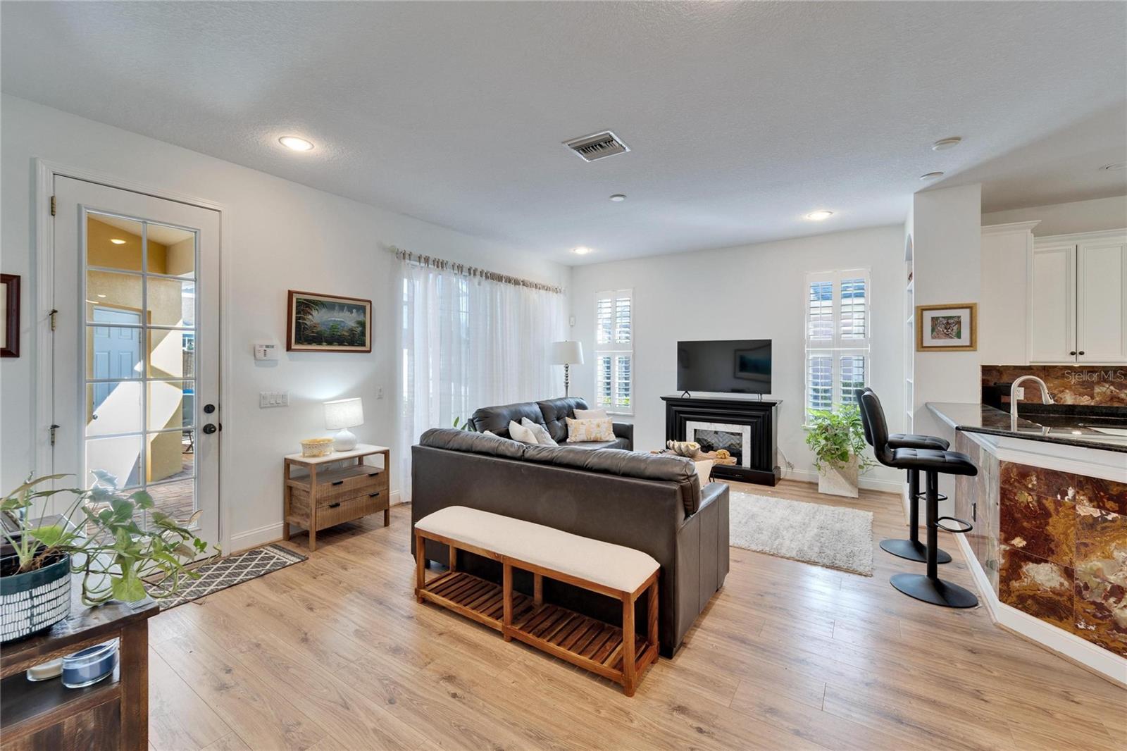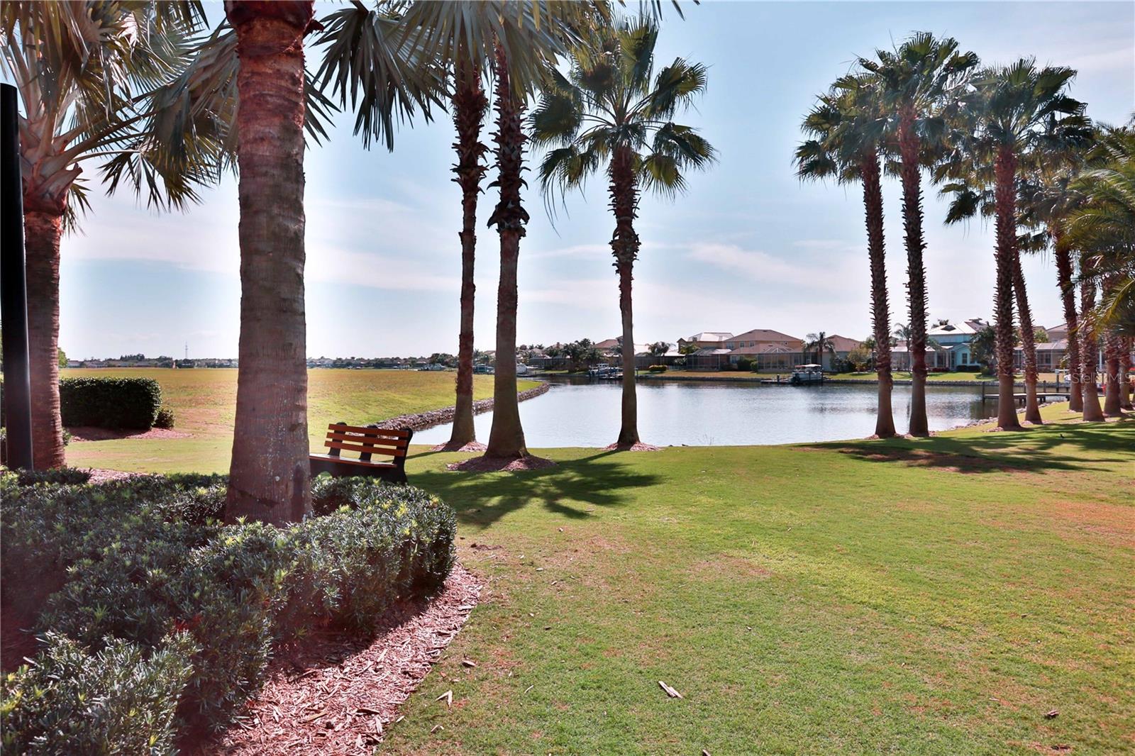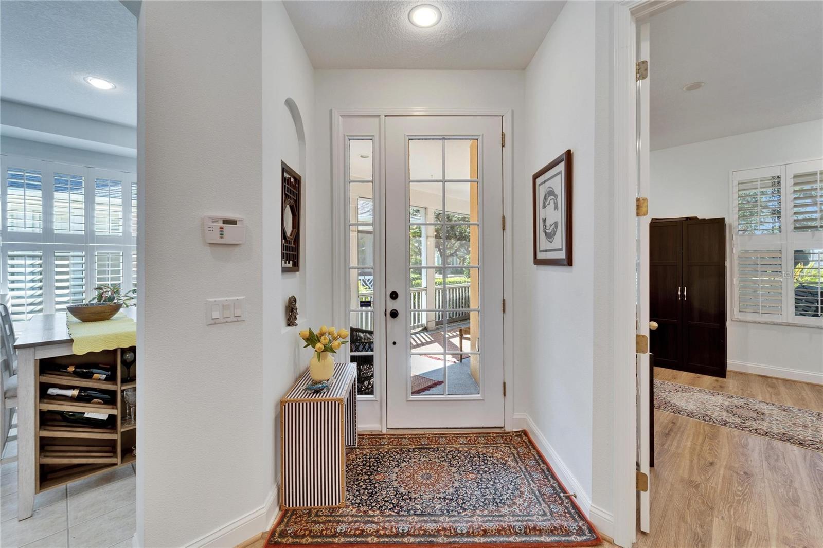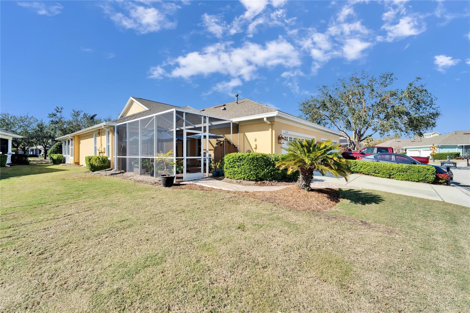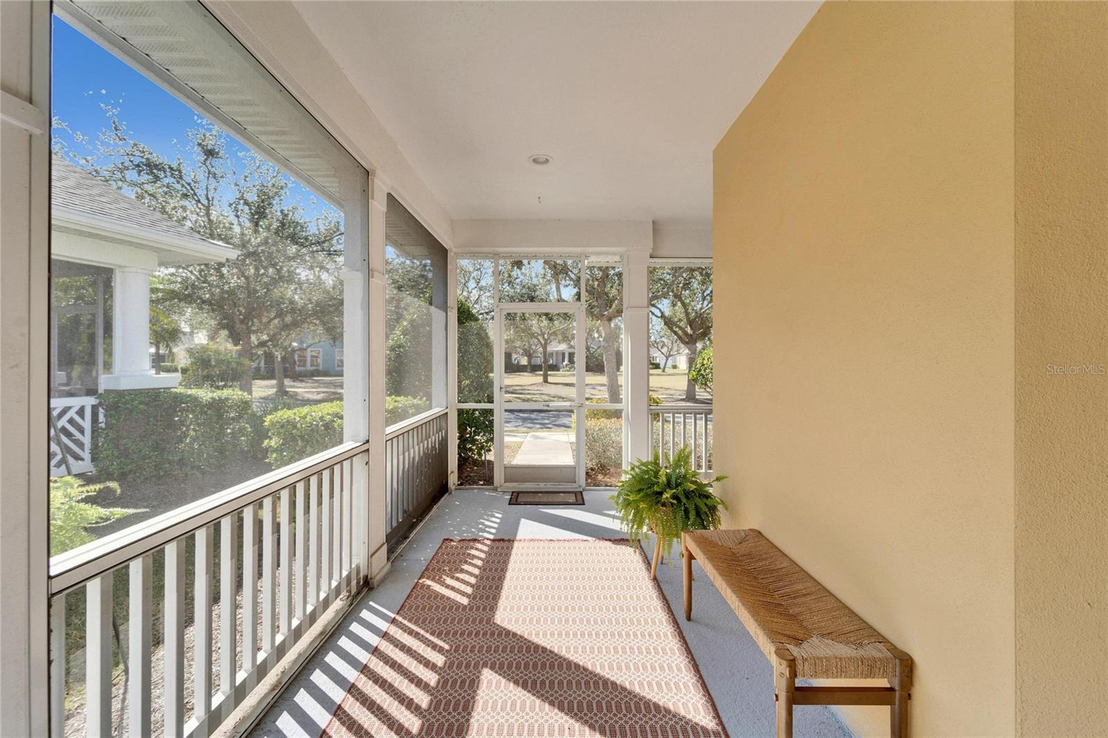 Welcome Home to this MiraBay Villa Home with two bedrooms (split floor plan) plus an Office/Study/Den/Bedroom, two bathrooms & attached two car garage with large screened Lanai and screened front porch. Third bedroom is currently being used as an Office. Features include engineered hardwood floors, plantation shutters, tray ceilings in the Owner’s Suite and Dining Room, garden tub in the main bathroom with split vanity and a large walk-in closet plus a shower, NEW roof 2022, NEW range 2024, NEW washer (2024), NEW microwave (3/2025), NEW frameless shower (Bath 2), freshly painted (white) kitchen cabinets, plantation shutters throughout, engineered hardwood except kitchen and bathrooms and more!! New lanai screening (1/2025). Furnishings optional. Move-in ready so you can start enjoying resort style living in gated MiraBay.